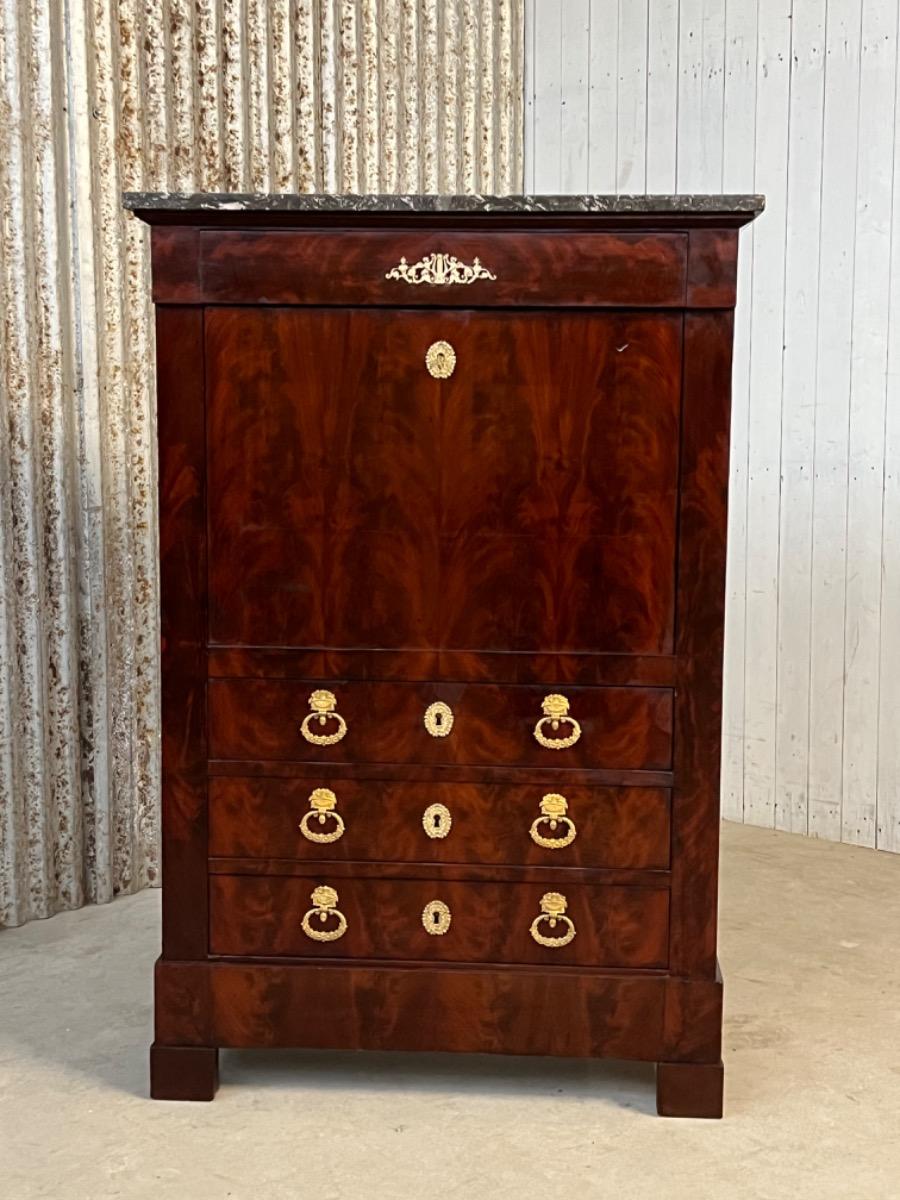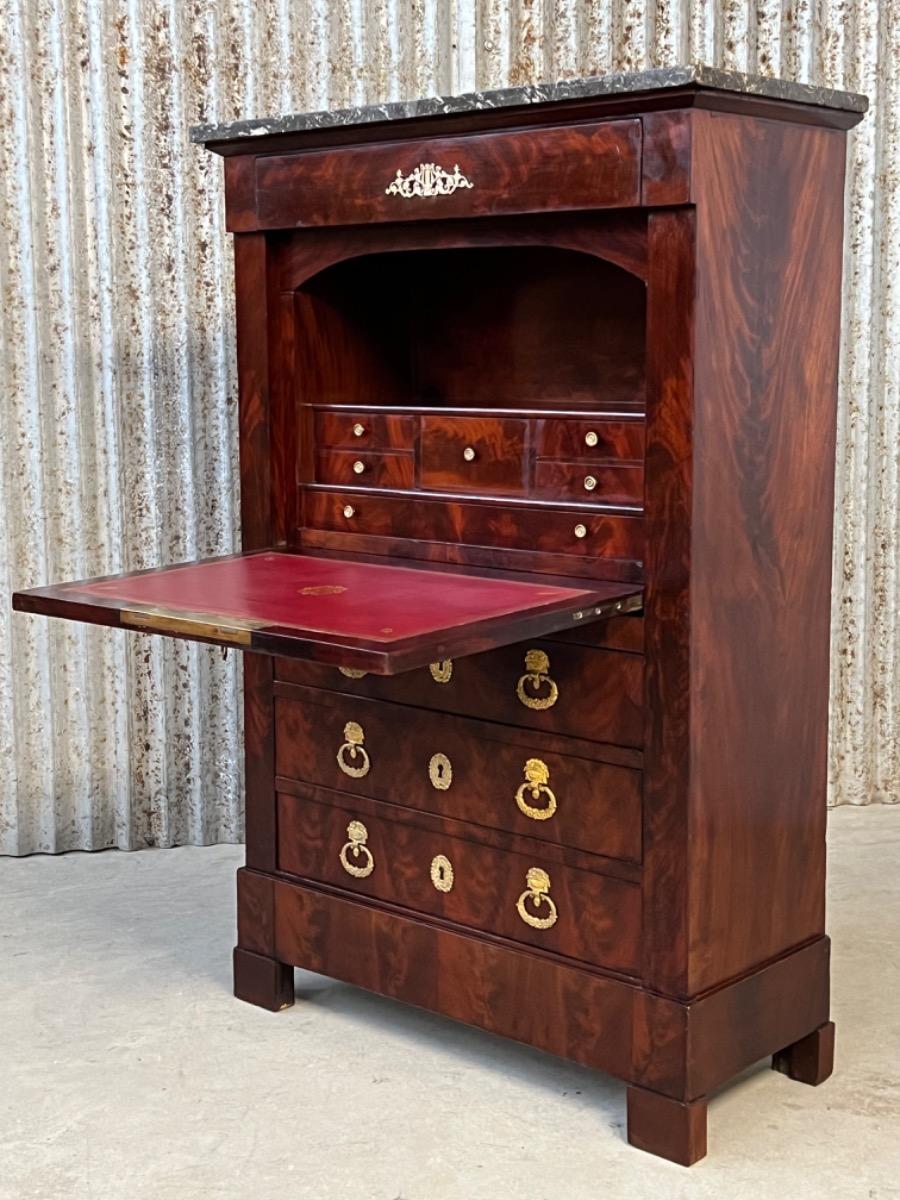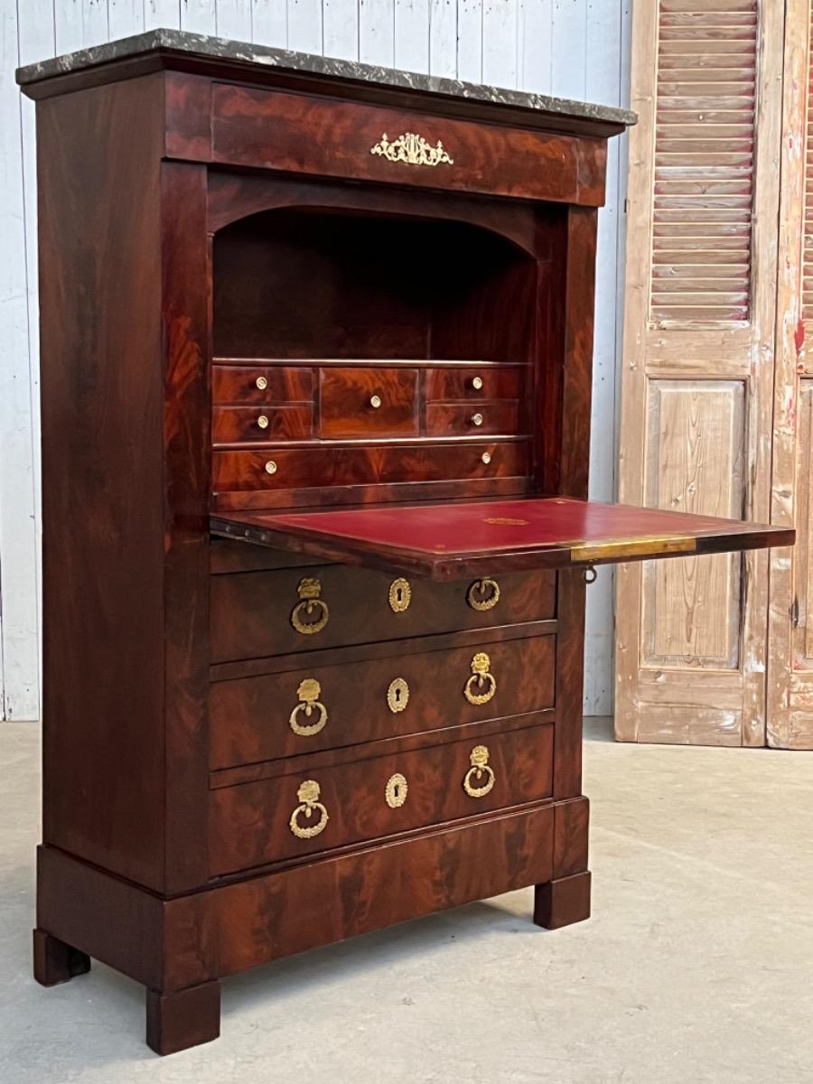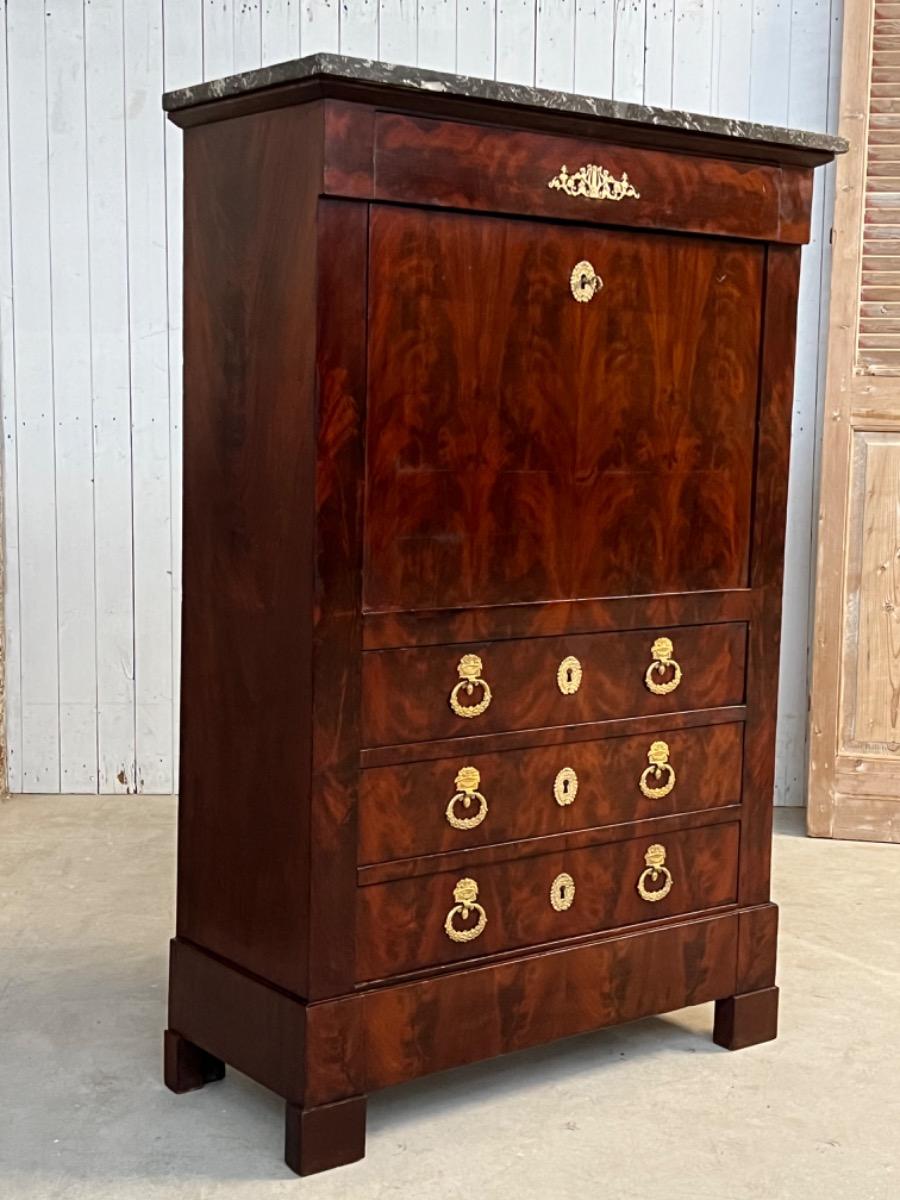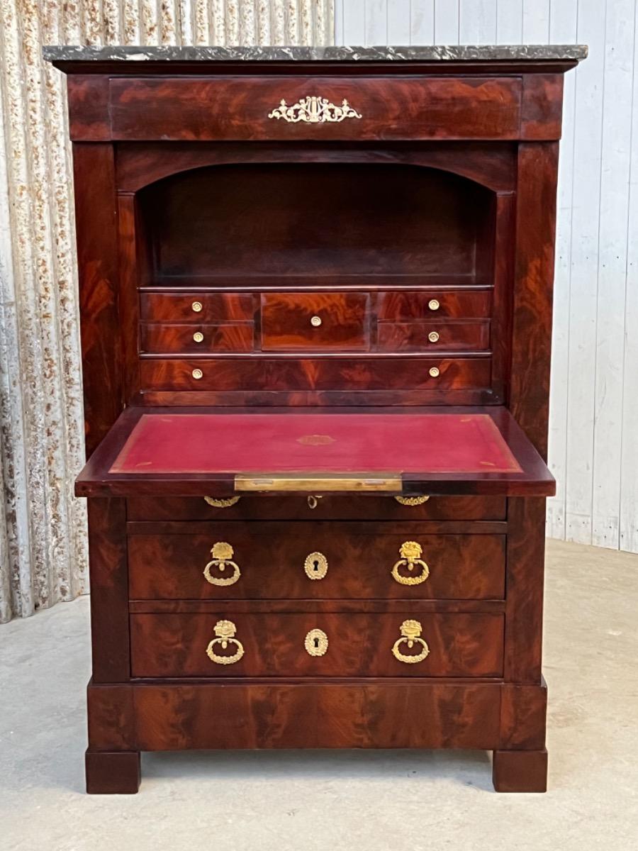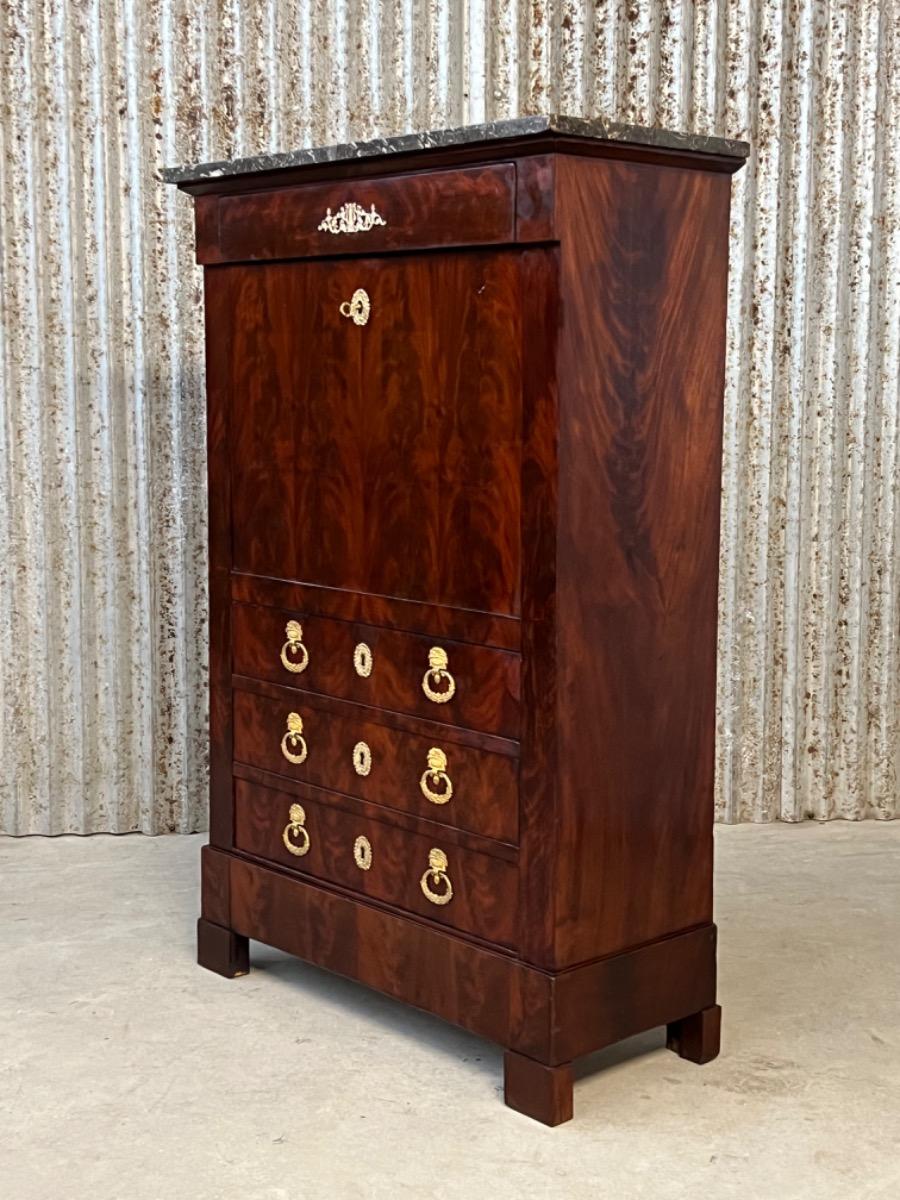Empire secretaire á abattànt, met voluut vormige mahonie pilaar.