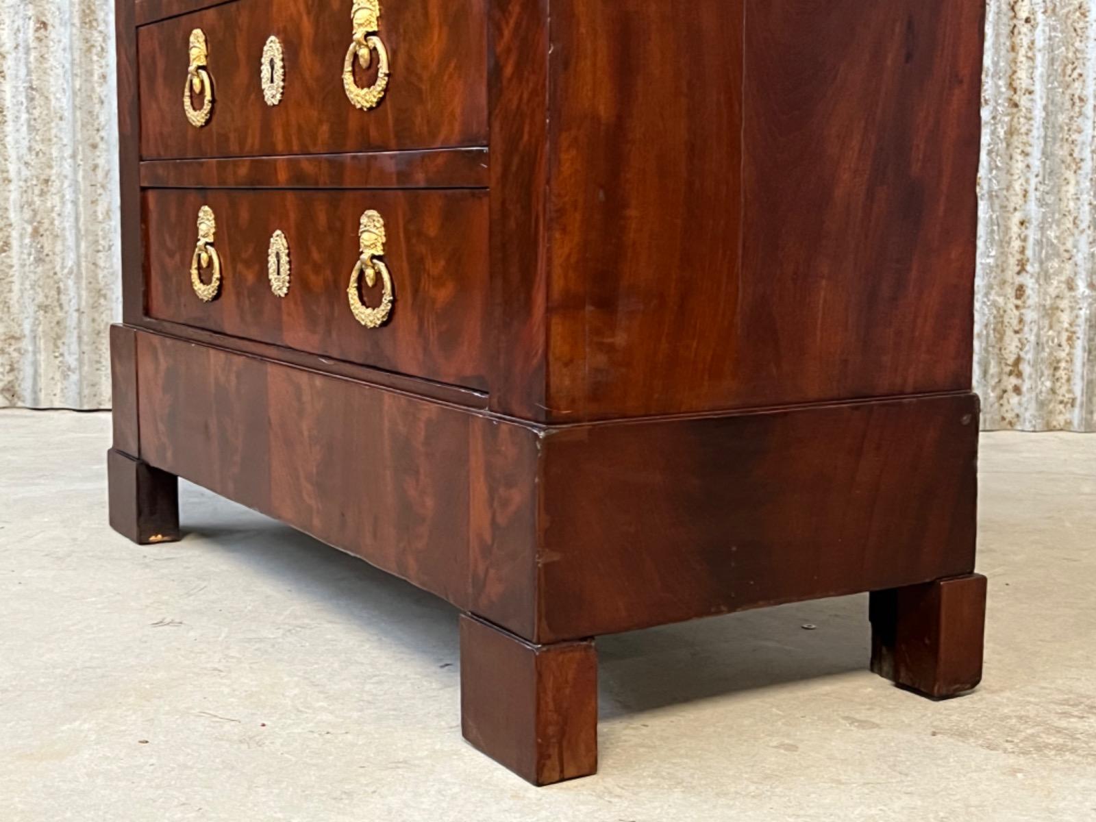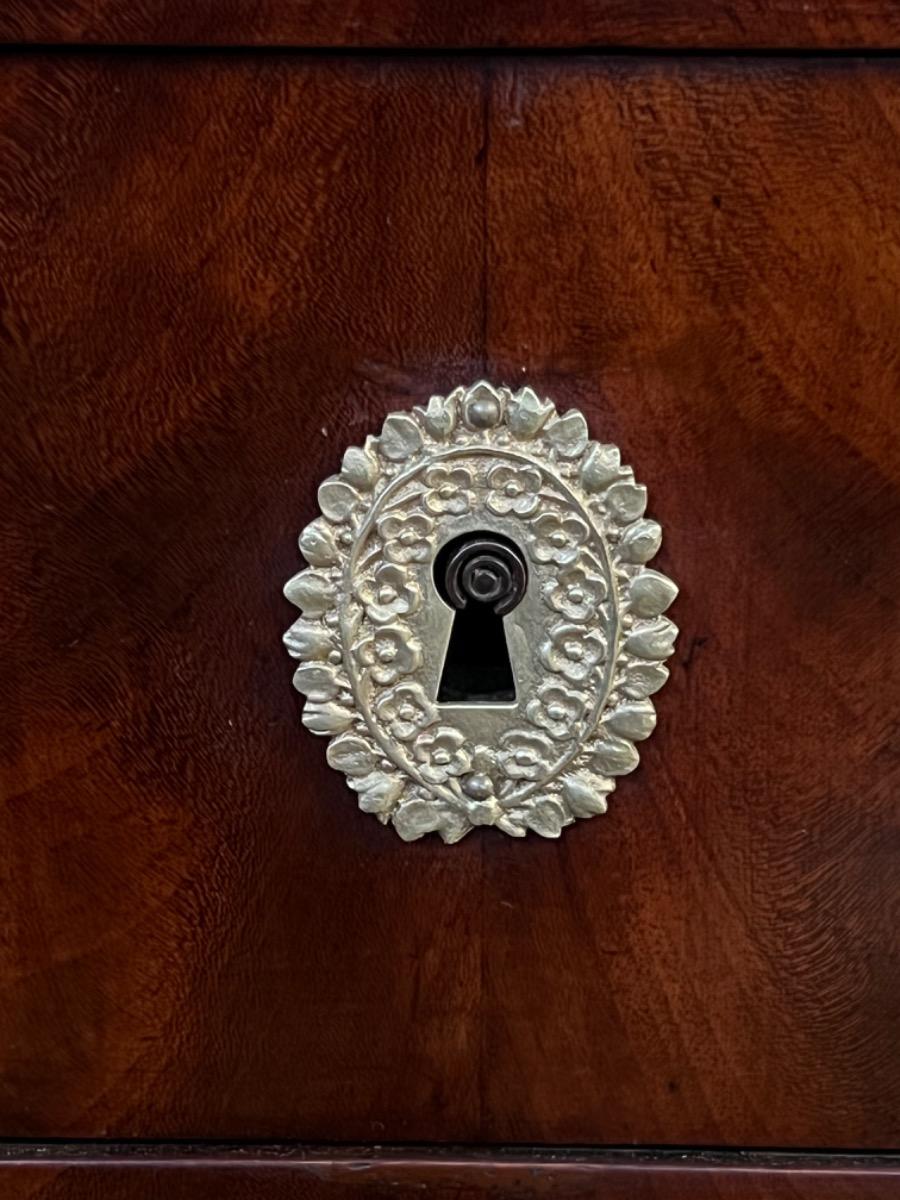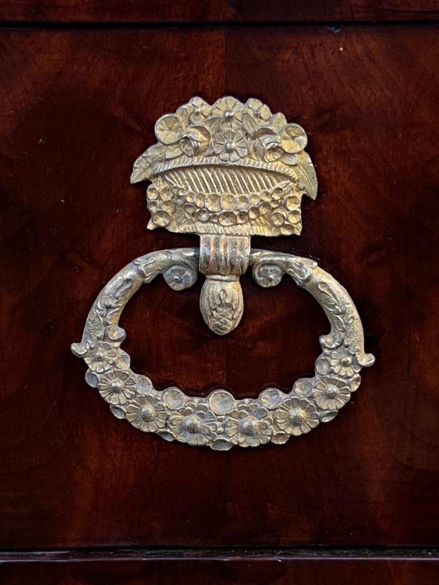 Strak model, zeer fraai boek bloem mahonie gefineerd. overstekende kap lade met veel vuur verguld beslag.