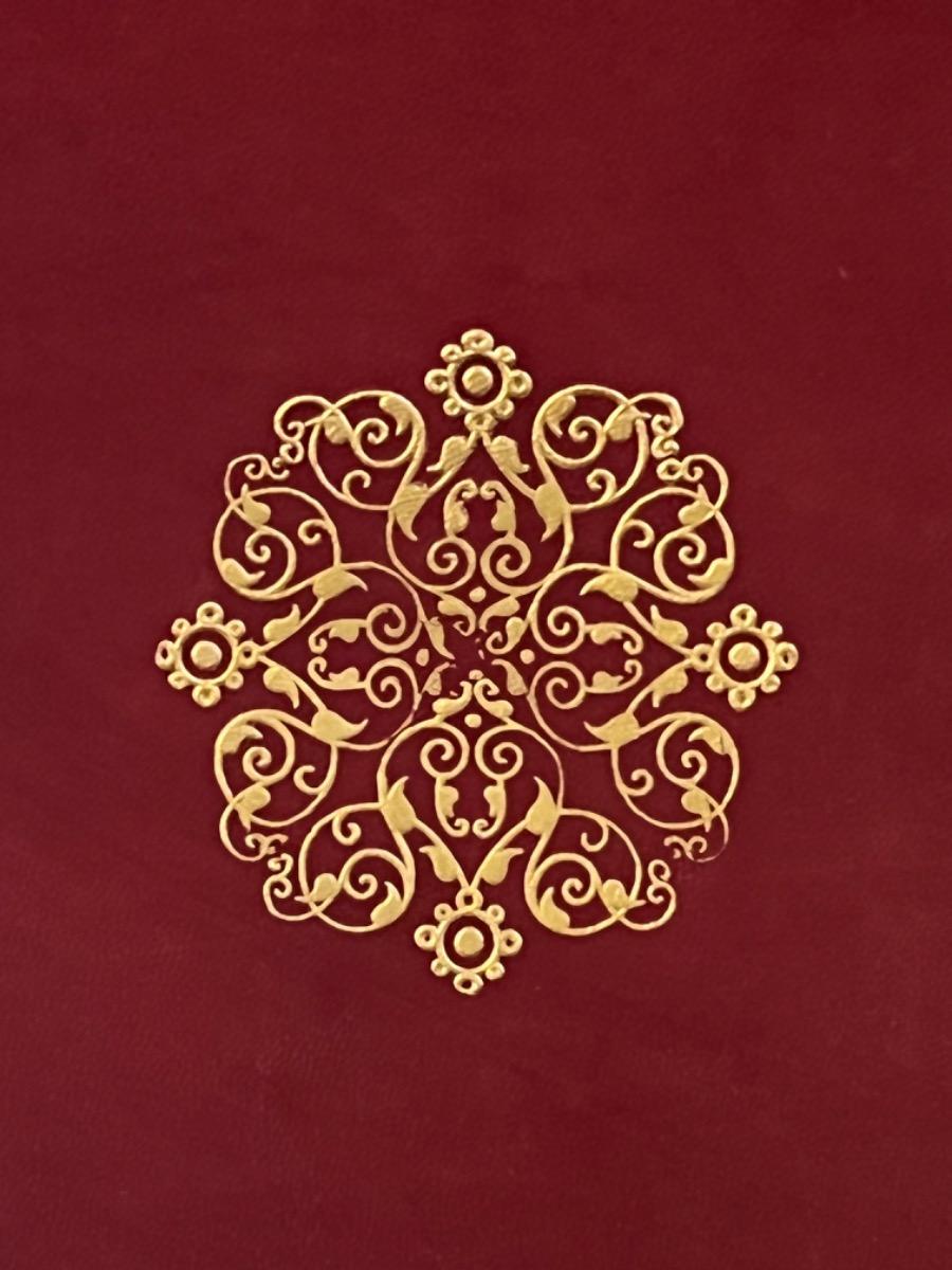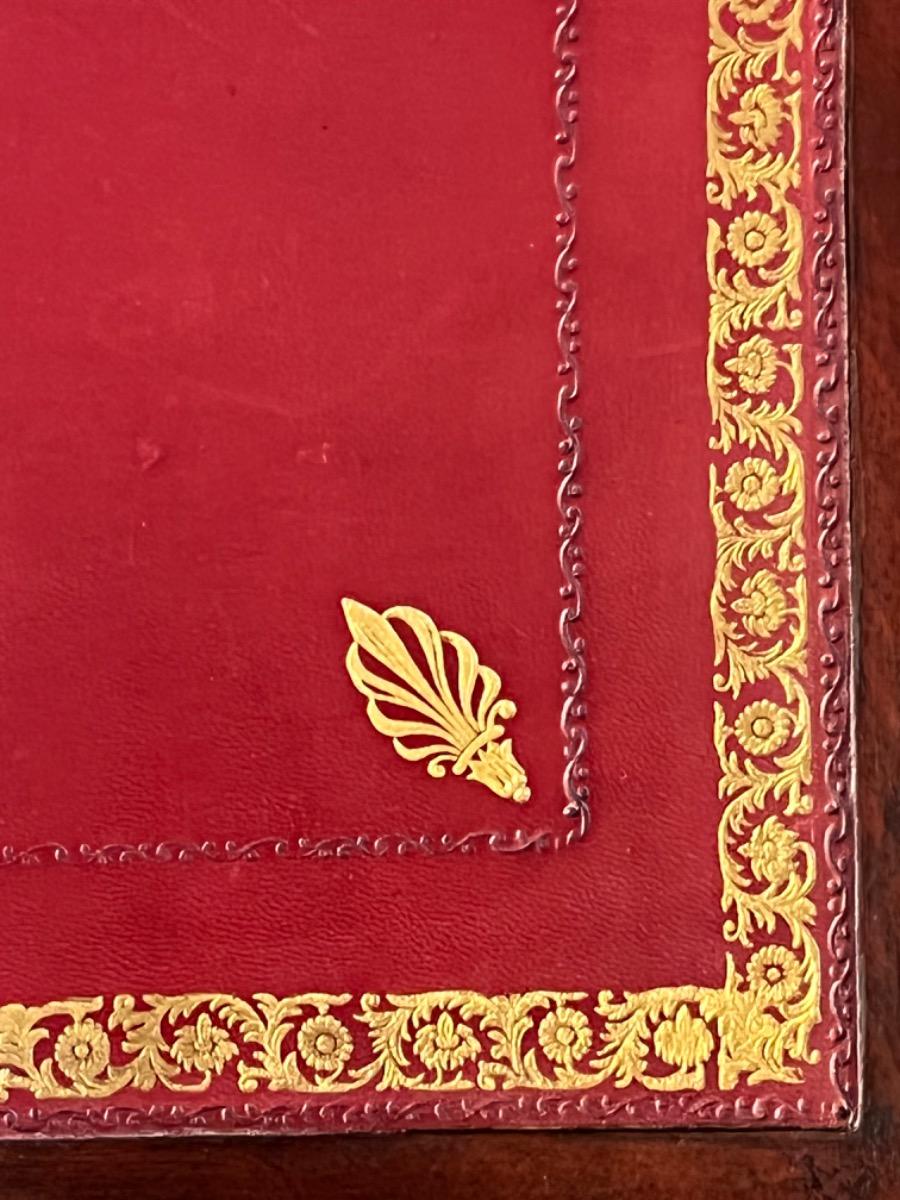 De klep is ingelegd met ossenbloed roodkalfsleder, met vergulde biezen.
