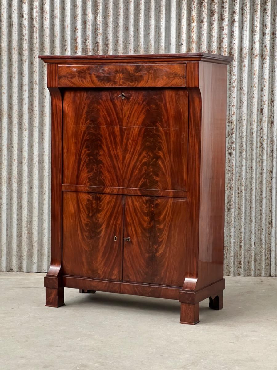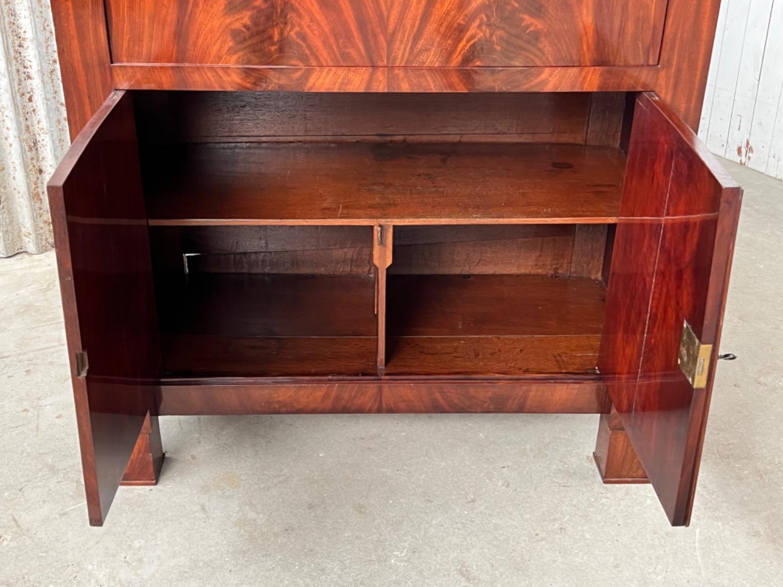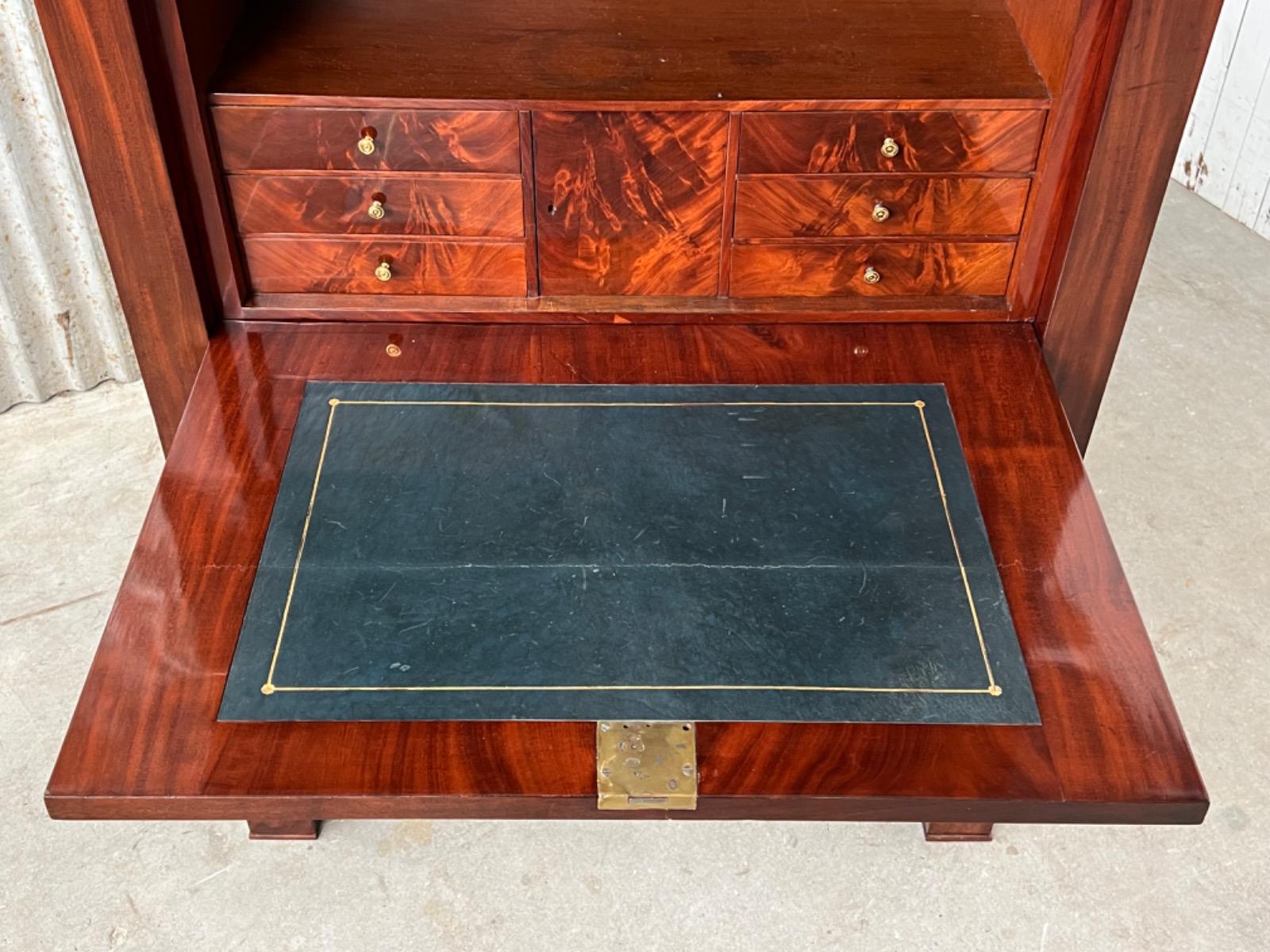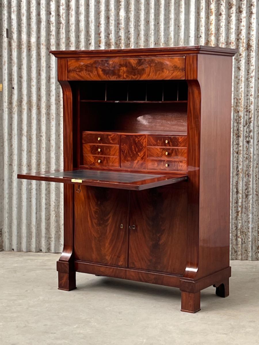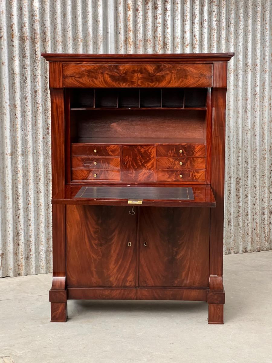 Laat Empire klep secretaire met overstekende kap lade. Vlakke klep en deuren op blokpoot.