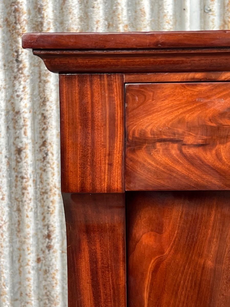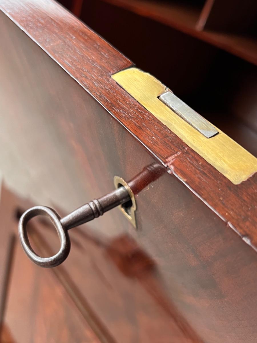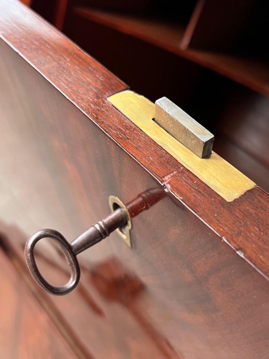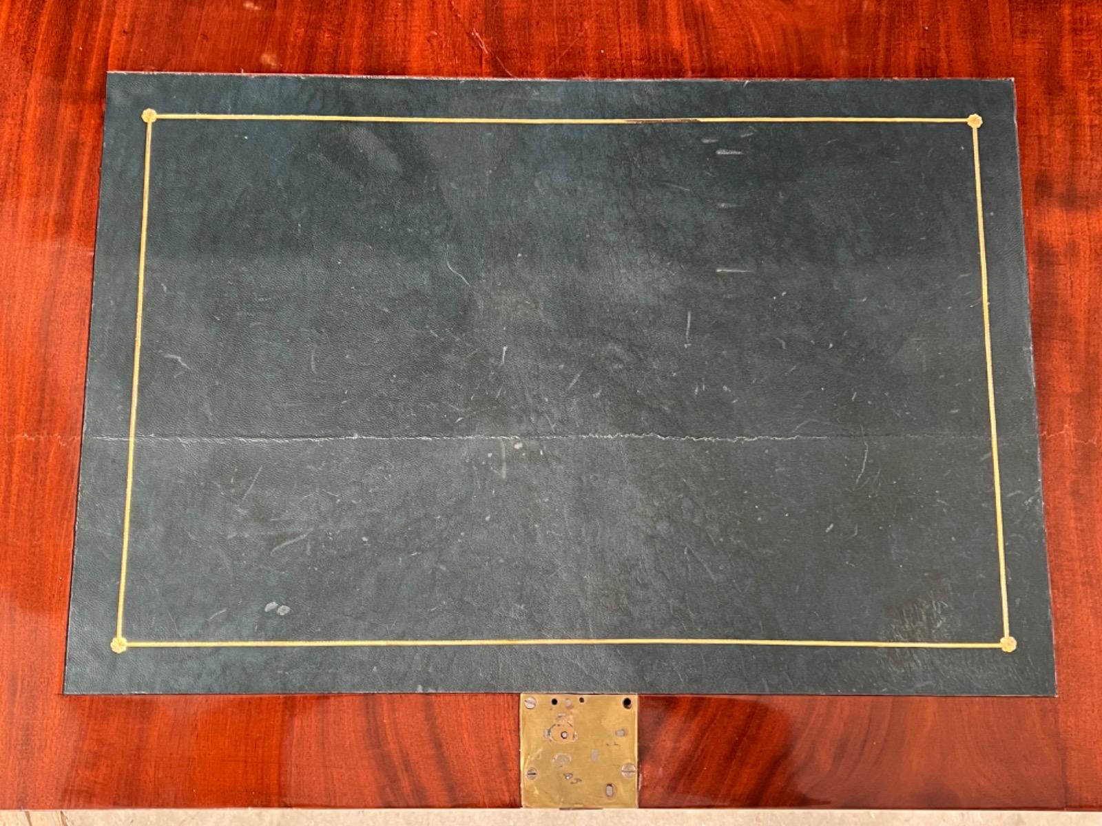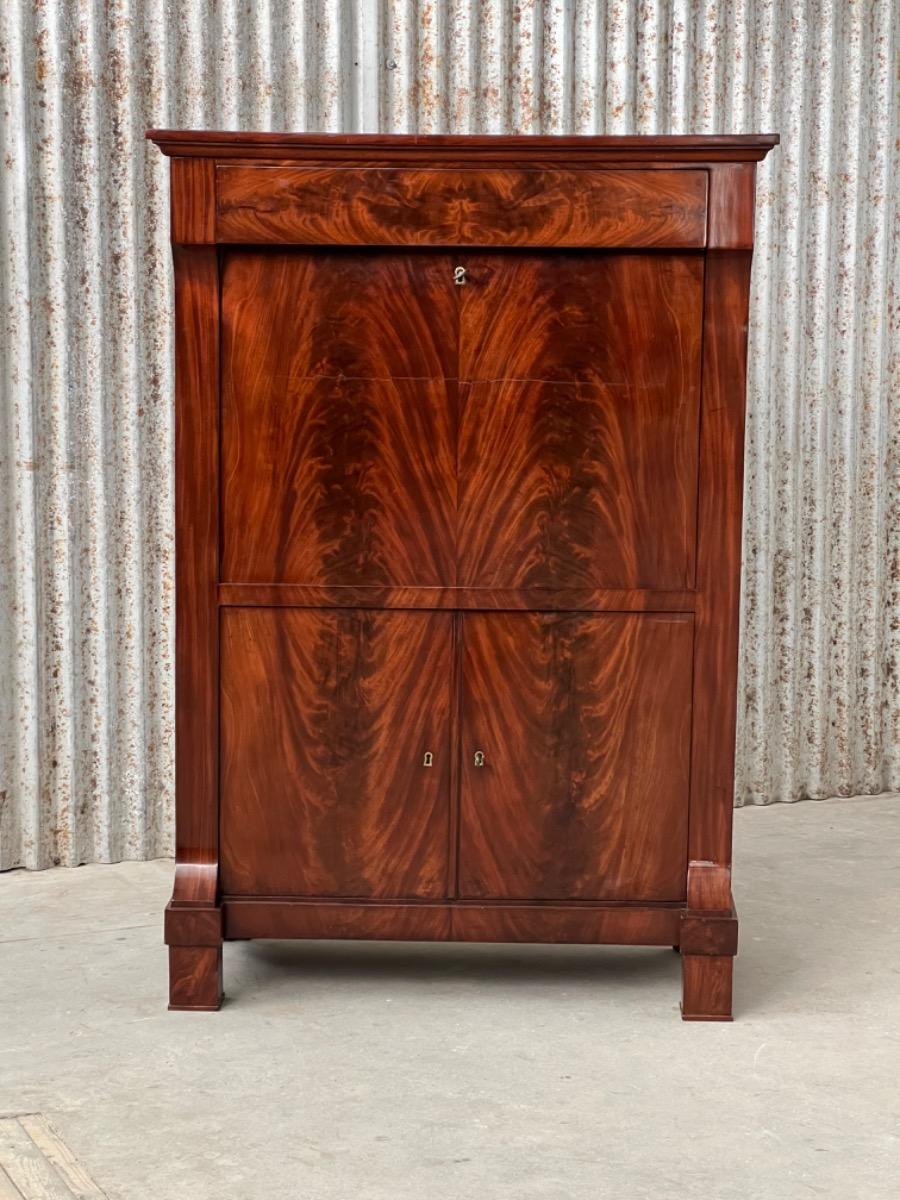 Laat Empire klep secretaire met overstekende kap lade. Vlakke klep en deuren op blokpoot.