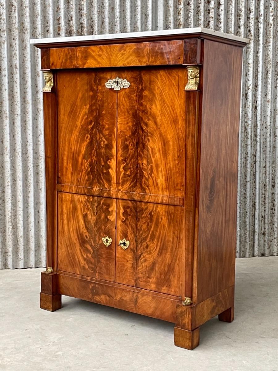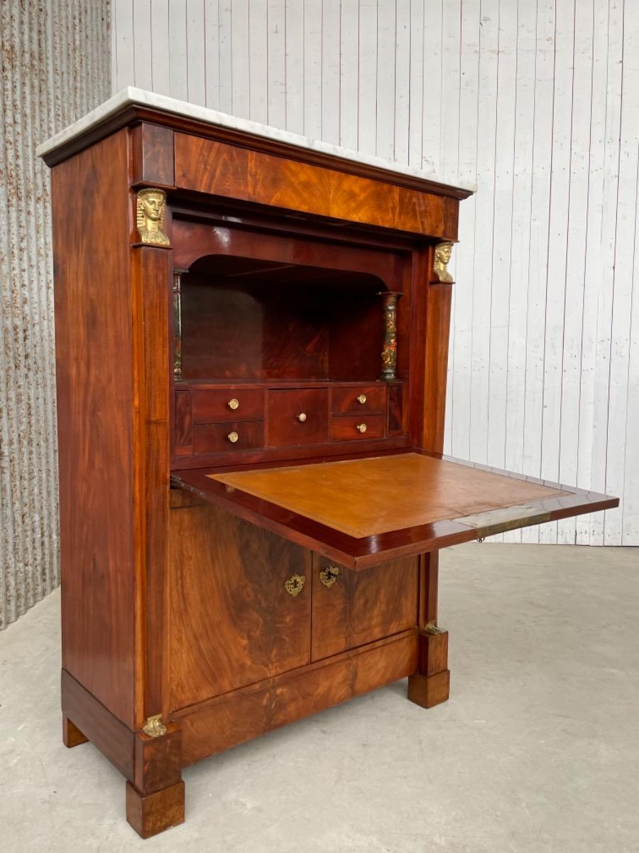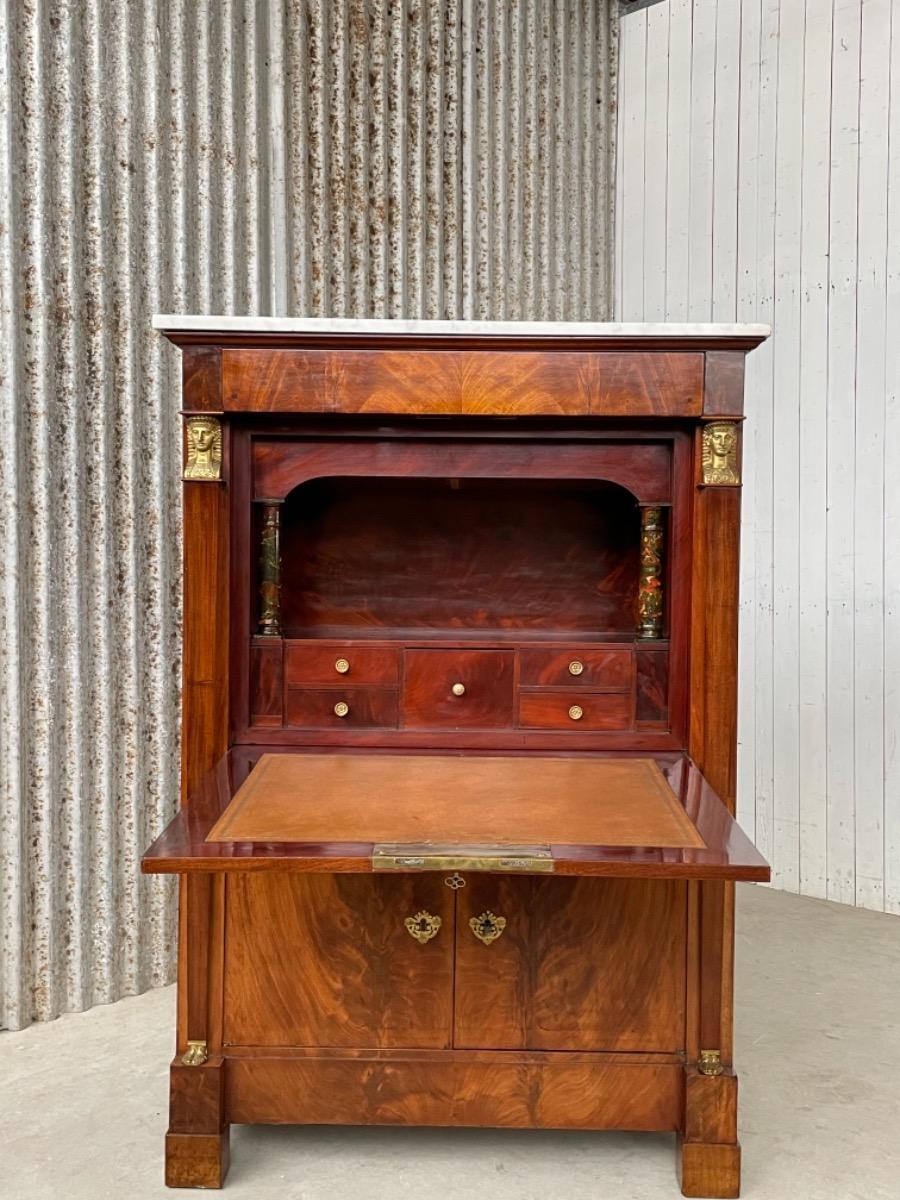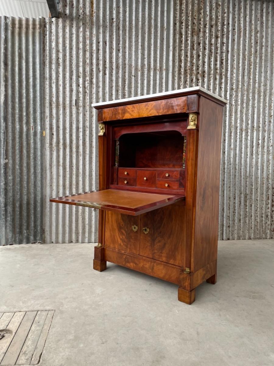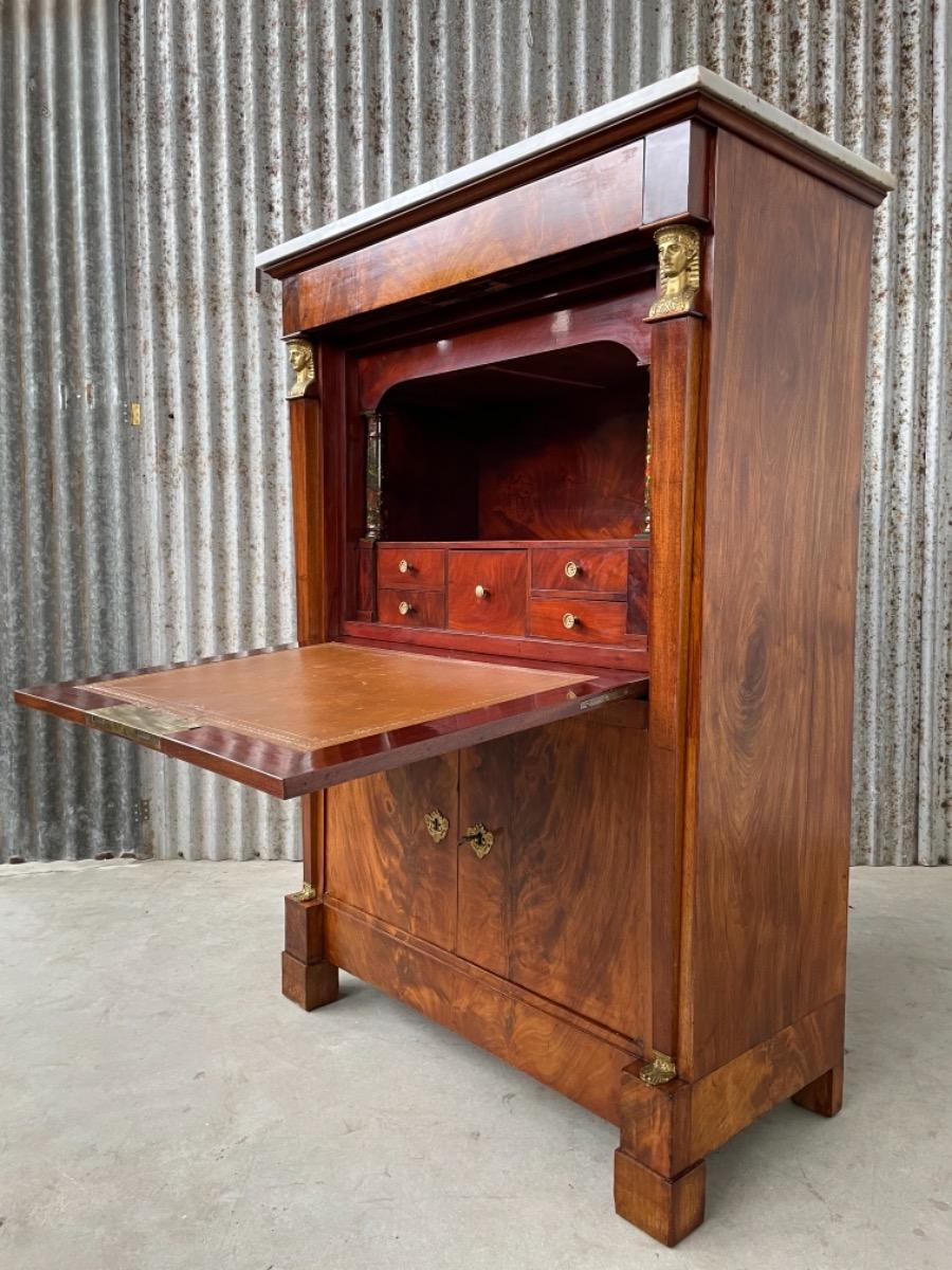 Belgisch empire stijl secretaire, bloem mahonie met bianca Carrara marmer. Messing kariatiden en schild beslag. Sloten en sleutels werkend. Geen scheuren in de zijden, deuren of klep. Afm; H 148 cm. B 97 - 104 cm. D 42 - 50 cm. Sec-2307~