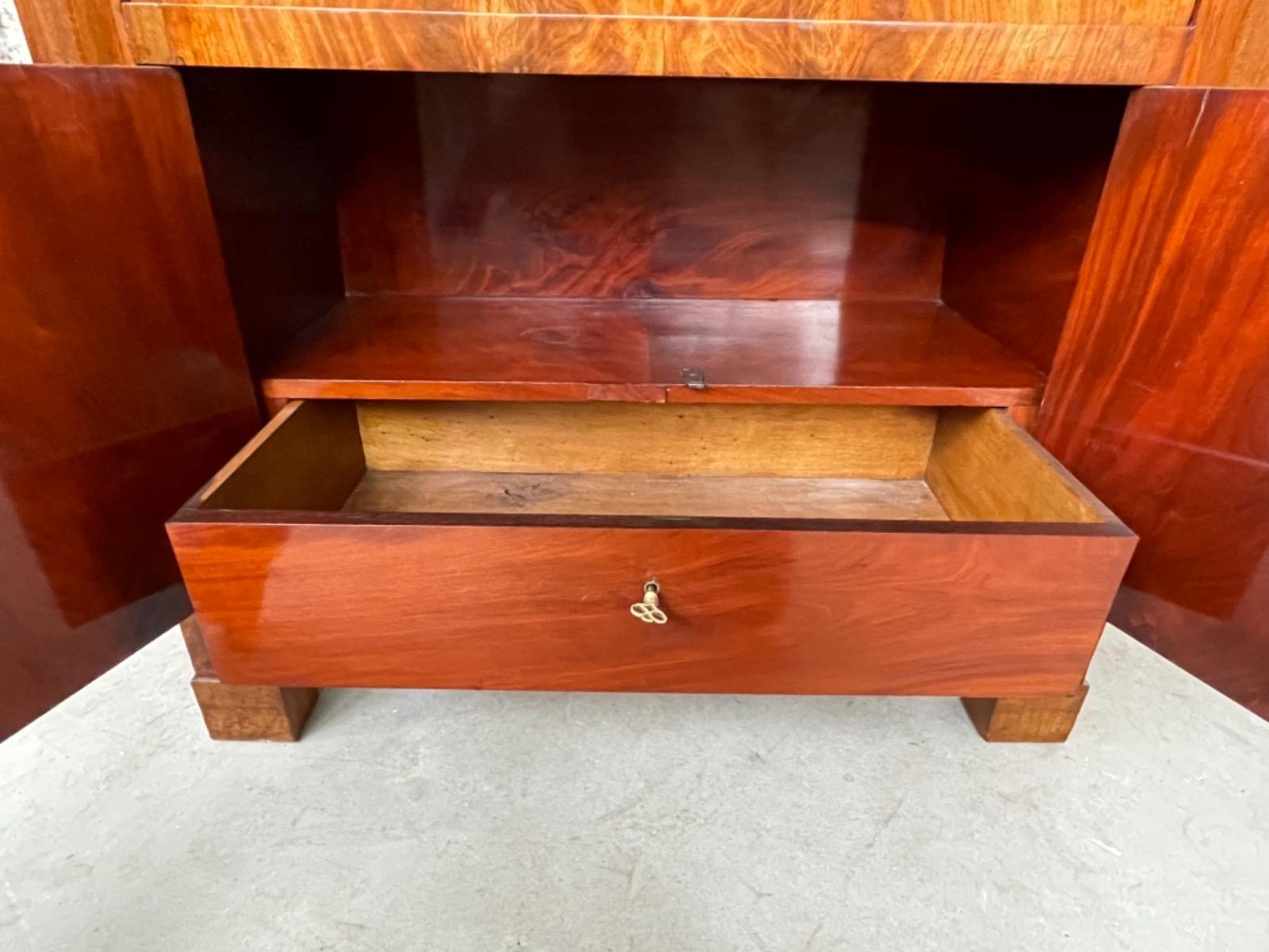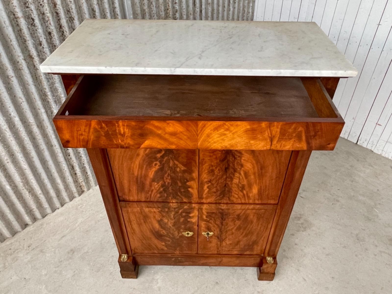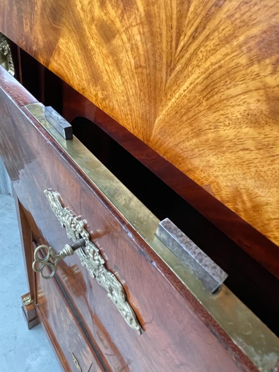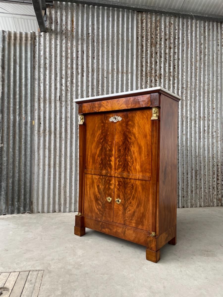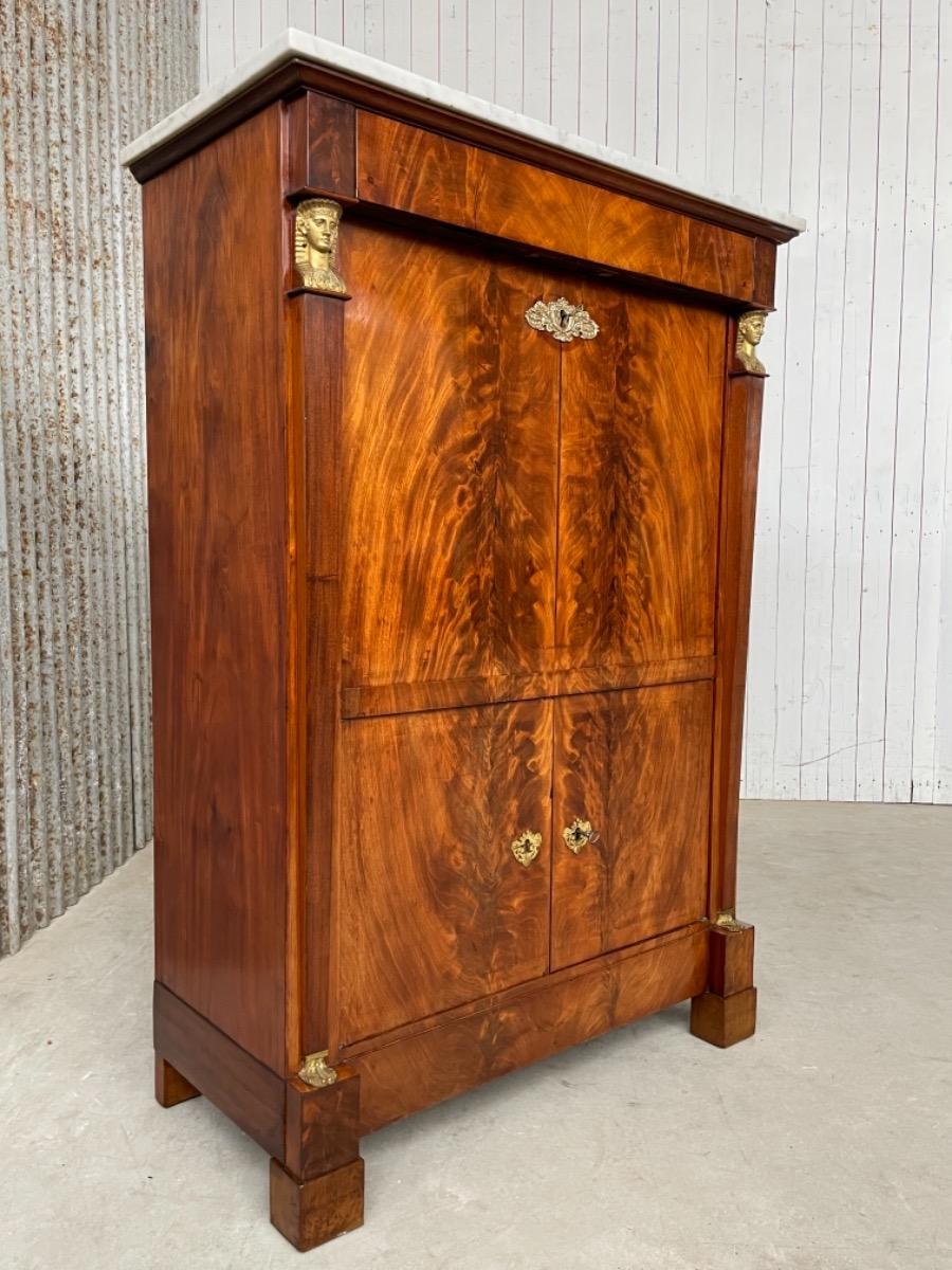 Belgisch empire stijl secretaire, bloem mahonie met bianca Carrara marmer. Messing kariatiden en schild beslag. Sloten en sleutels werkend. Geen scheuren in de zijden, deuren of klep. Afm; H 148 cm. B 97 - 104 cm. D 42 - 50 cm. Sec-2307~
