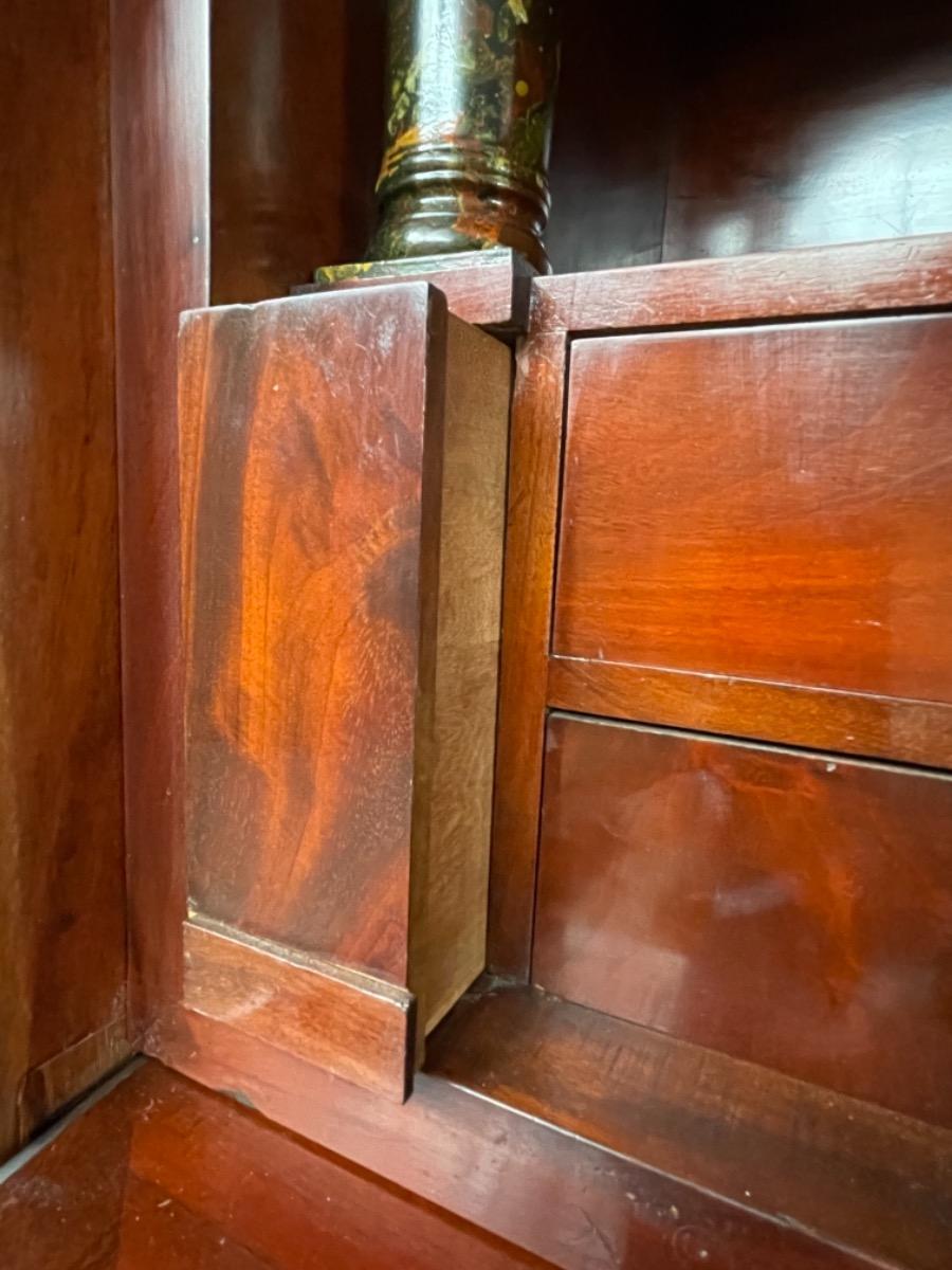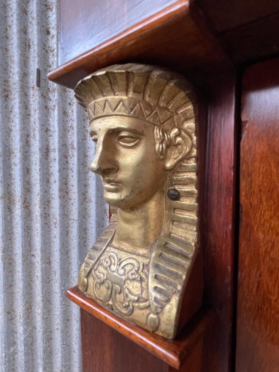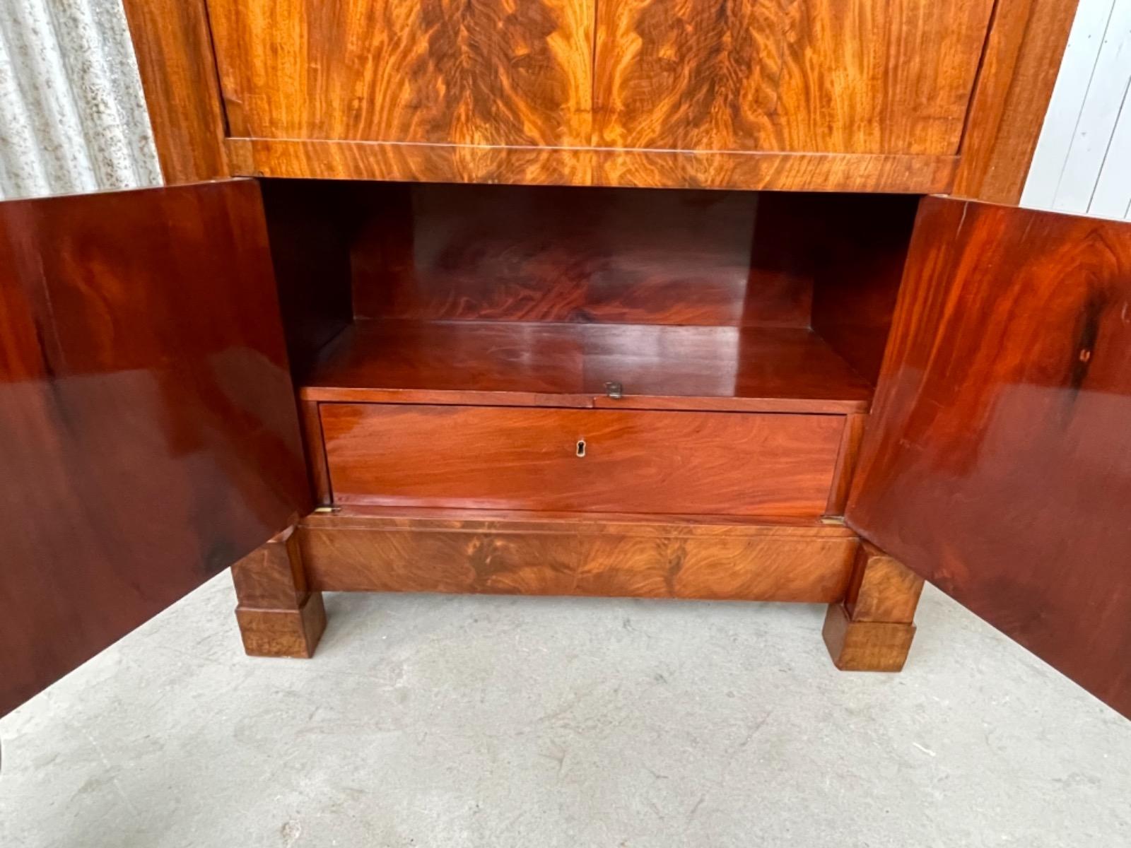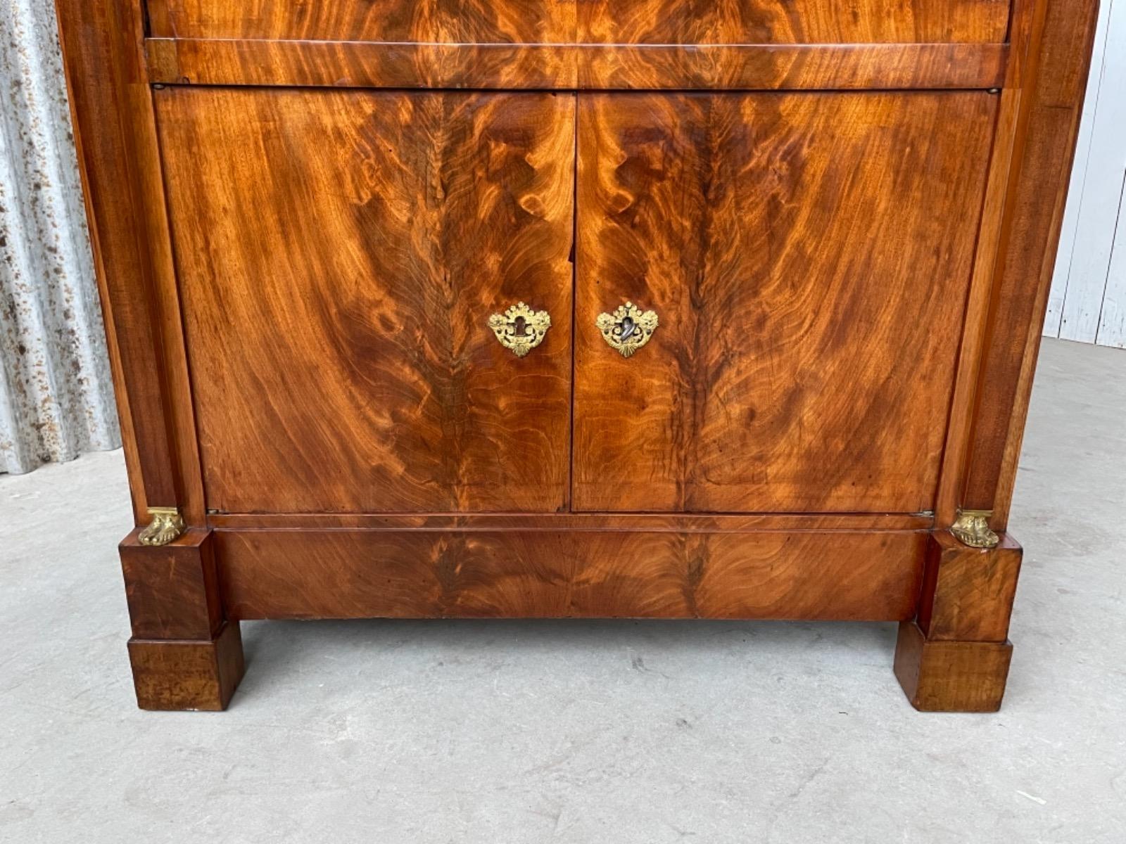 Belgisch empire stijl secretaire, bloem mahonie met bianca Carrara marmer. Messing kariatiden en schild beslag. Sloten en sleutels werkend. Geen scheuren in de zijden, deuren of klep. Afm; H 148 cm. B 97 - 104 cm. D 42 - 50 cm. Sec-2307~