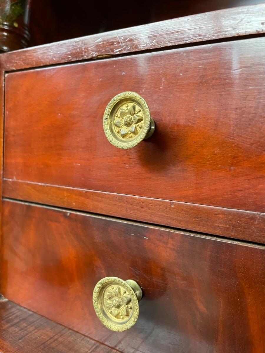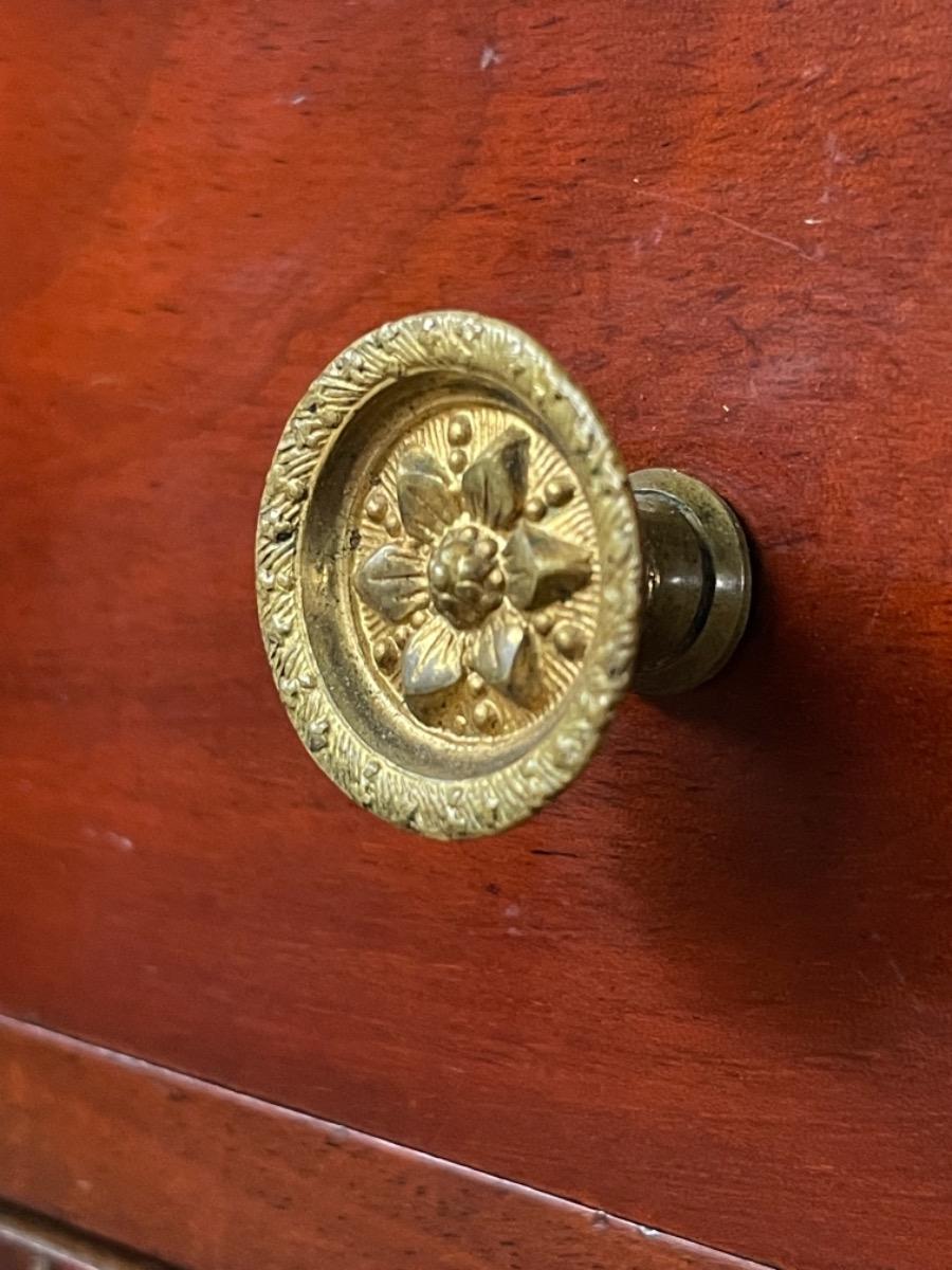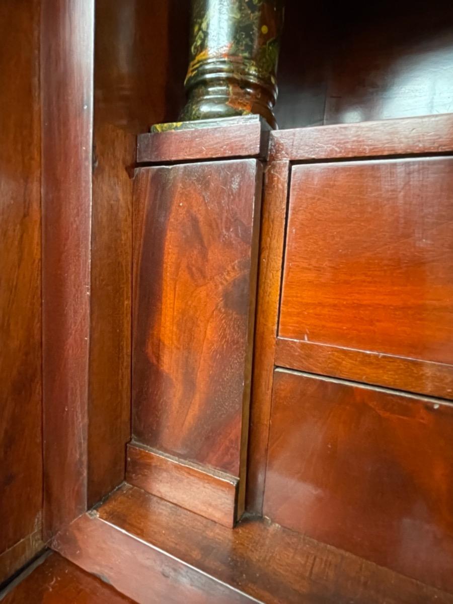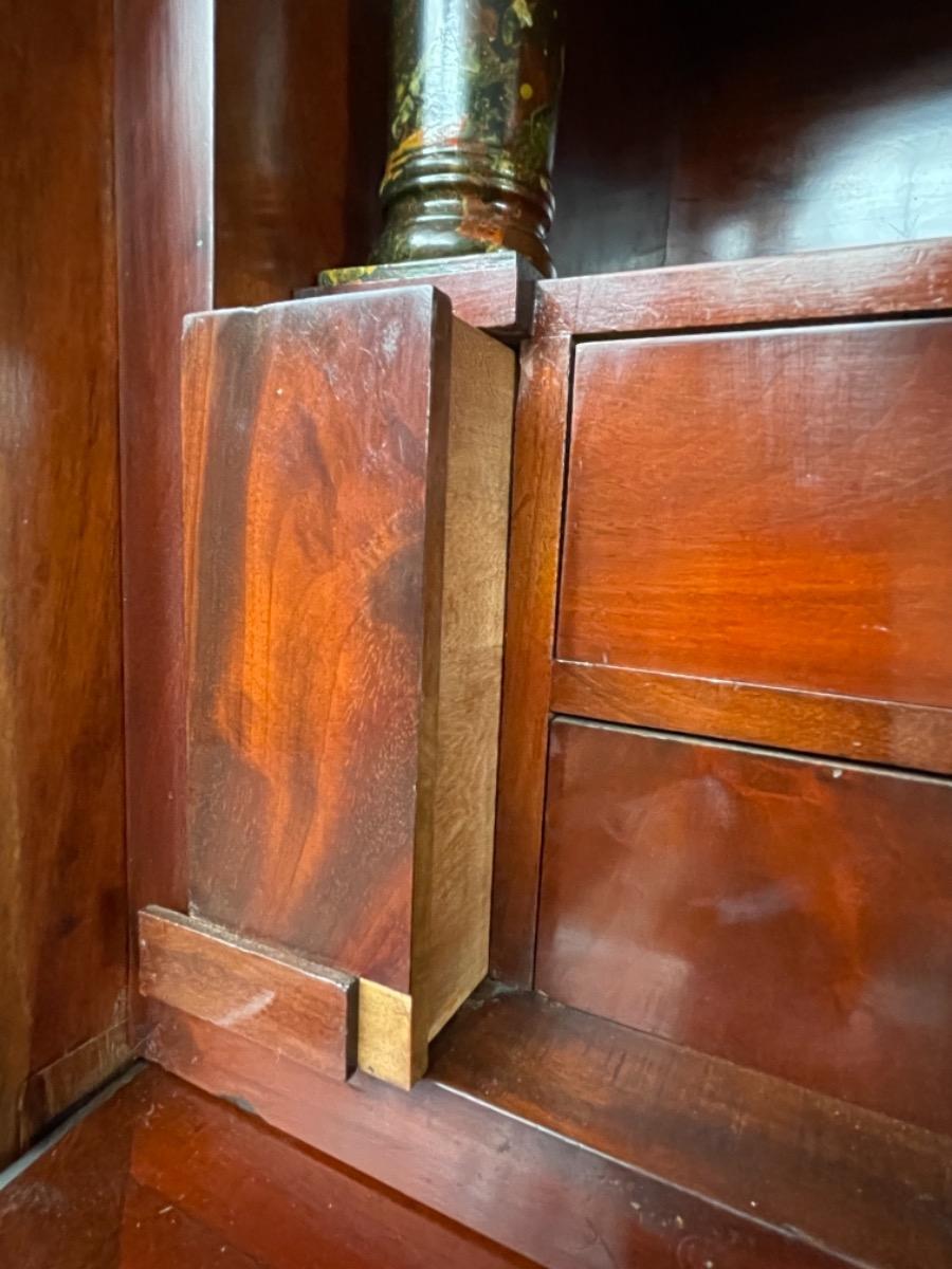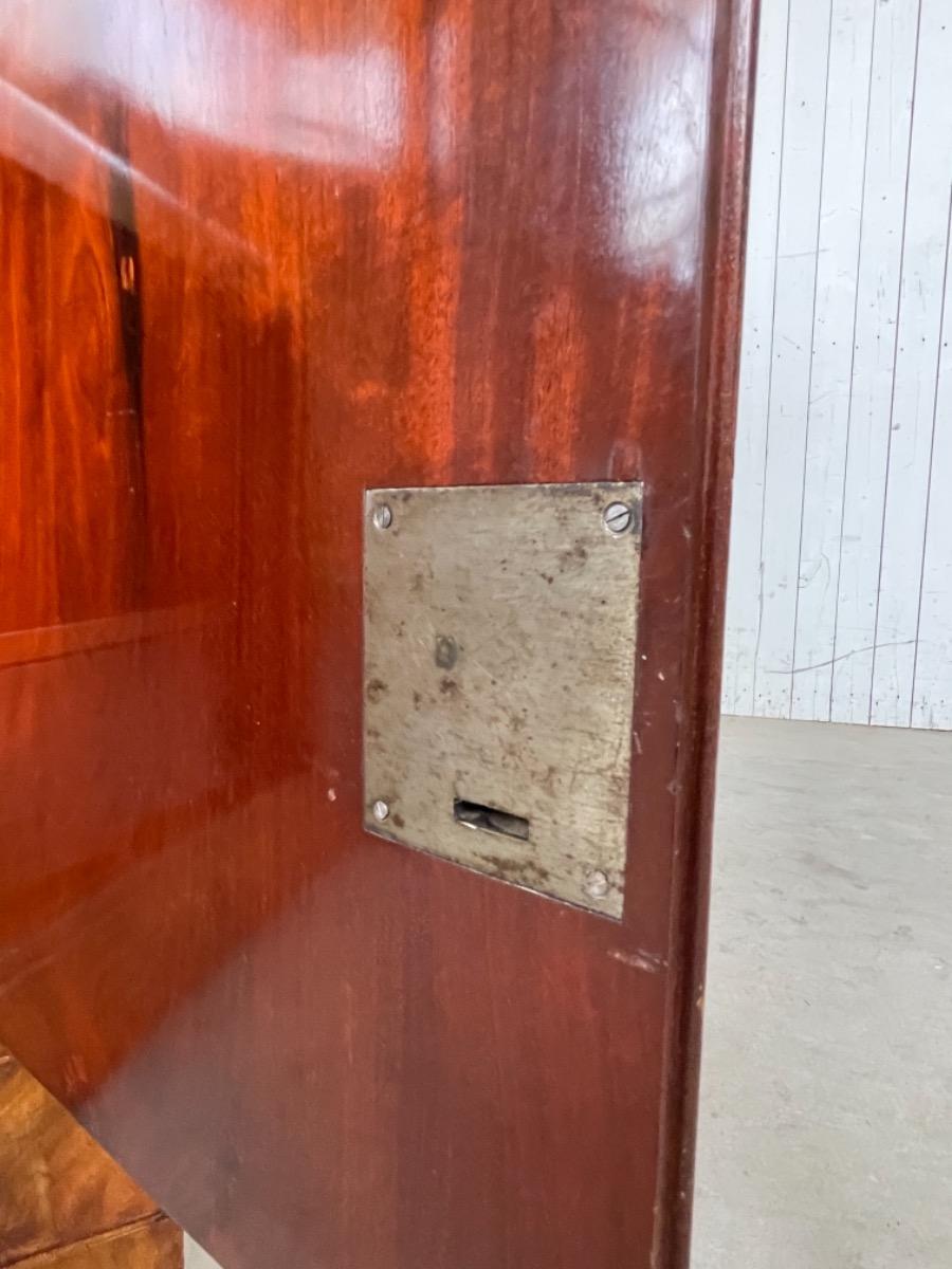 Belgisch empire stijl secretaire, bloem mahonie met bianca Carrara marmer. Messing kariatiden en schild beslag. Sloten en sleutels werkend. Geen scheuren in de zijden, deuren of klep. Afm; H 148 cm. B 97 - 104 cm. D 42 - 50 cm. Sec-2307~