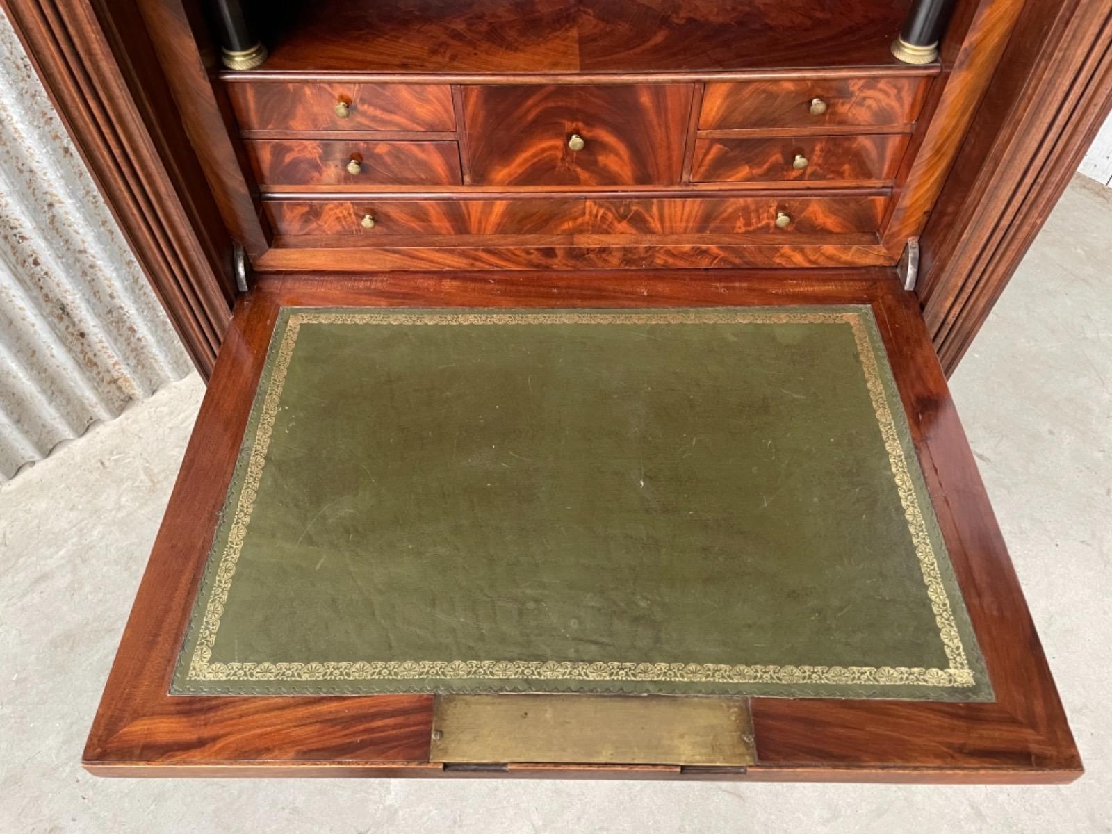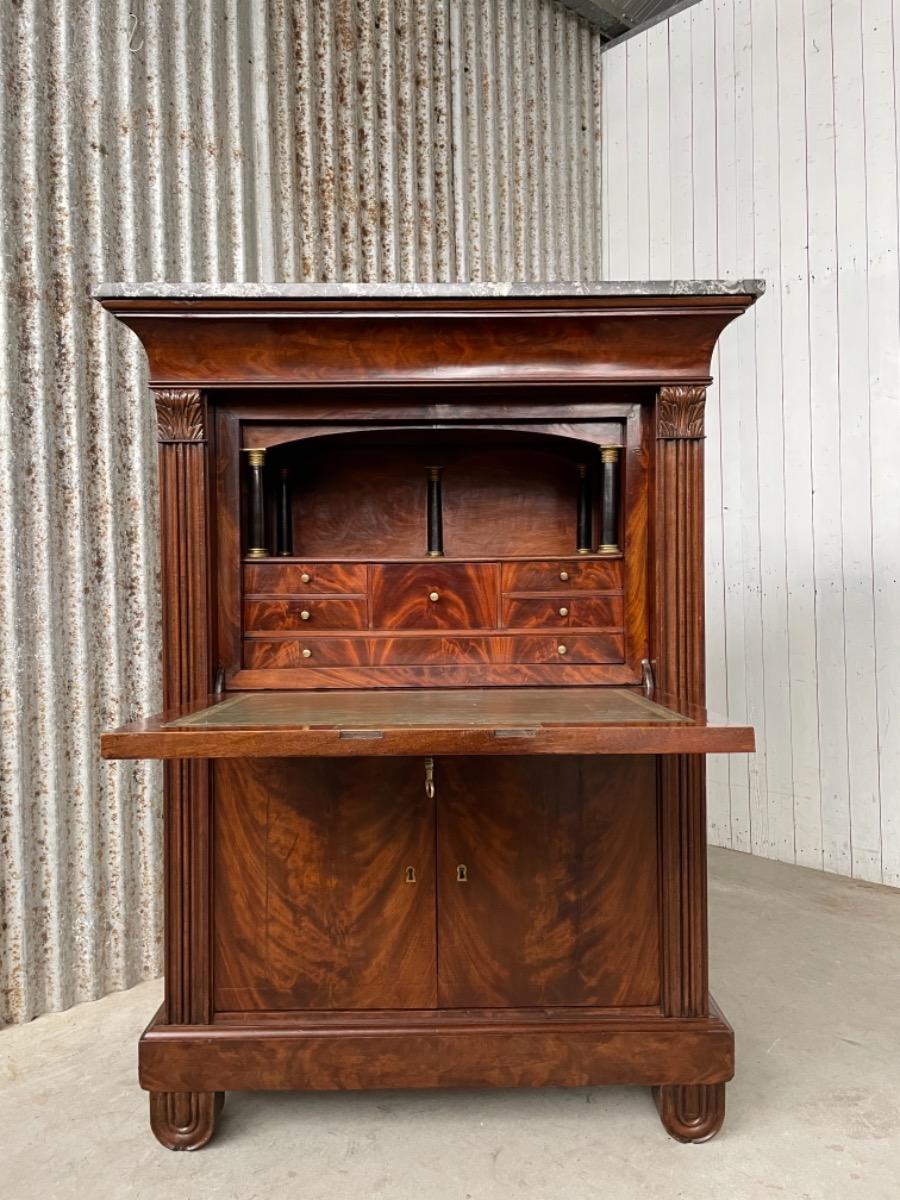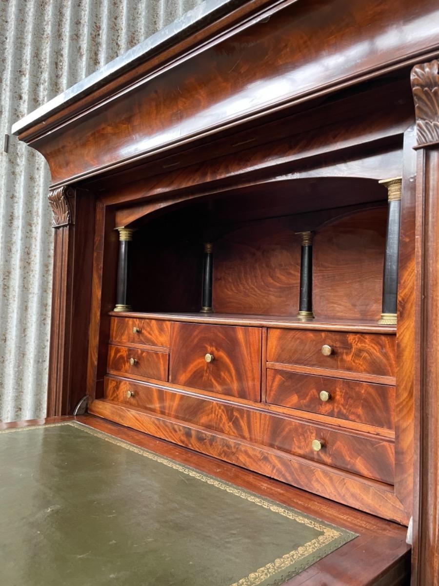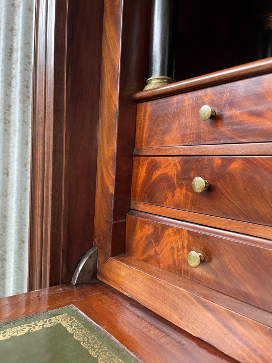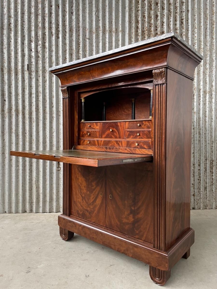 Mahonie secretaire, in gelegd met goud omboest leder. Pilaren in interrieur, marmer gedekt. Lade met slot achter de deurtjes in onderkast.
