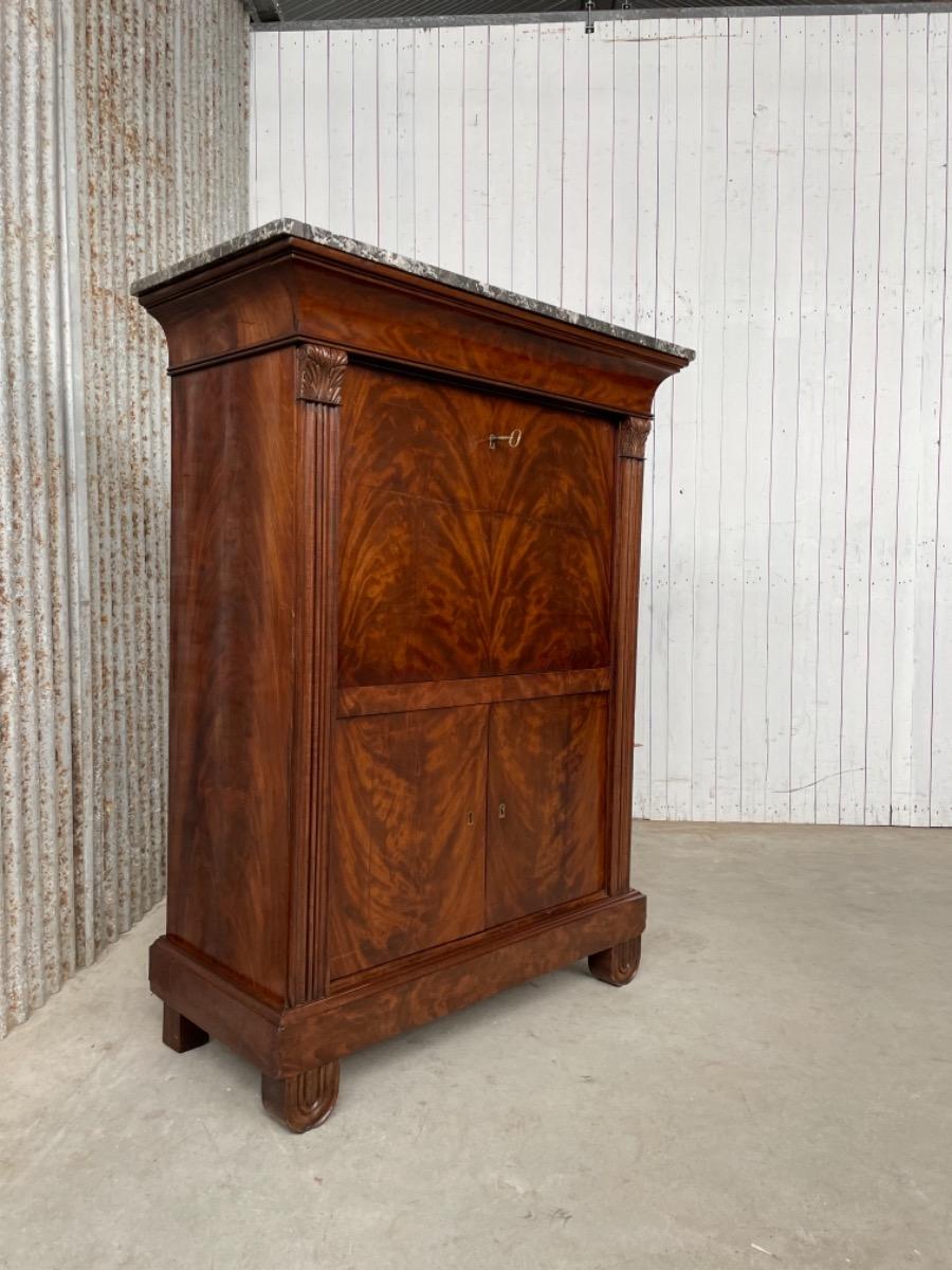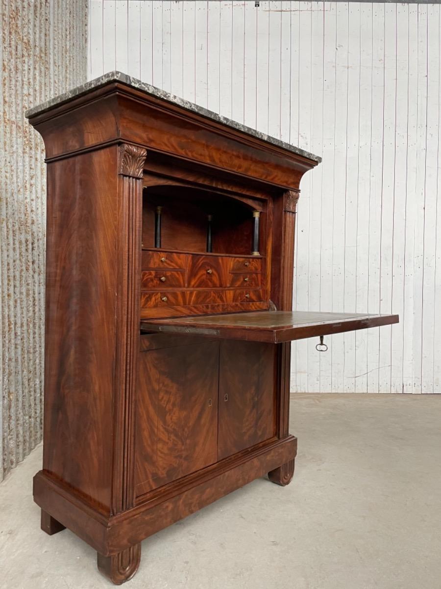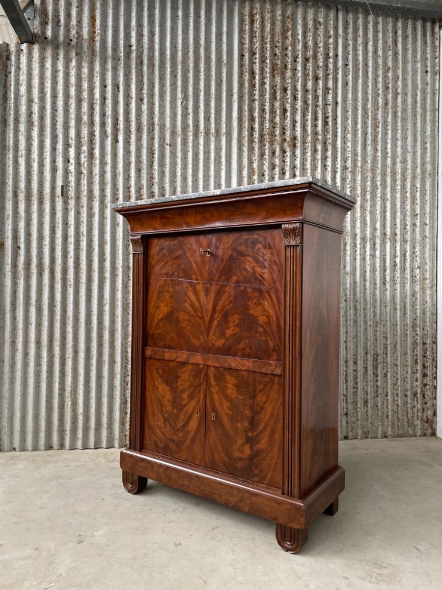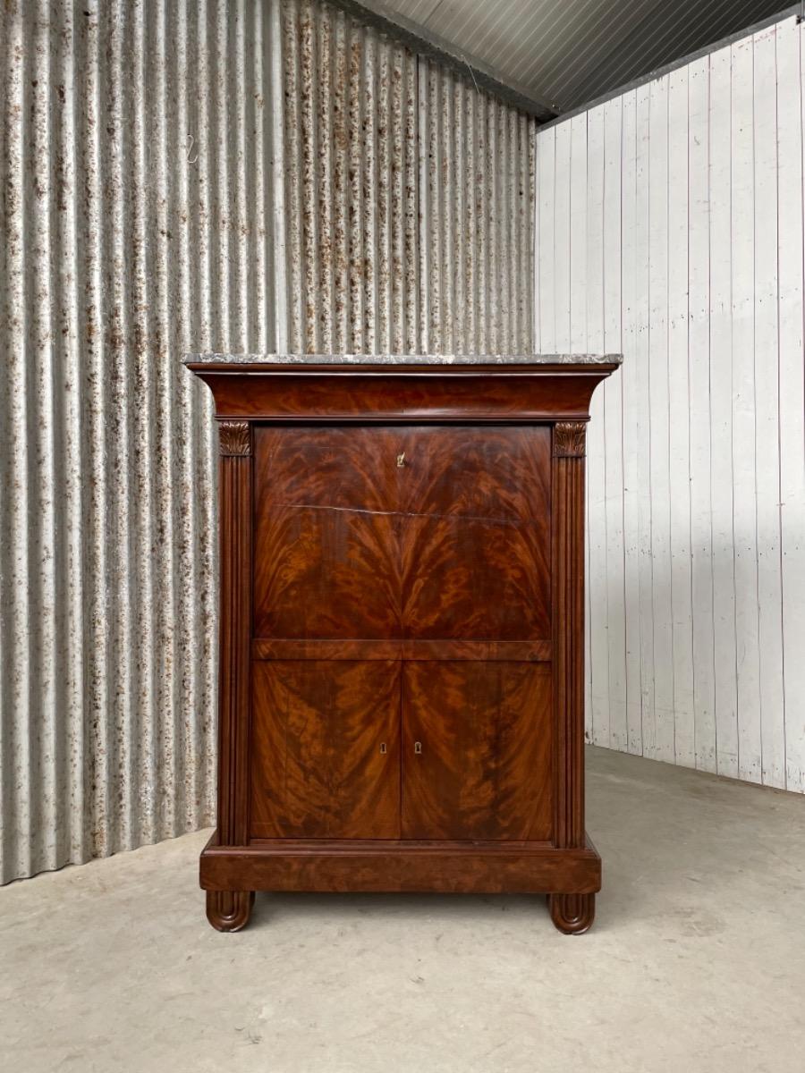 Mahonie secretaire, in gelegd met goud omboest leder. Pilaren in interrieur, marmer gedekt. Lade met slot achter de deurtjes in onderkast.