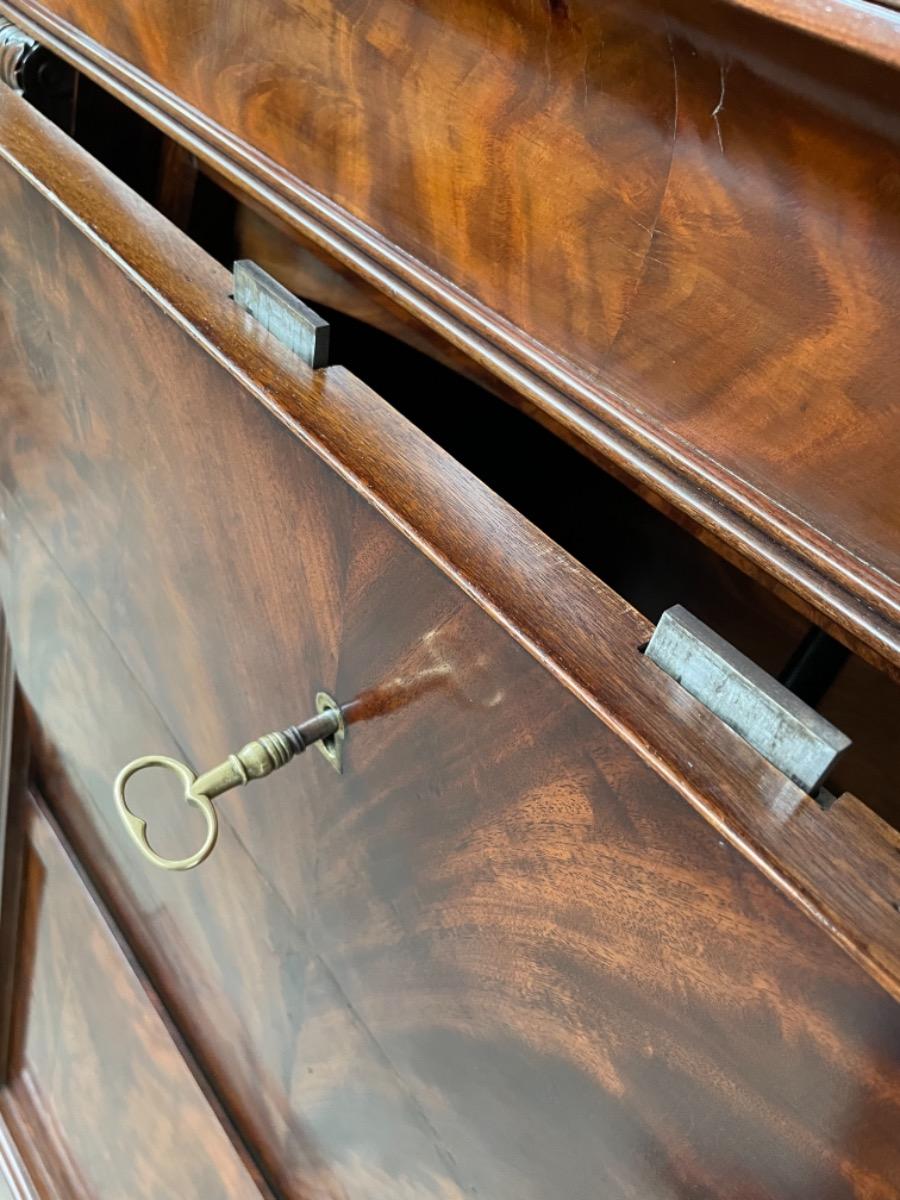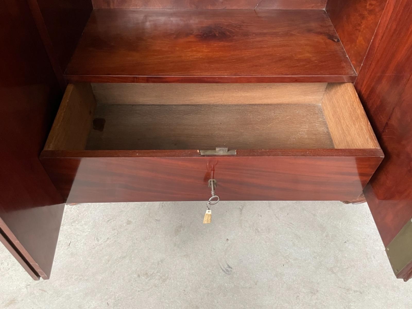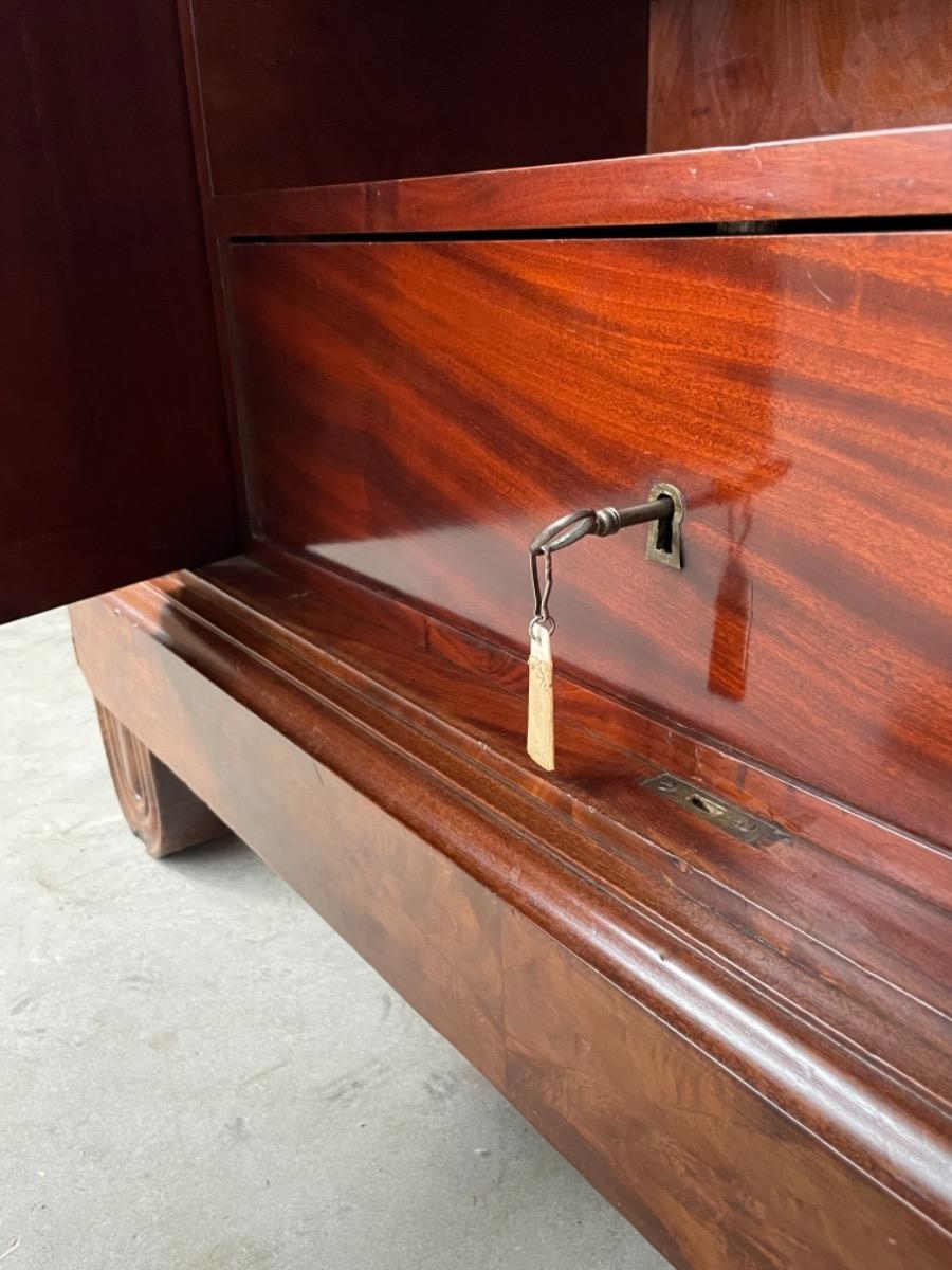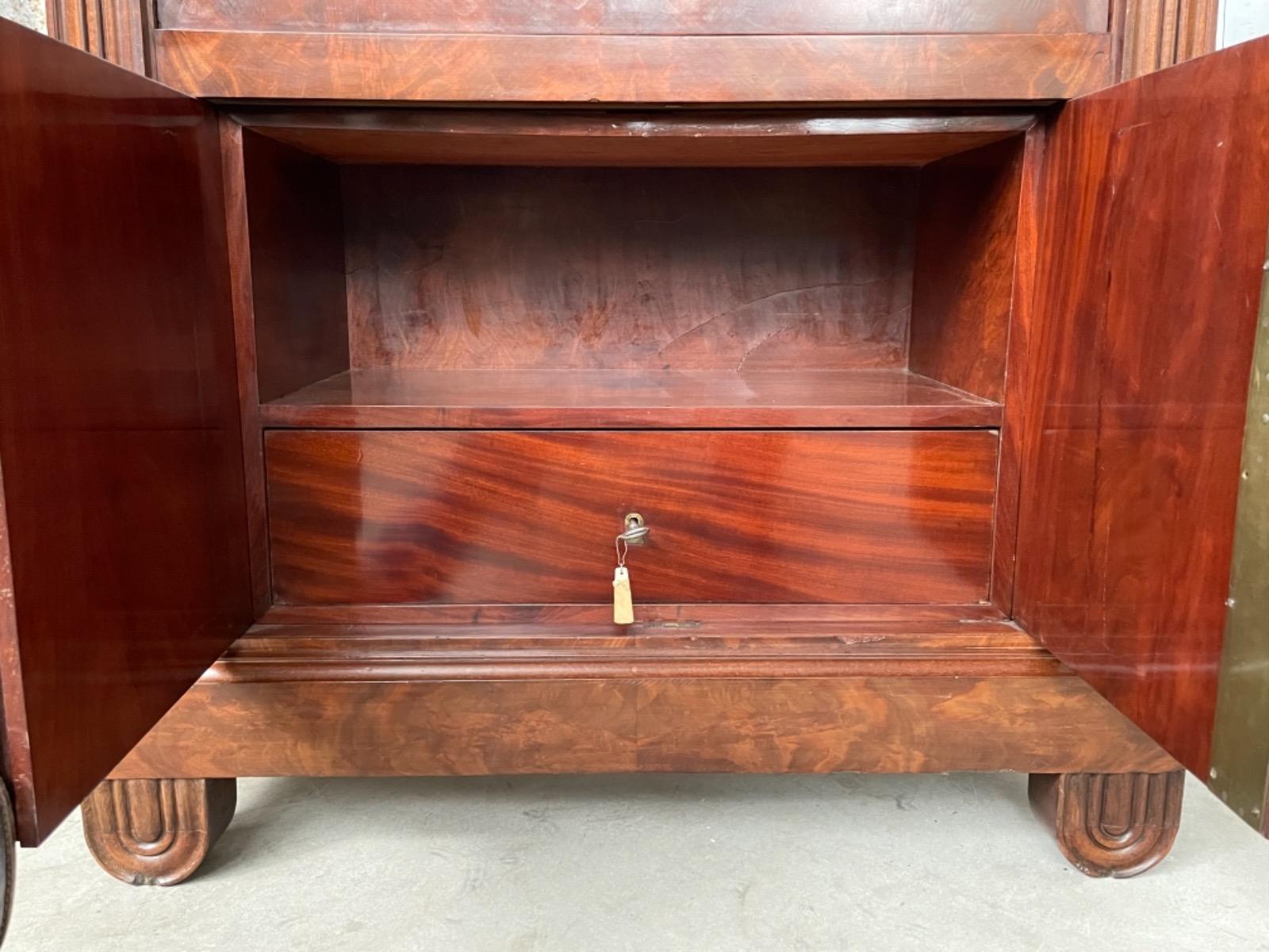 Mahonie secretaire, in gelegd met goud omboest leder. Pilaren in interrieur, marmer gedekt. Lade met slot achter de deurtjes in onderkast.