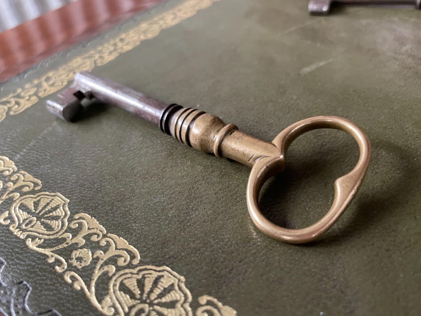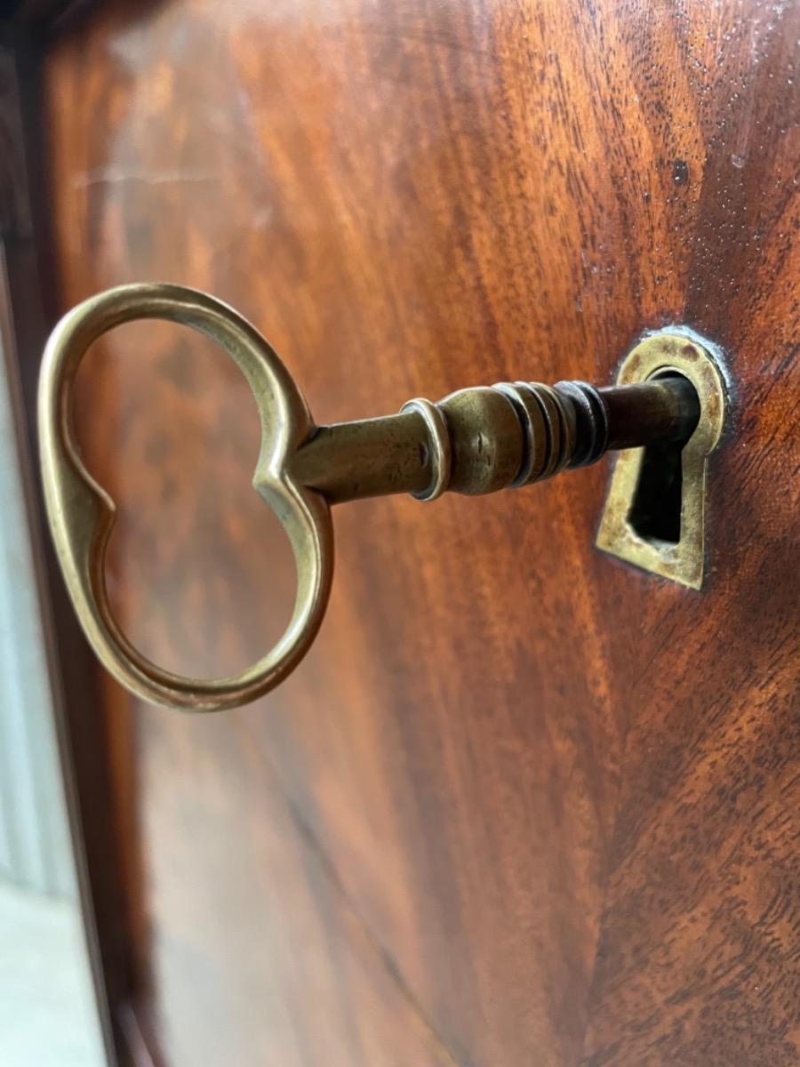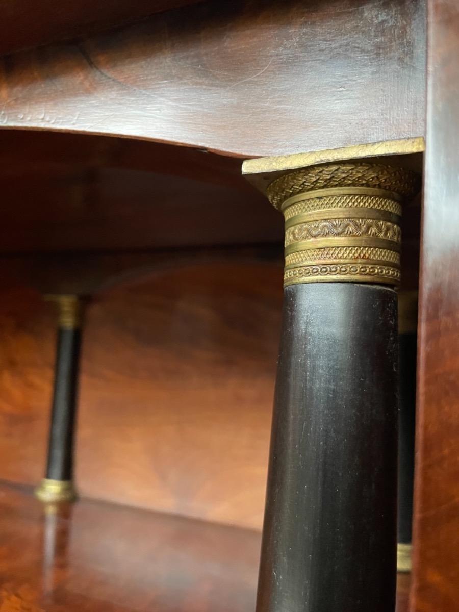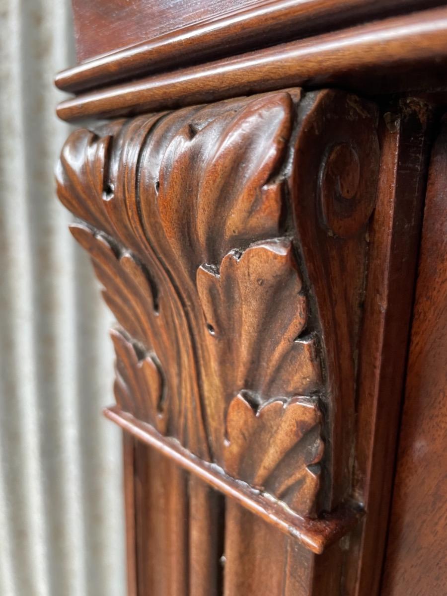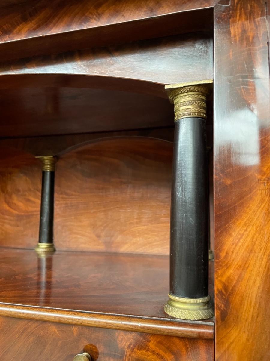 Mahonie secretaire, in gelegd met goud omboest leder. Pilaren in interrieur, marmer gedekt. Lade met slot achter de deurtjes in onderkast.
