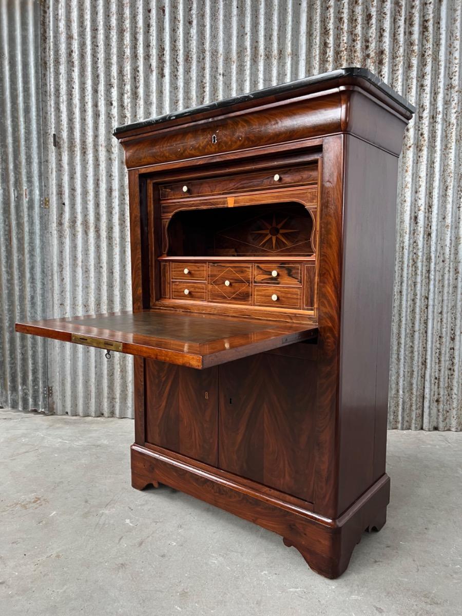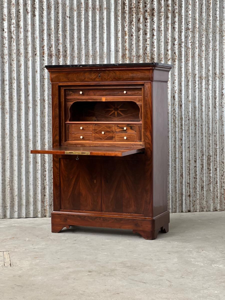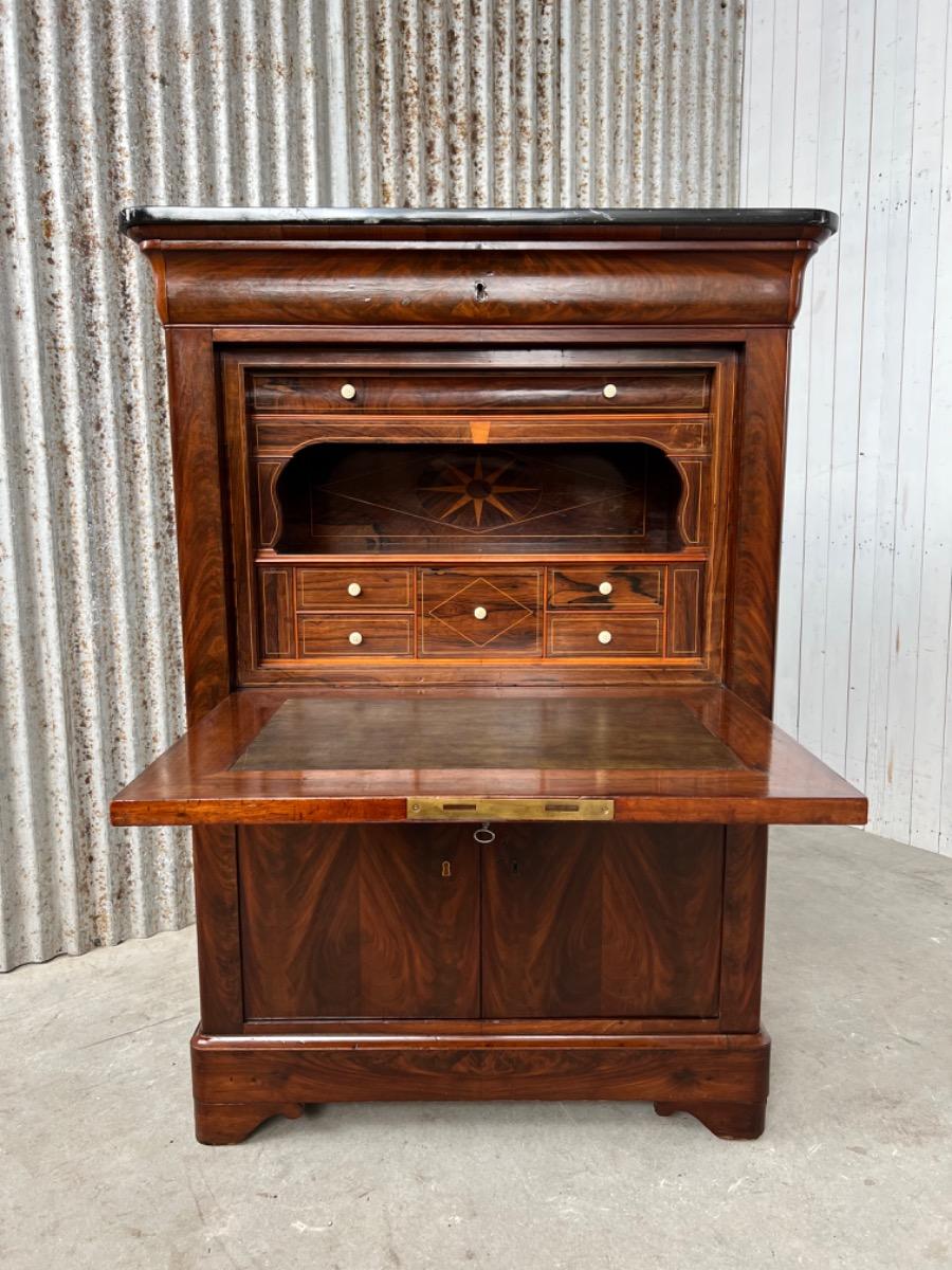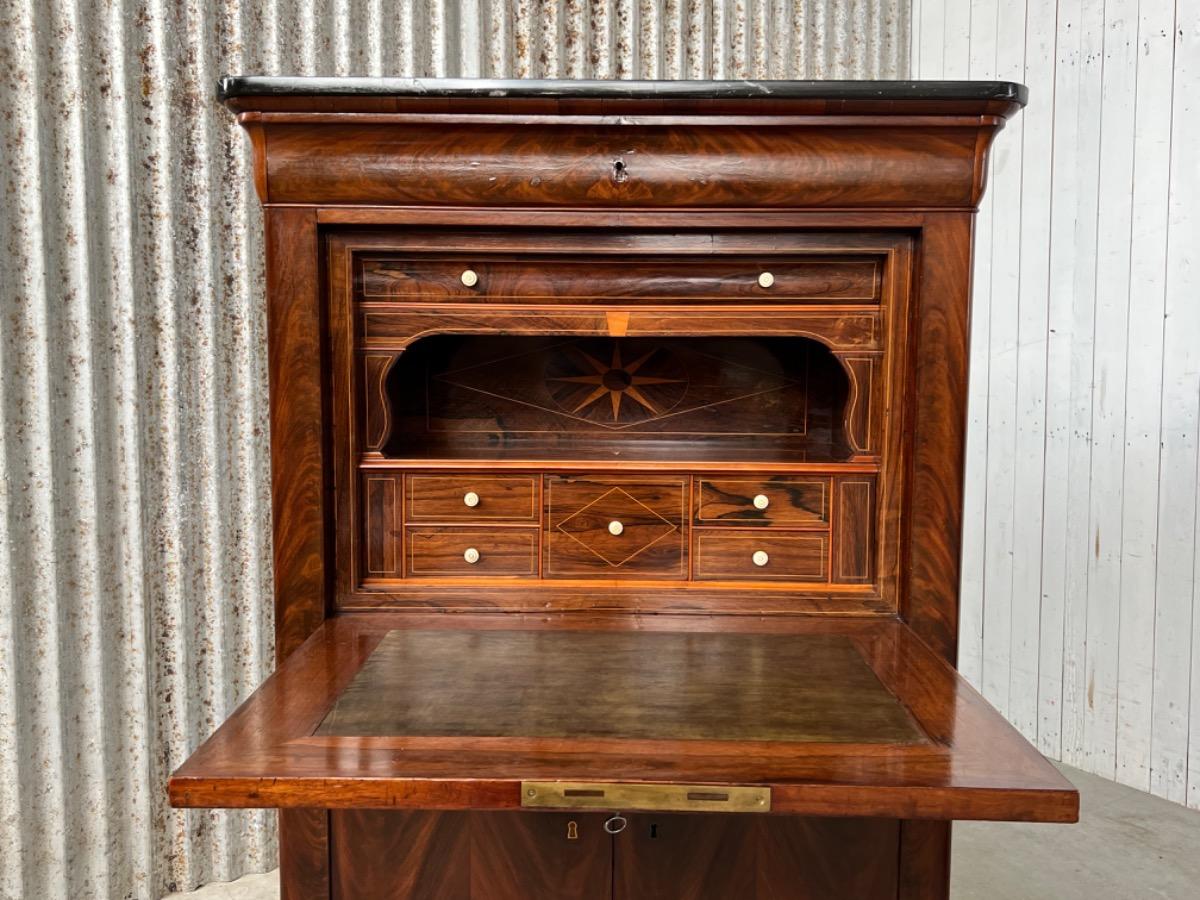 Mahonie klep secretaire gedekt met antraciet wit geaderd marmer.