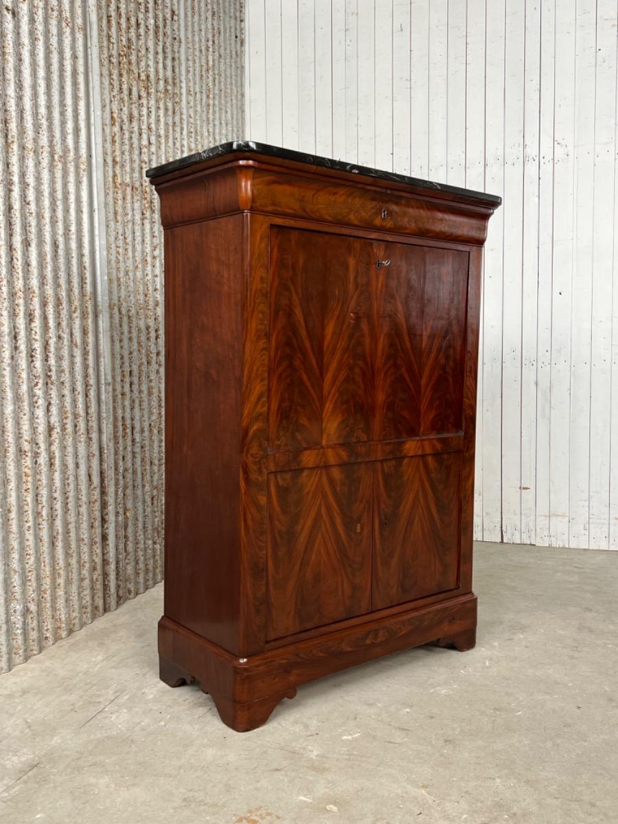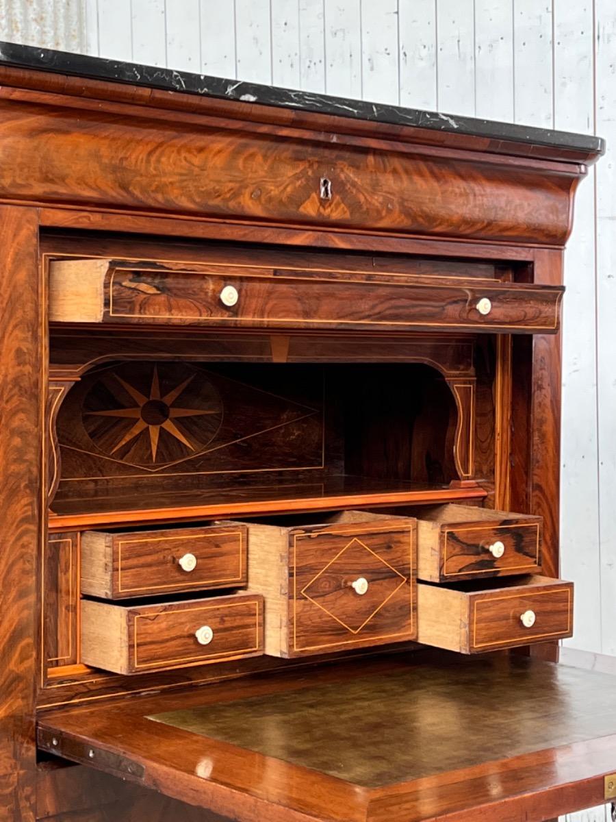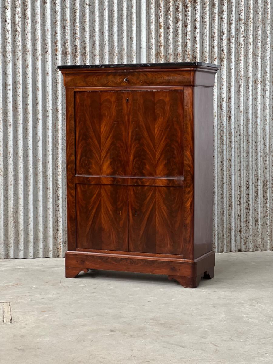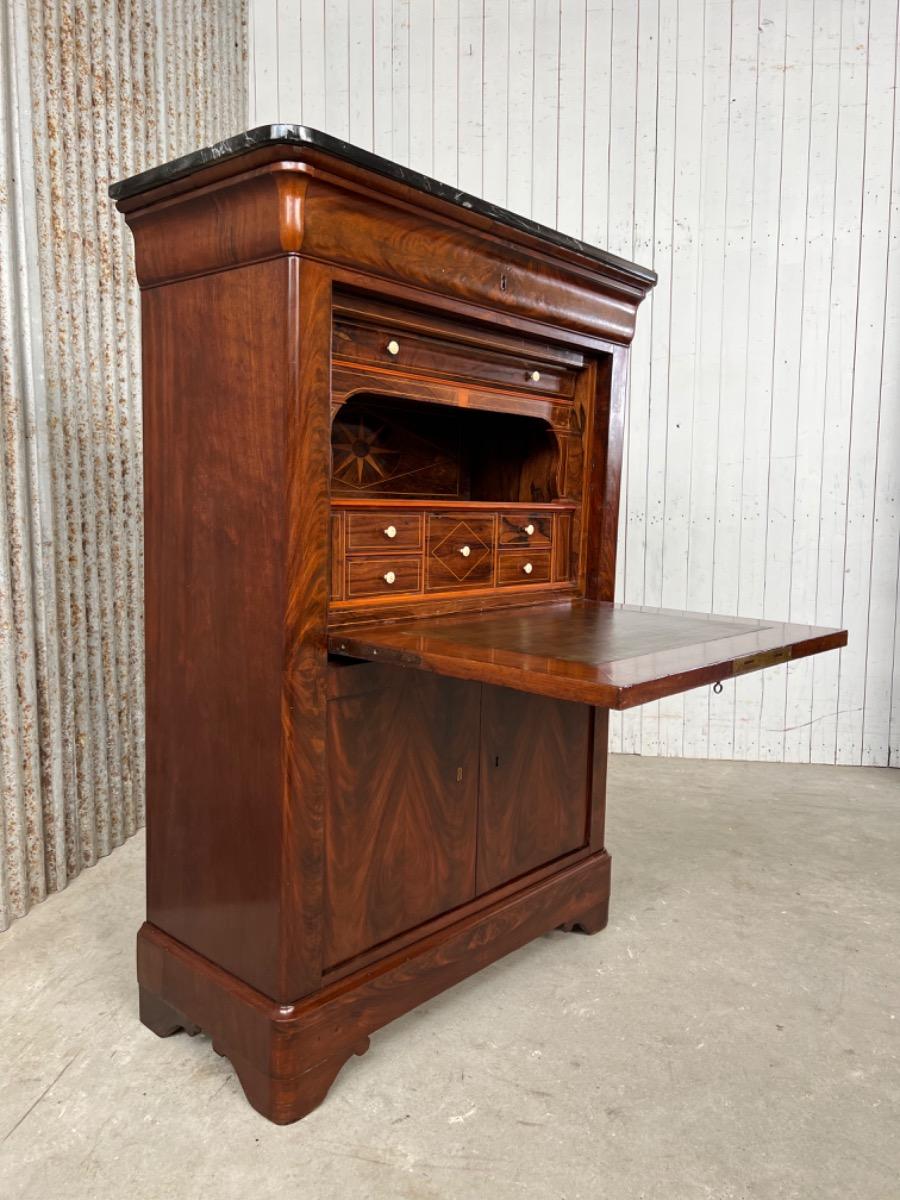 Mahonie klep secretaire gedekt met antraciet wit geaderd marmer.