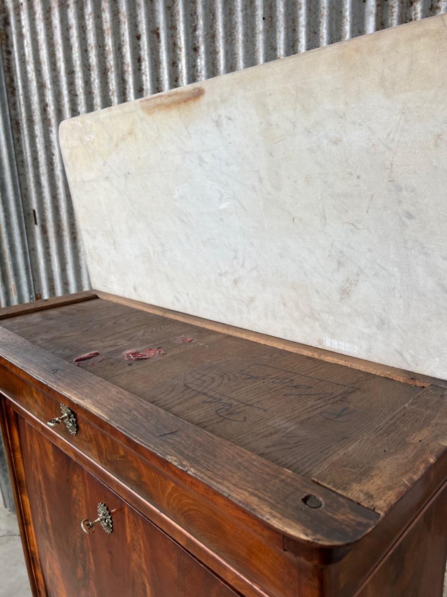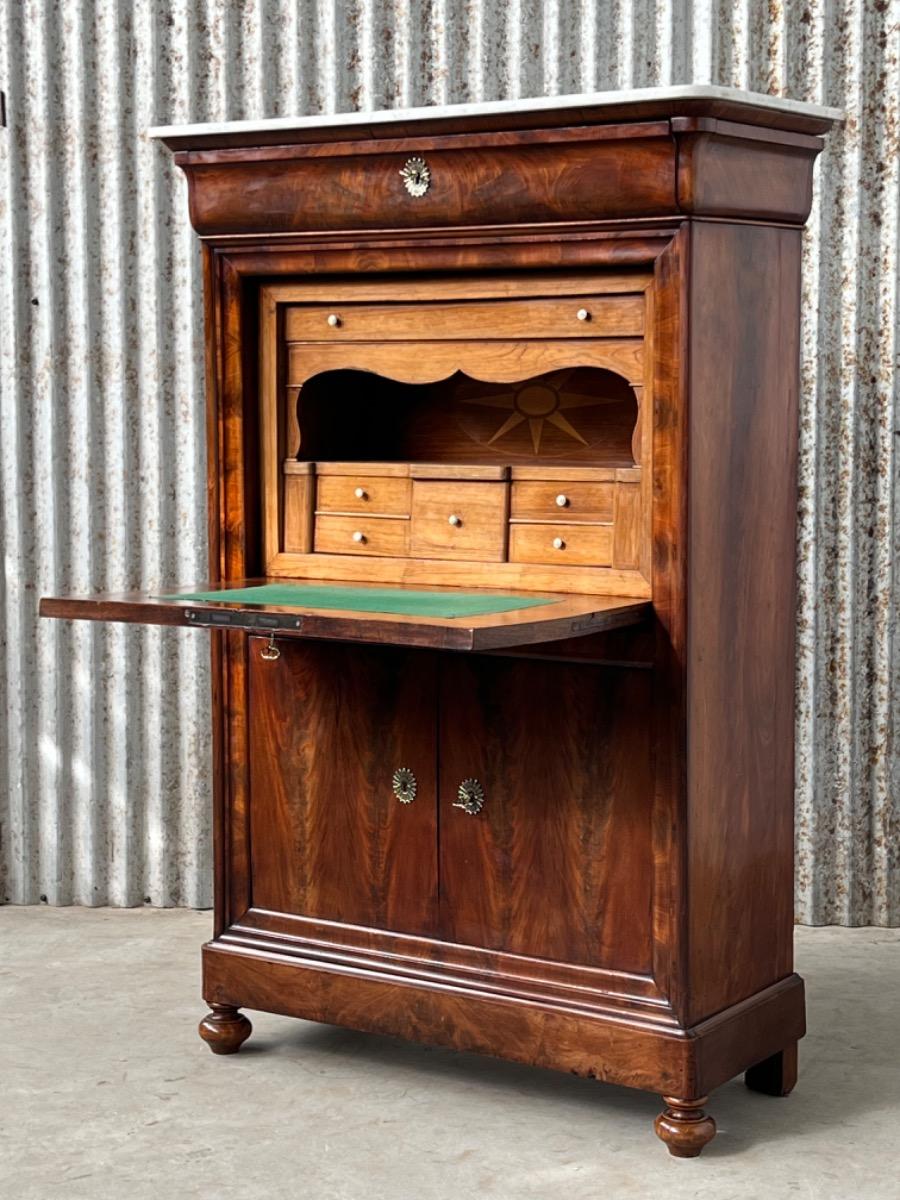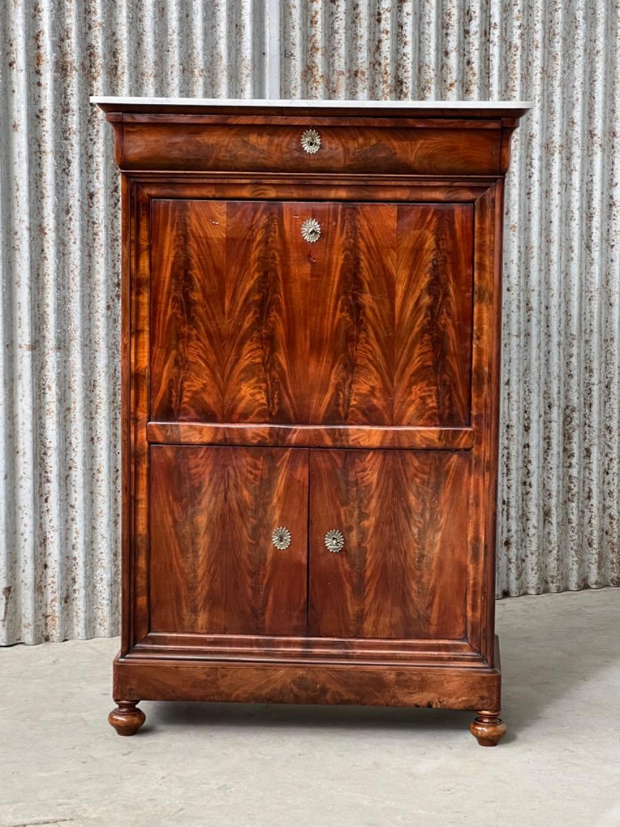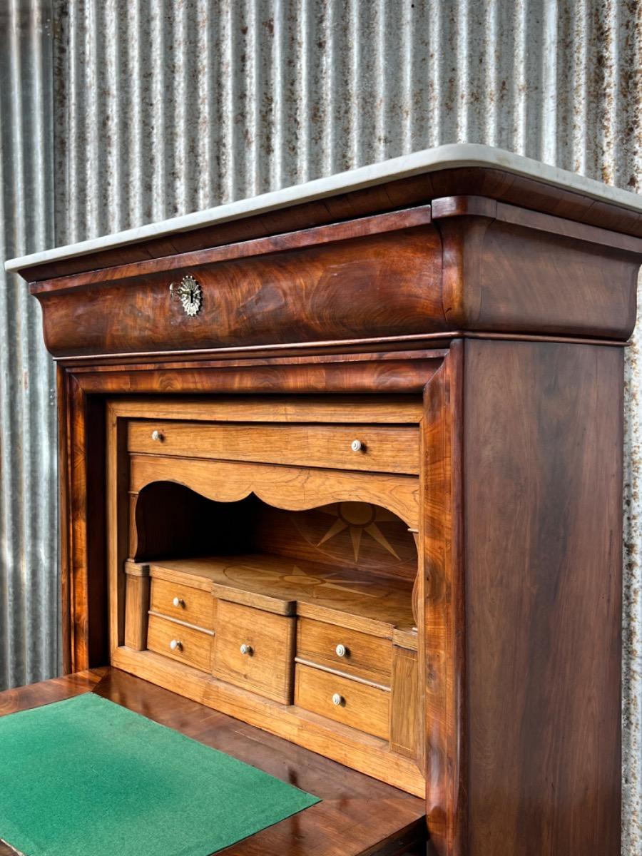 Mahonie klep secretaire gedekt met Bianca Carrara marmer. Gesigneerd / gebrandmerkt R. Voet. Ook een stempel VR in rode schellak.