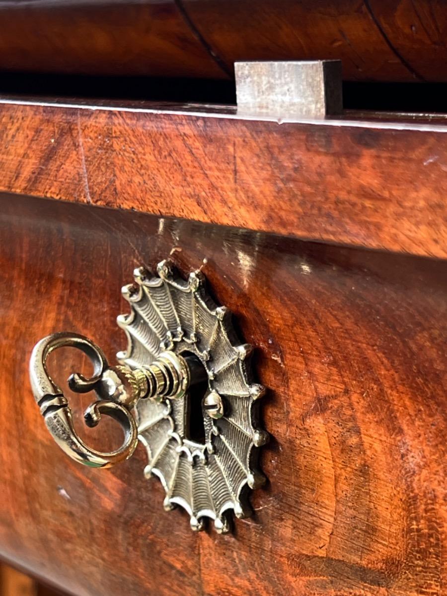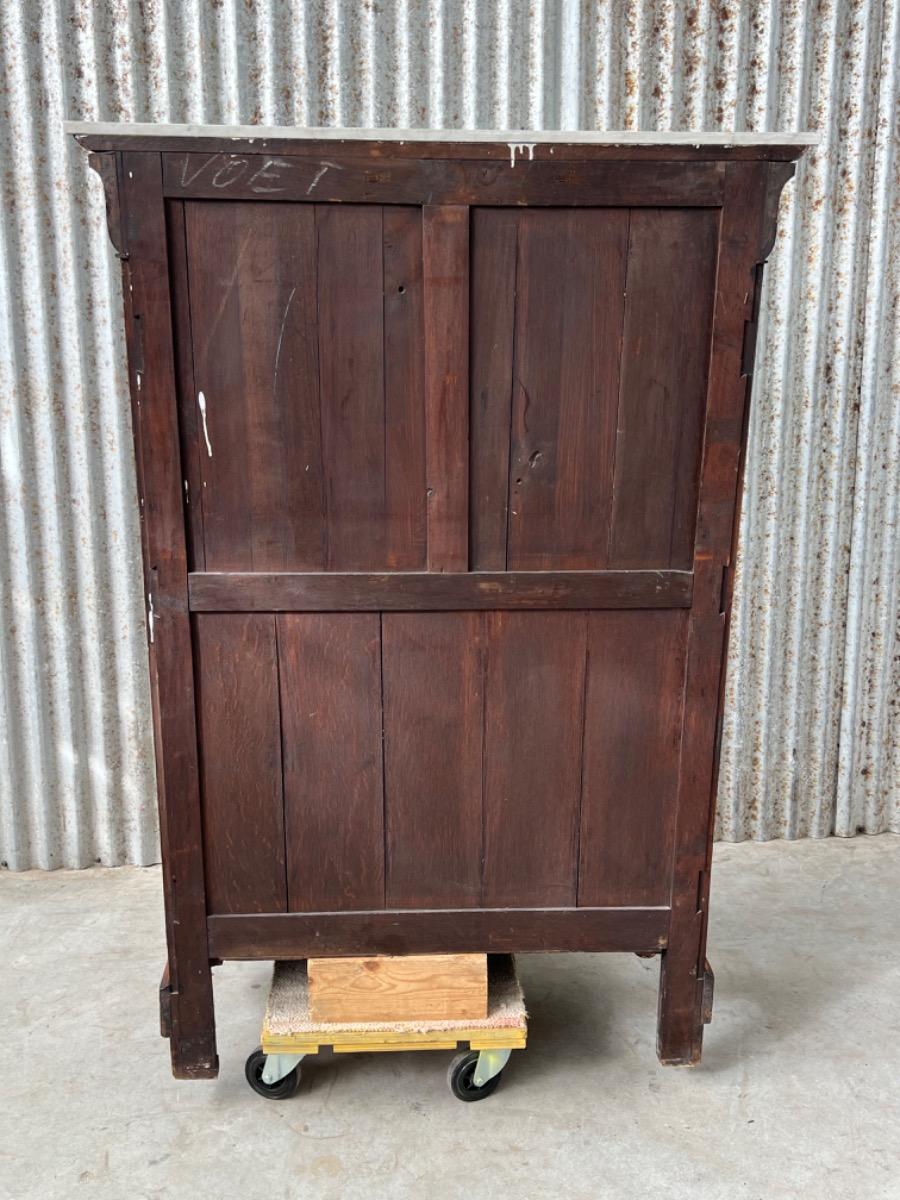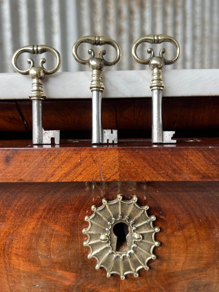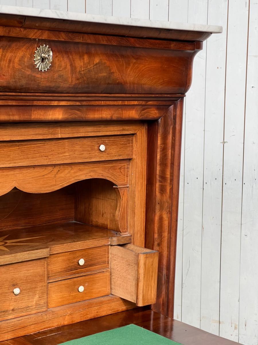 Mahonie klep secretaire gedekt met Bianca Carrara marmer. Gesigneerd / gebrandmerkt R. Voet. Ook een stempel VR in rode schellak.