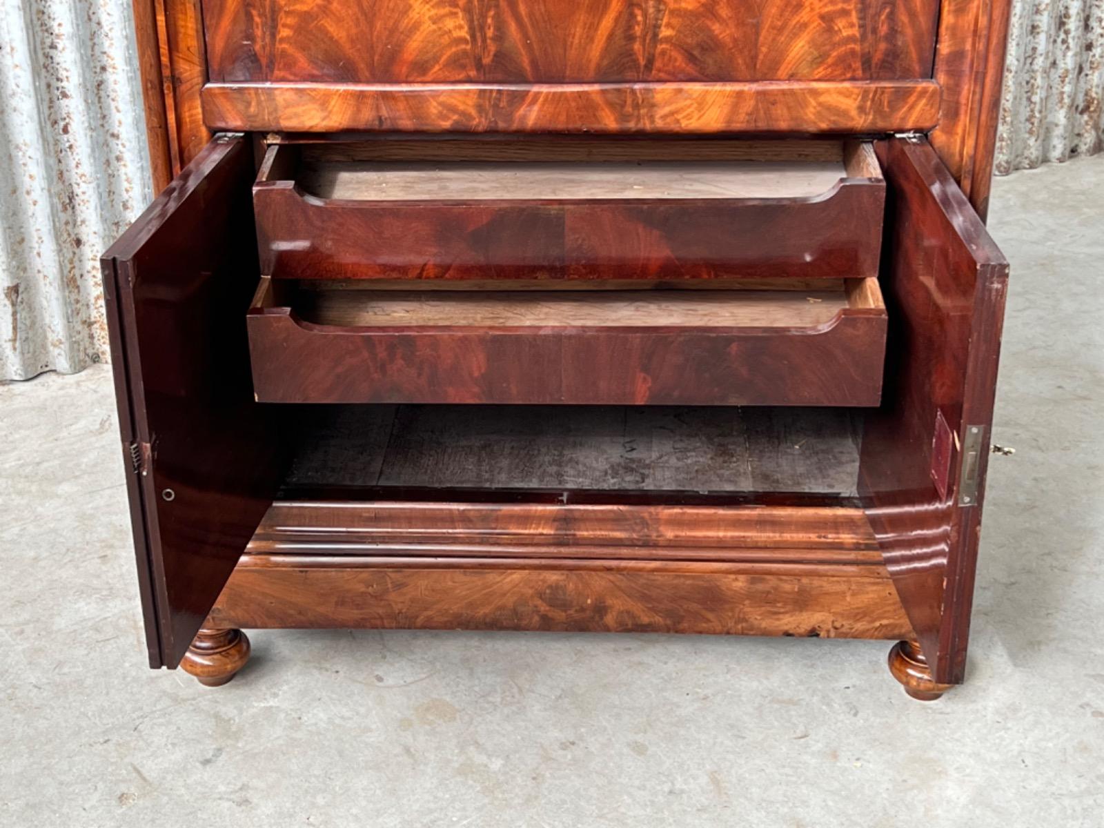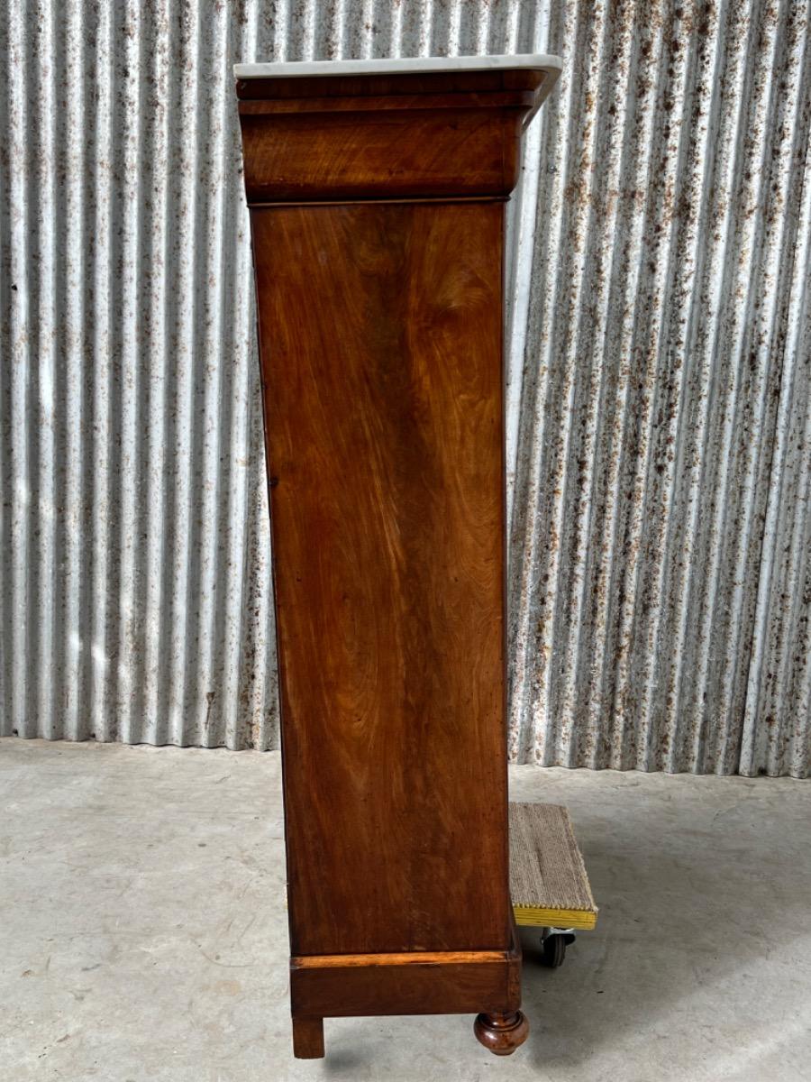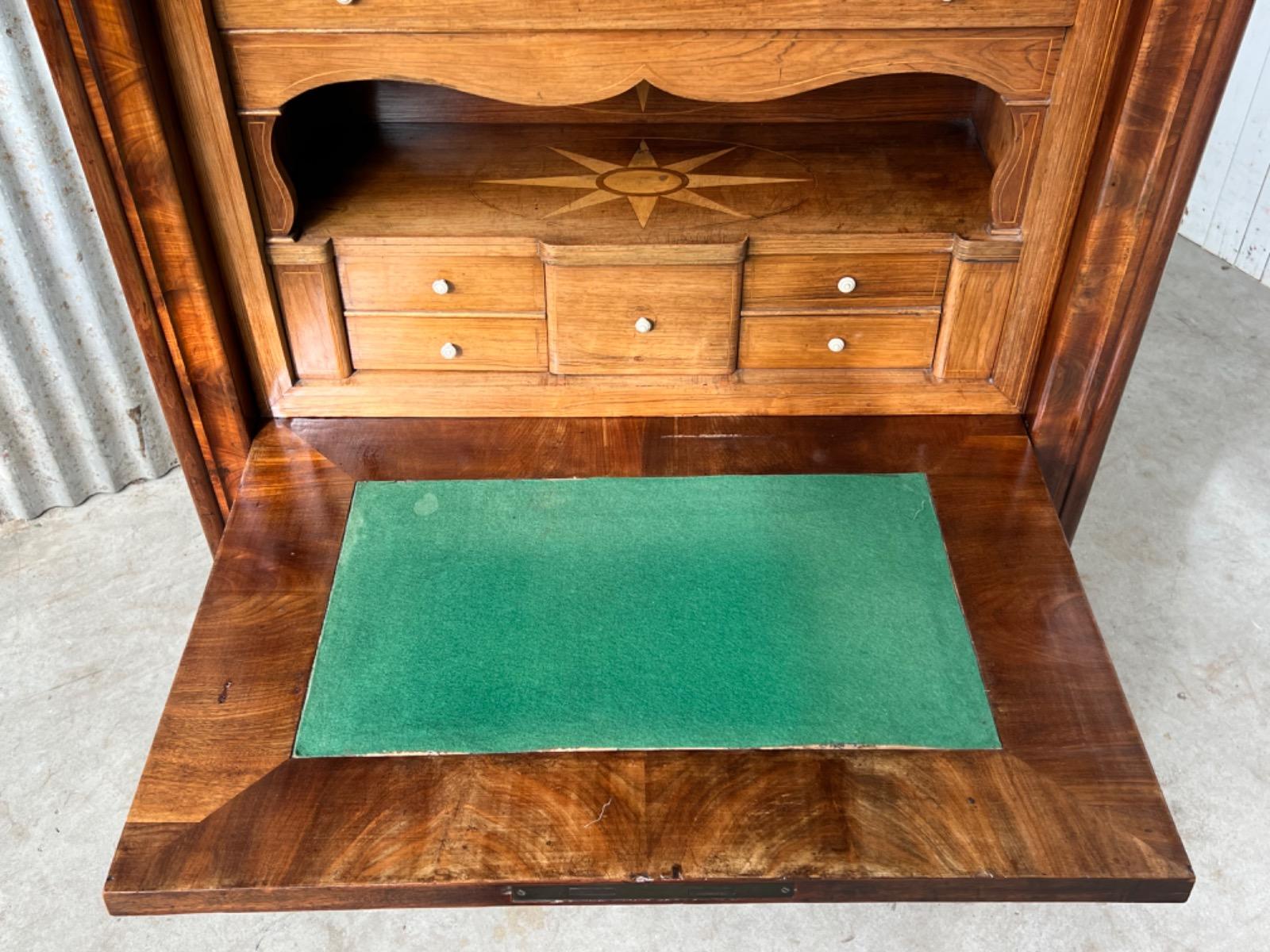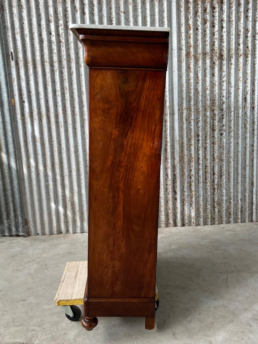 Mahonie klep secretaire gedekt met Bianca Carrara marmer. Gesigneerd / gebrandmerkt R. Voet. Ook een stempel VR in rode schellak.
