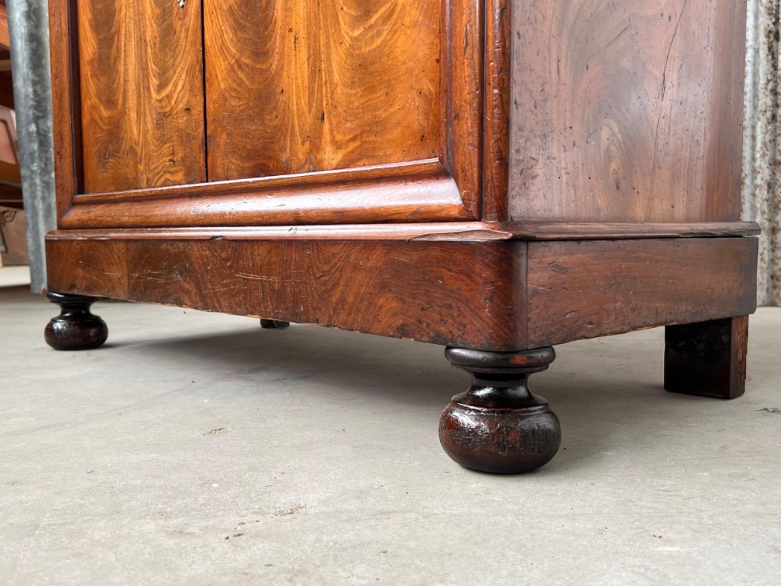 Het interieur vol met 5 laden met witte gedraaide knop. Strak model, vlakke deuren en klep, op massief mahonie gedraaide poot.