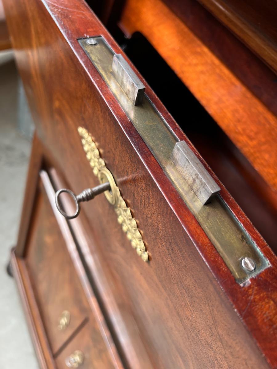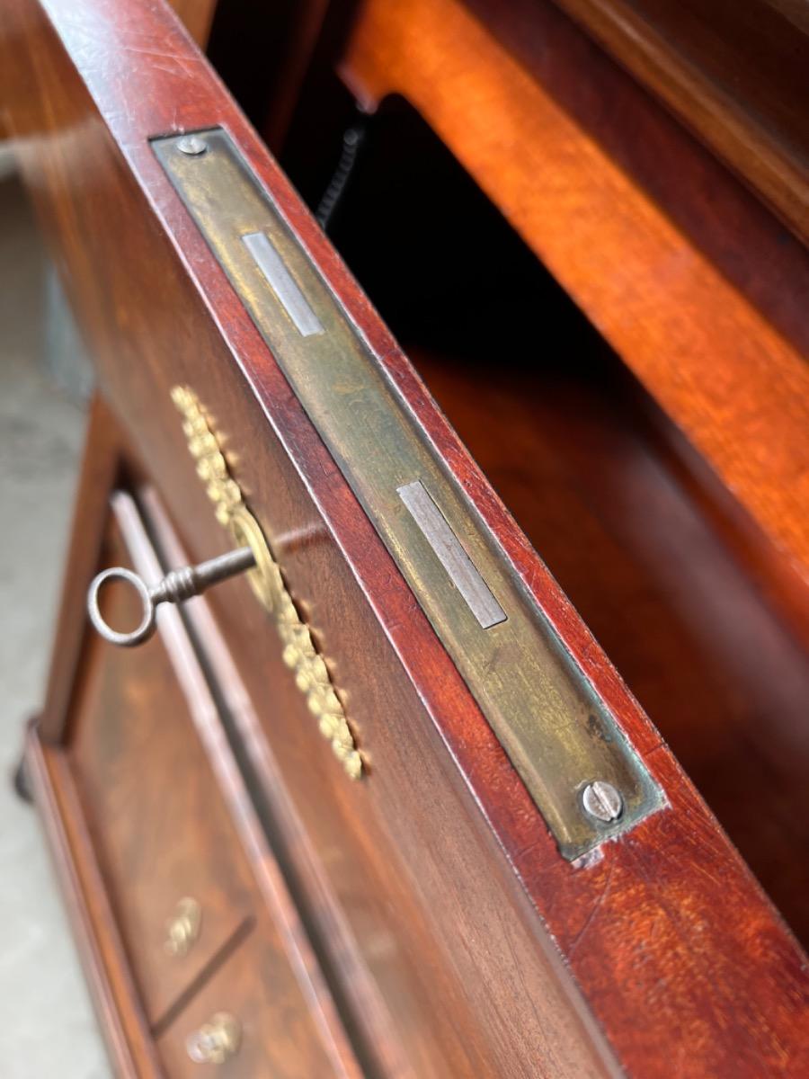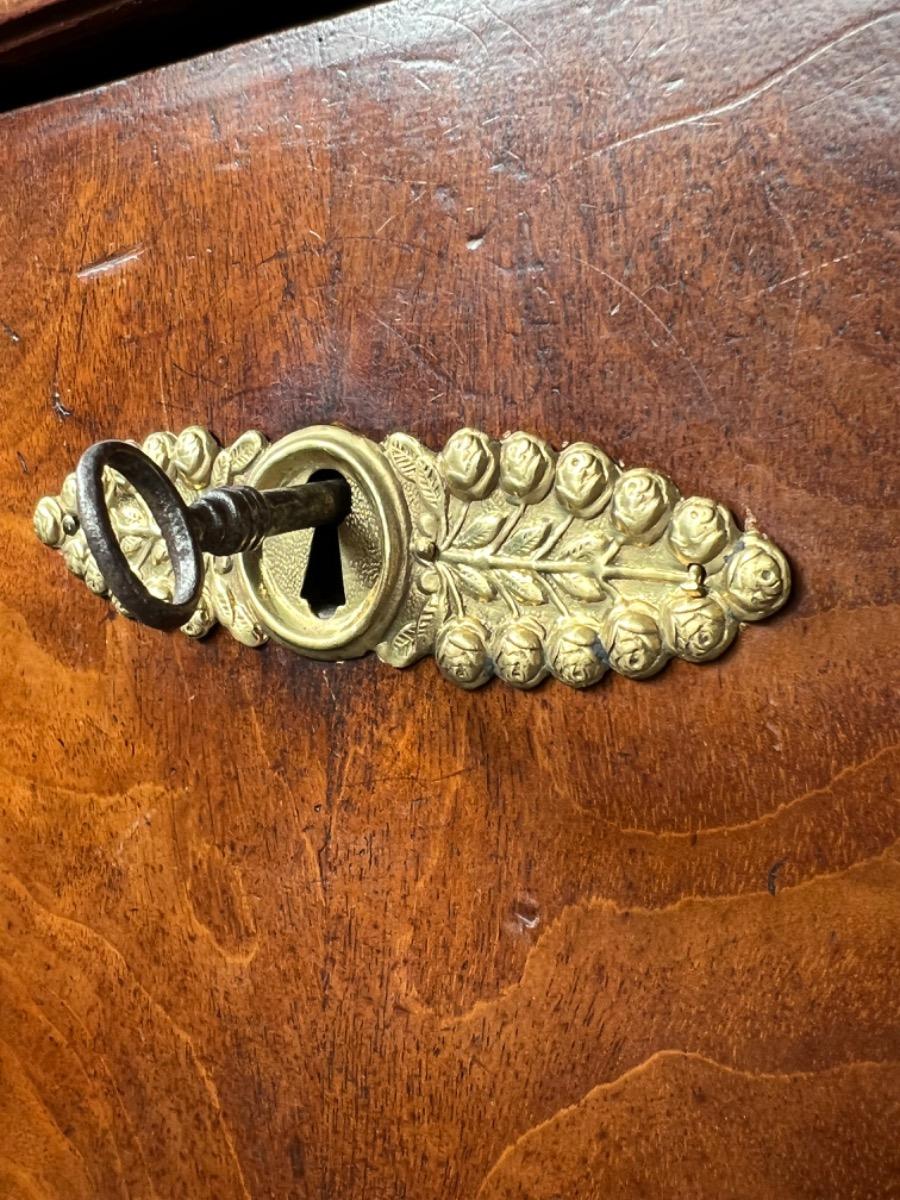 Oorspronkelijke Sloten (3) en sleutels (3) aanwezig en werkend. (Slot mist van centrale lade in interieur) afgedekt met verguld messing entré beslag.