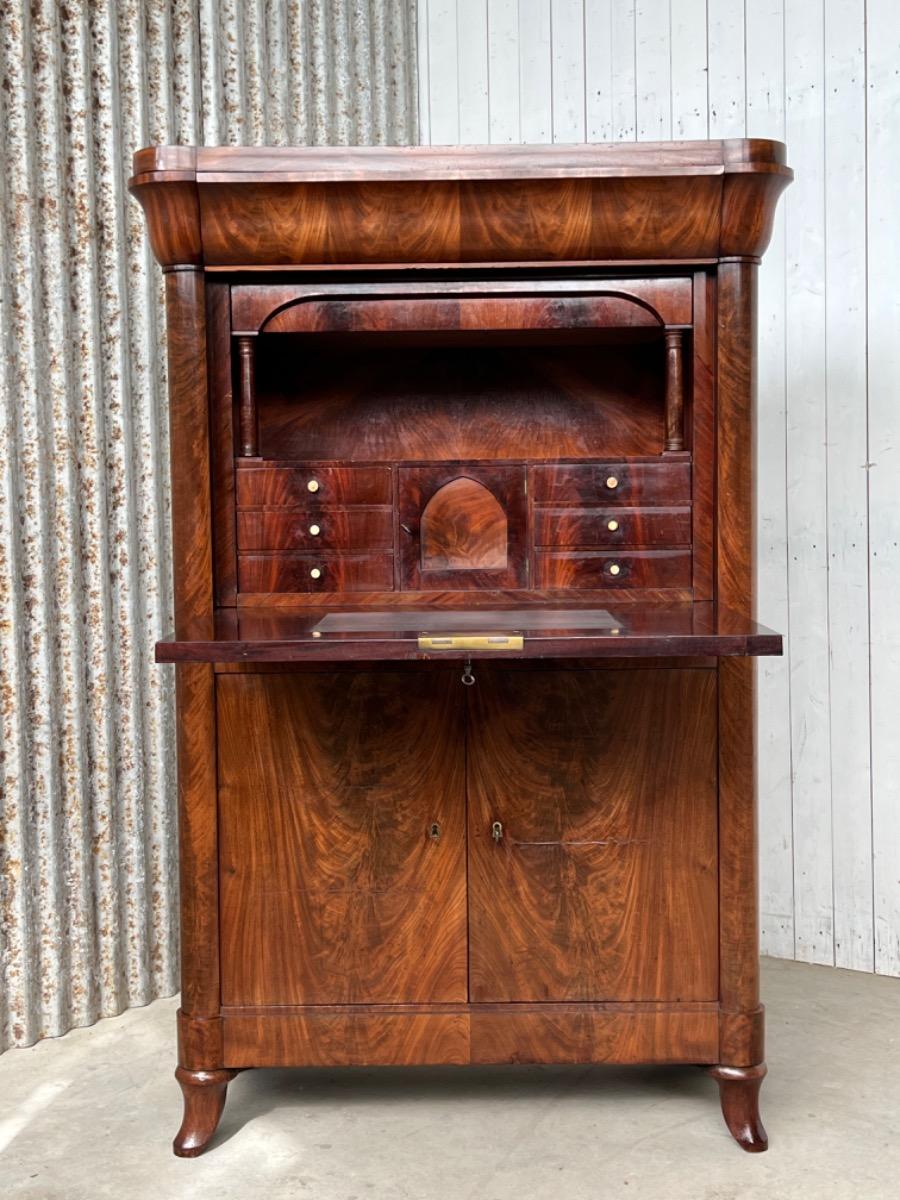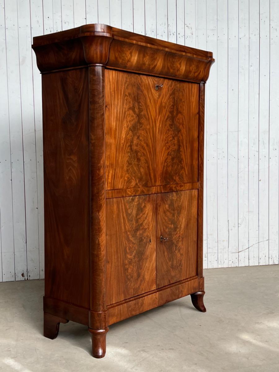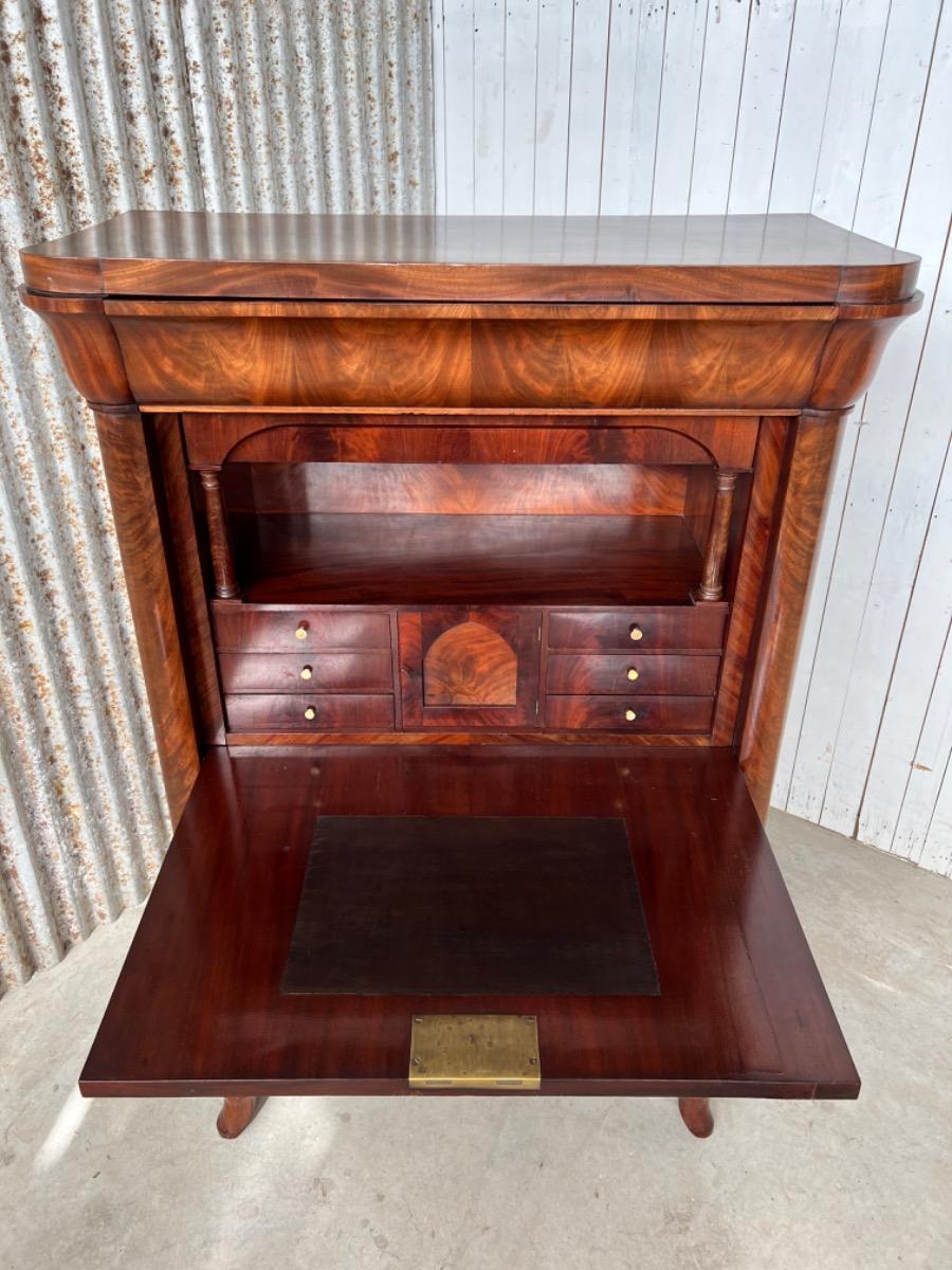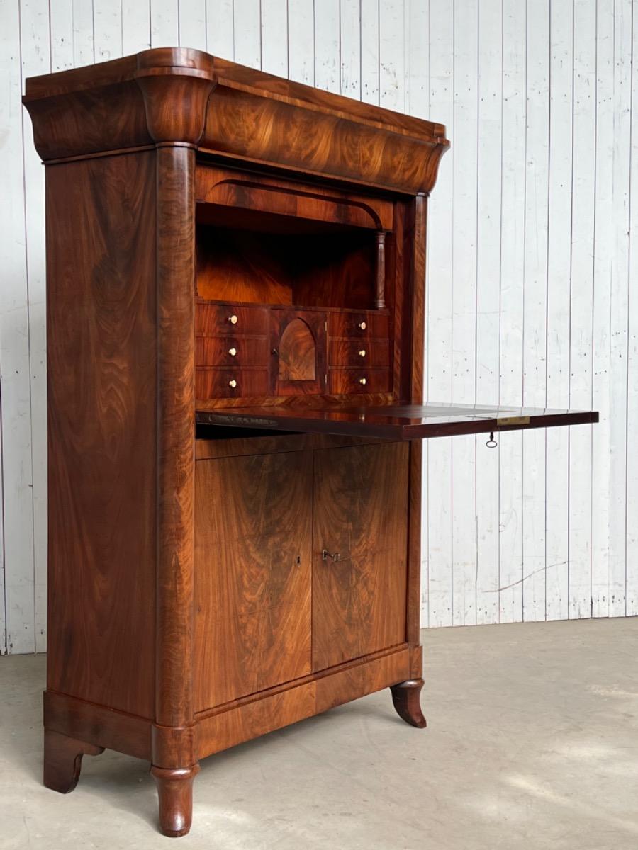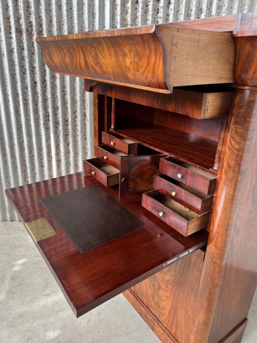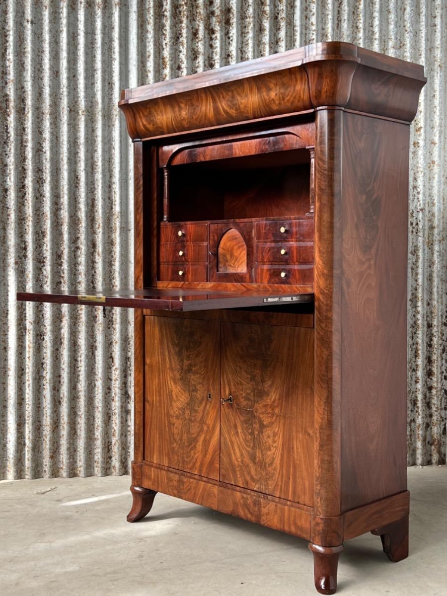 Mahonie secretaire strak model, zeer fraai bloemmahonie gefineerd met massief messing entreé's