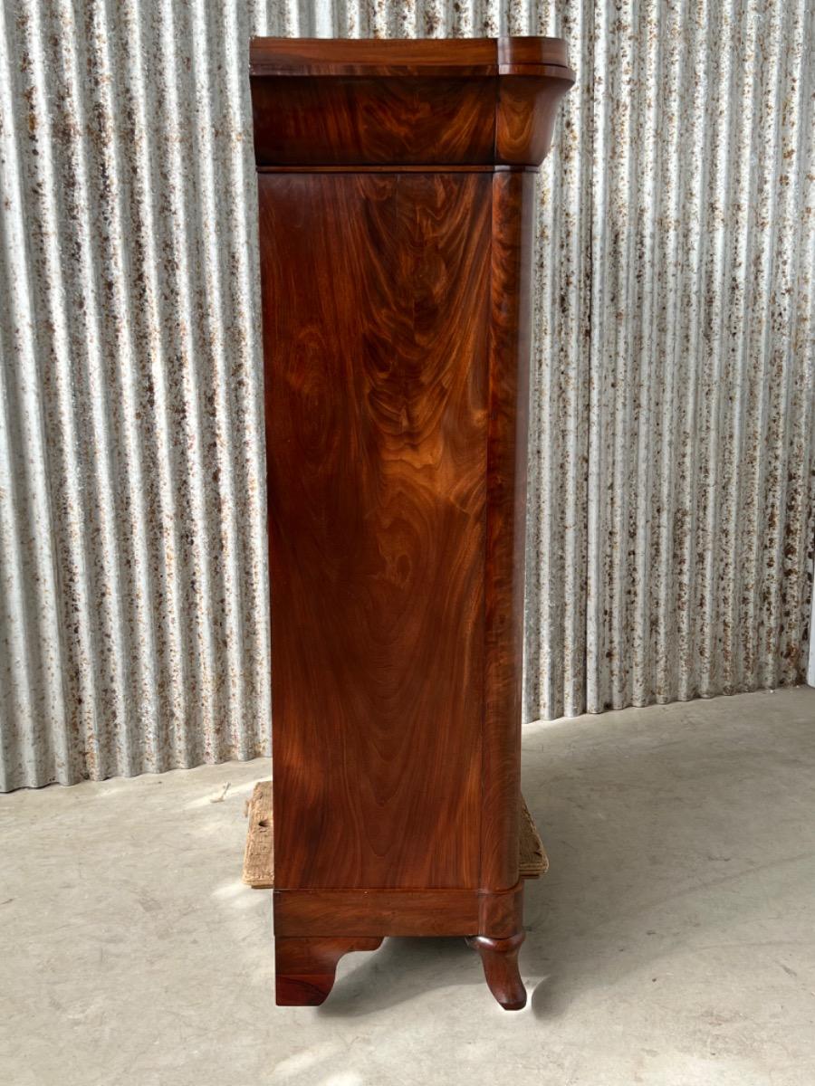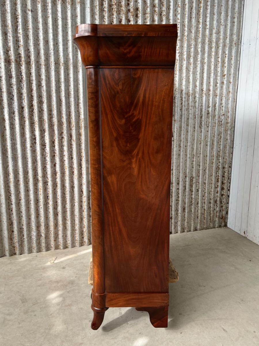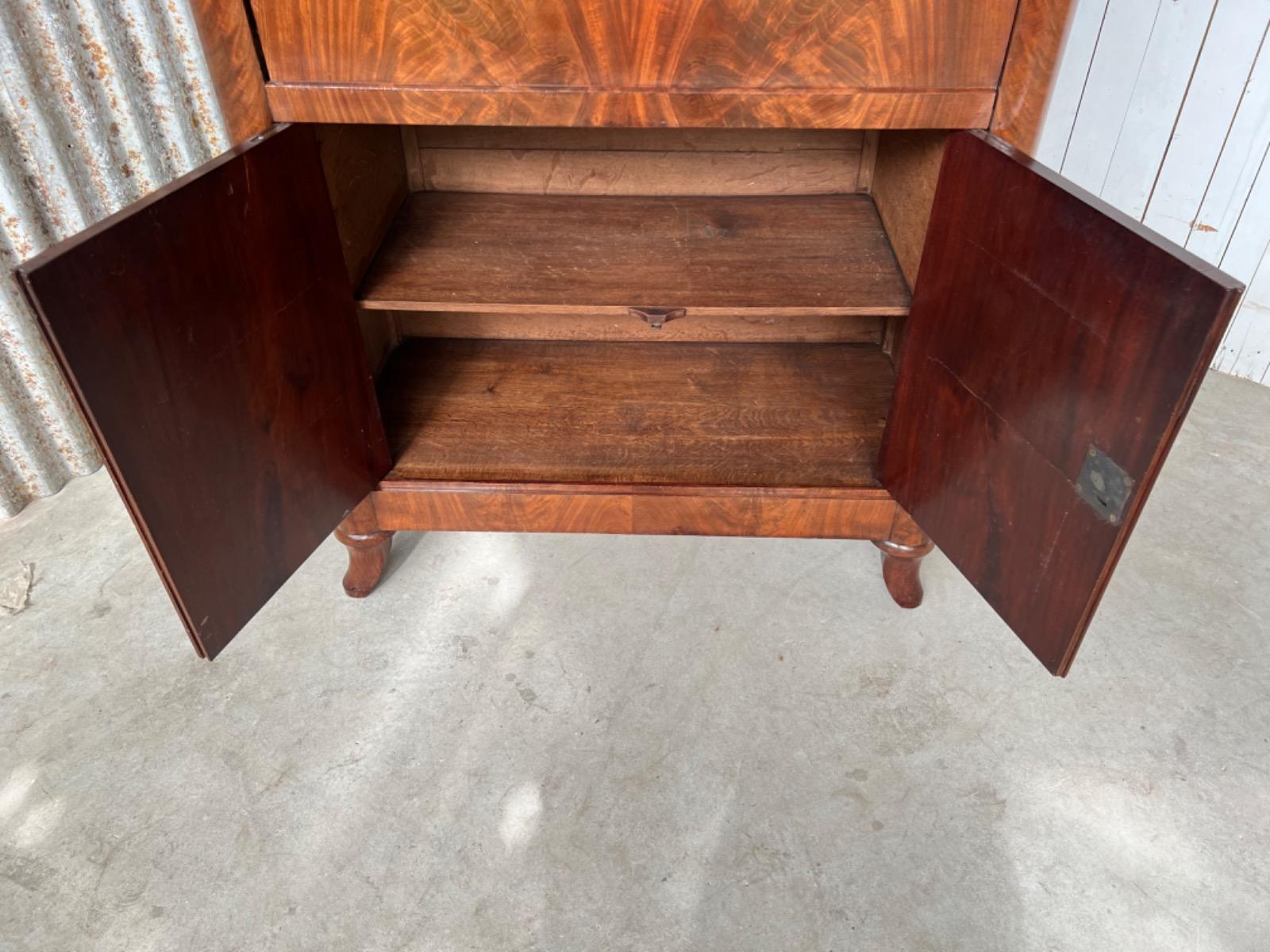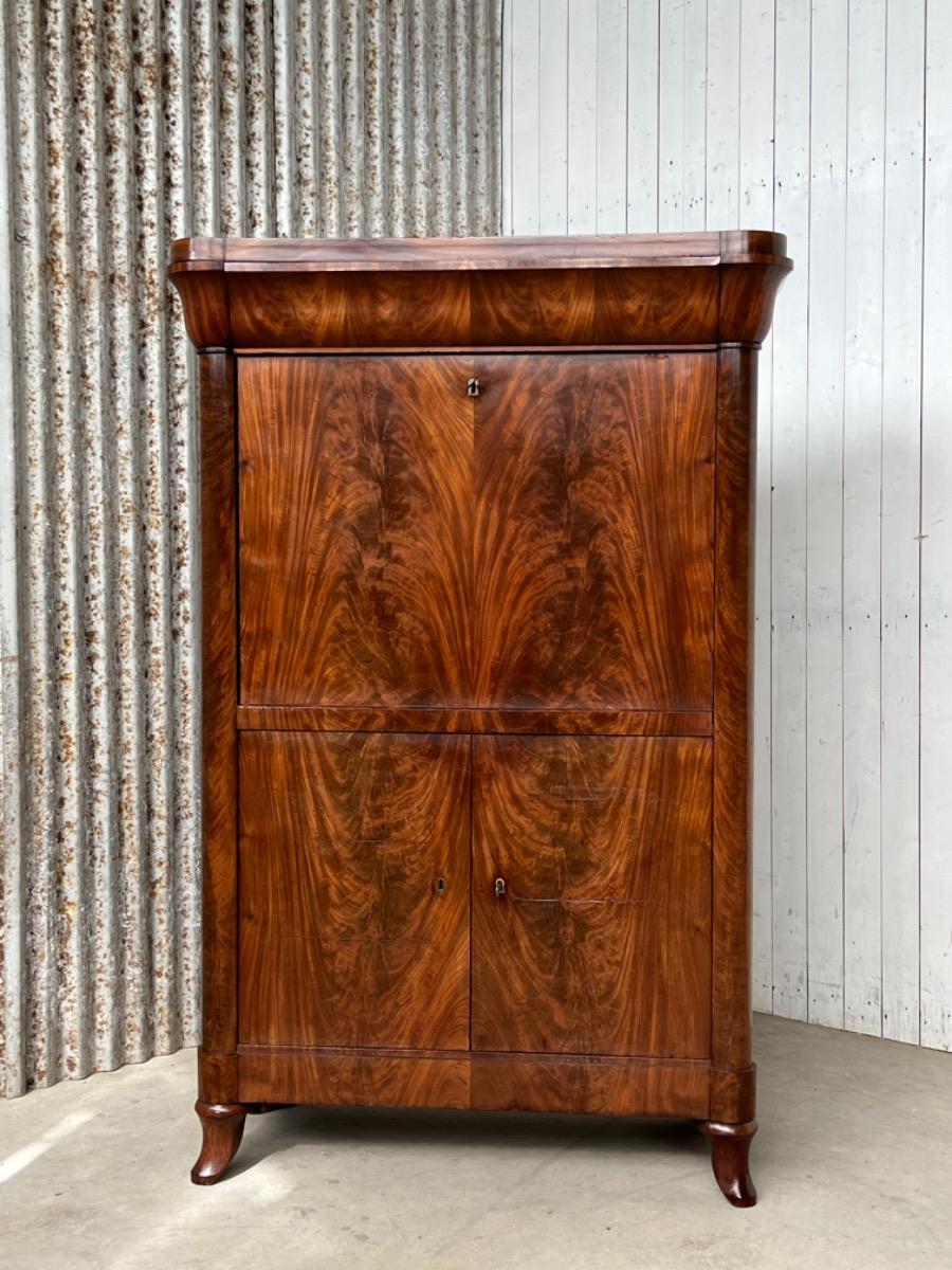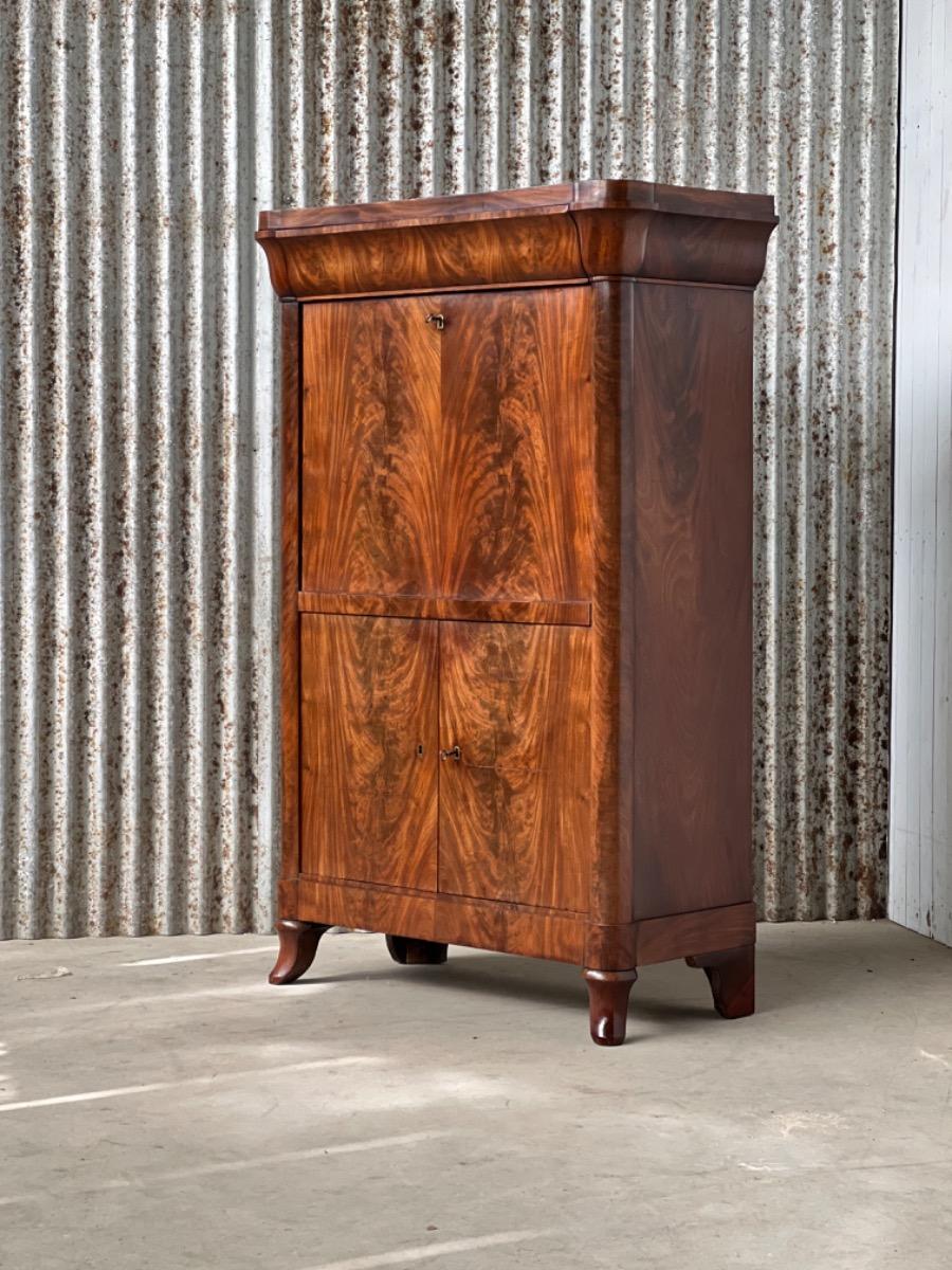 Mahonie secretaire strak model, zeer fraai bloemmahonie gefineerd met massief messing entreé's
