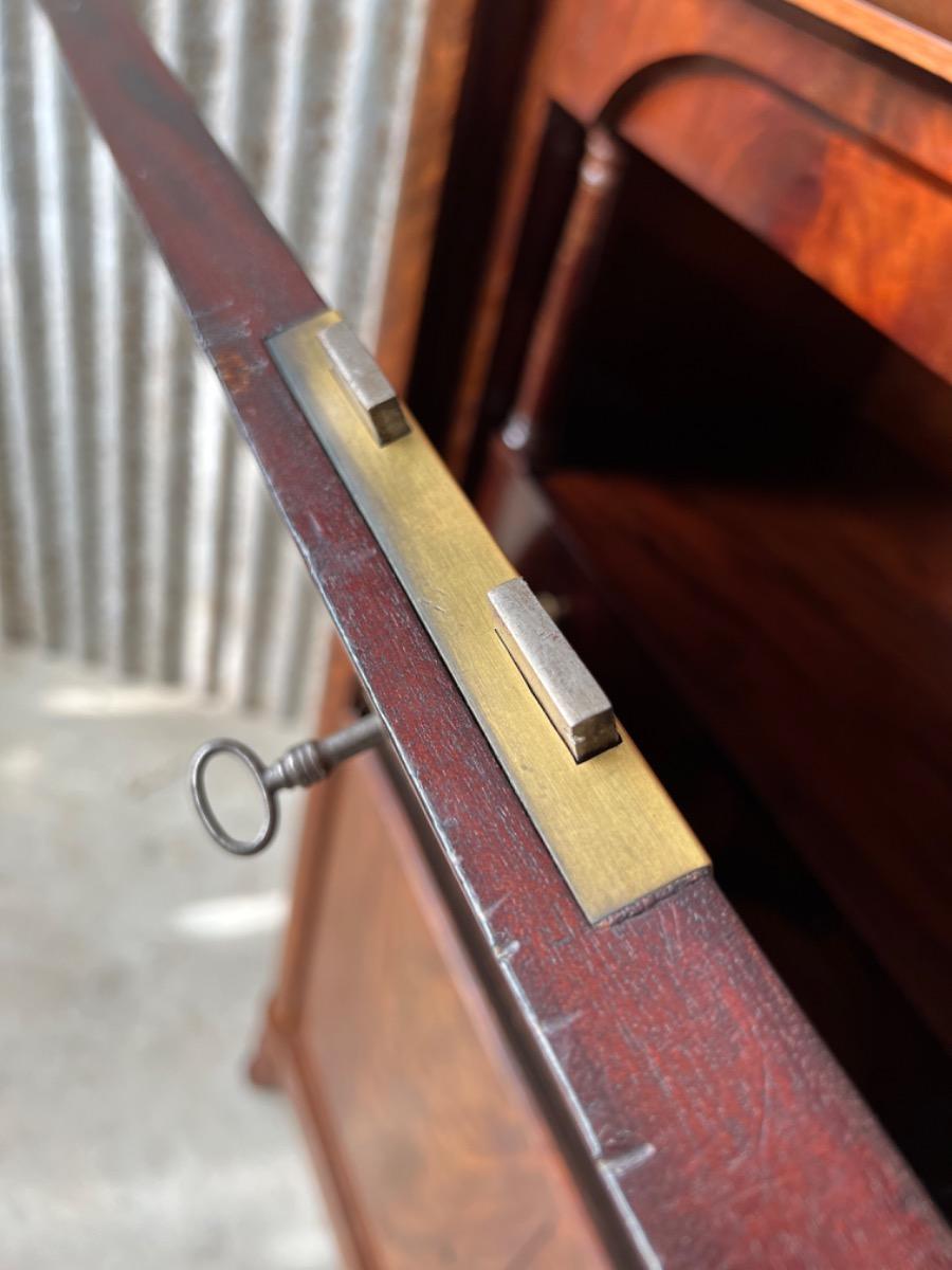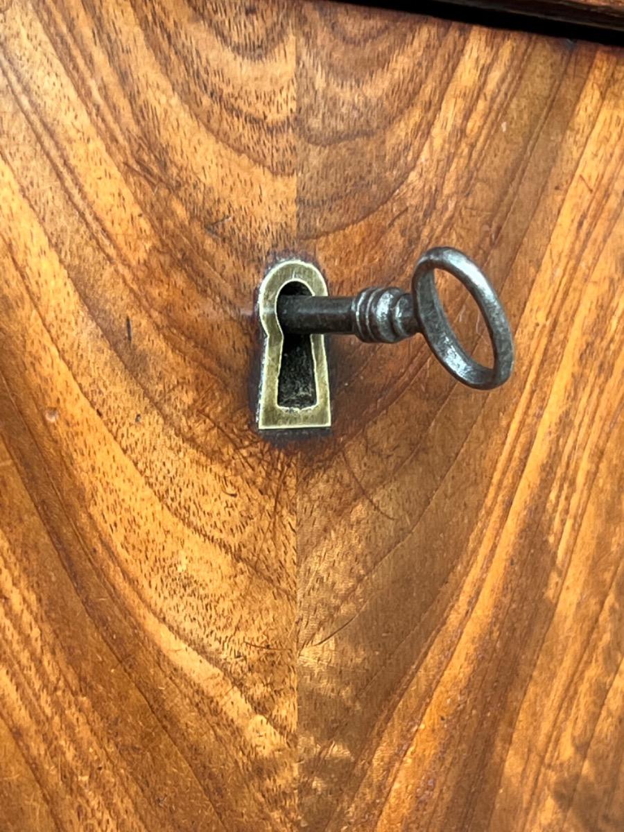 6 laden in het interieur met ivoren knopjes en aan weerskanten volle pilaren. 1 blinde lade in de kap. Sloten (in klep met bel) en sleutels oorspronkelijk èn werkend.