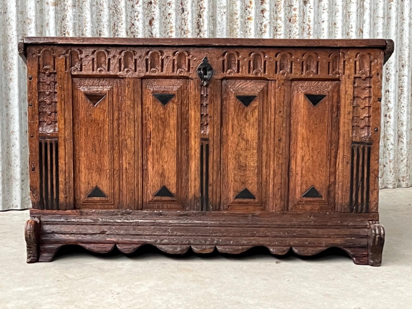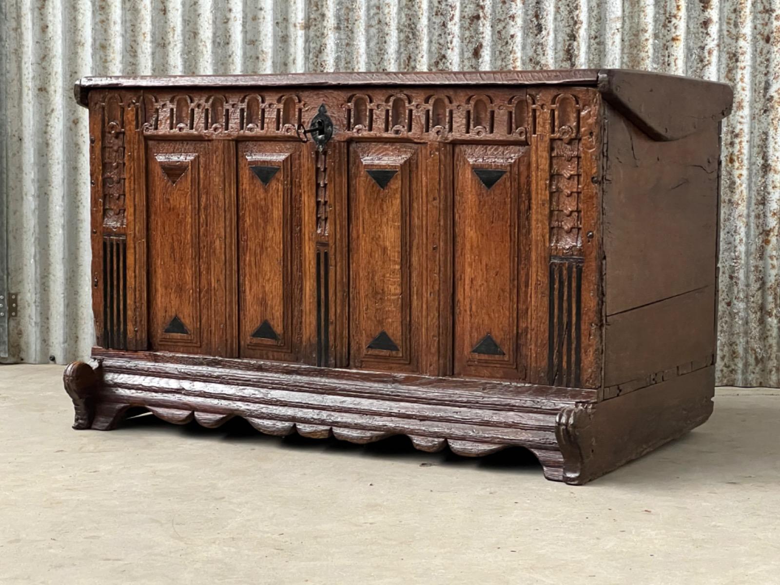 Een prachtige en zeldzame vroege 17e-eeuwse eikenhouten kist van kleine afmetingen en prachtige kleur, glans én patina.
