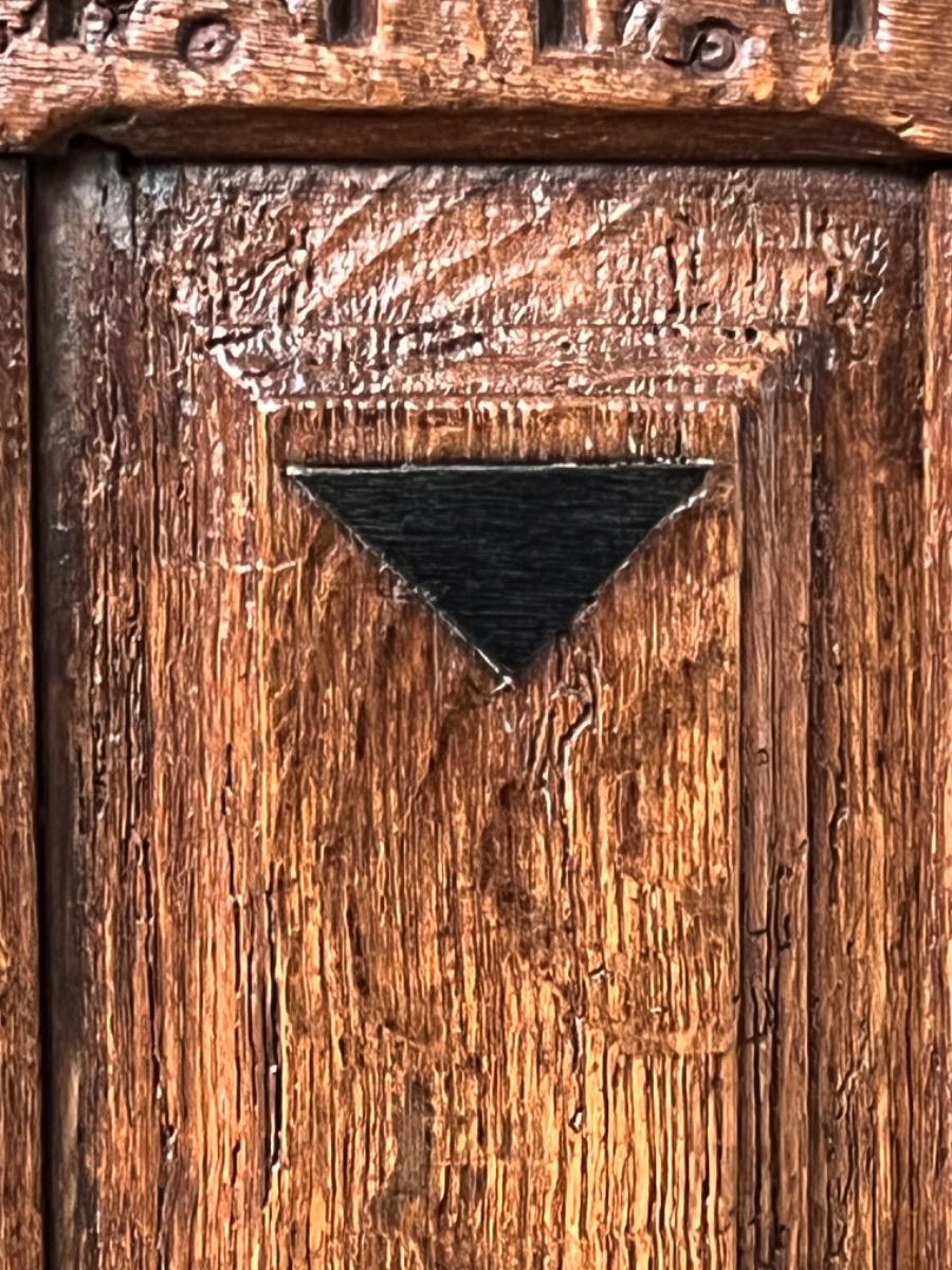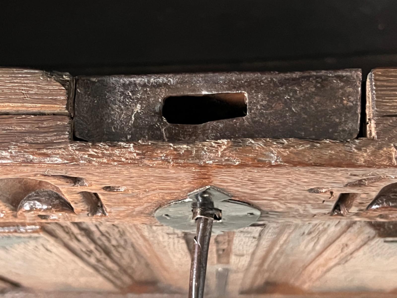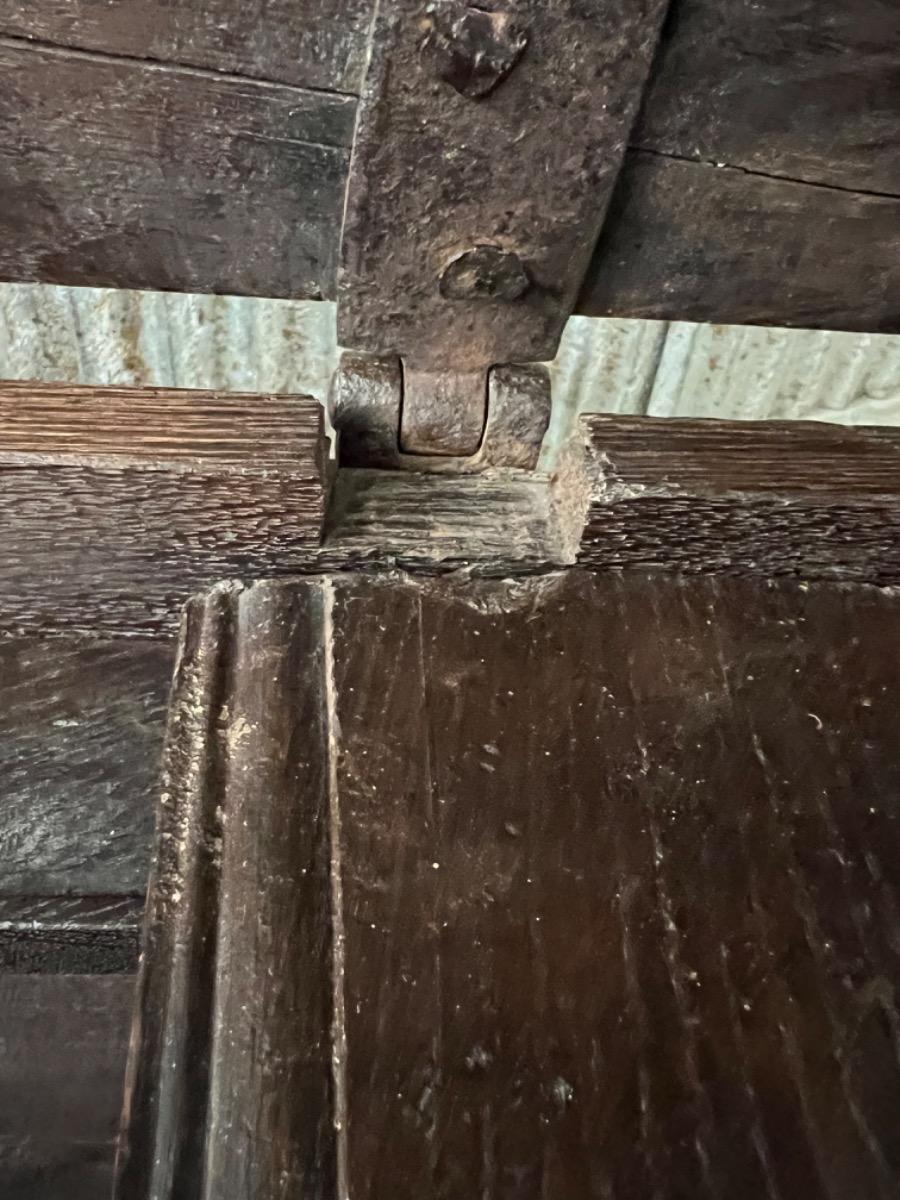 Gemaakt van enkele eikenhouten planken en panelen. Geen zwaluwstaarten maar houten pennen. Oorspronkelijk zwart hout ingelegd.