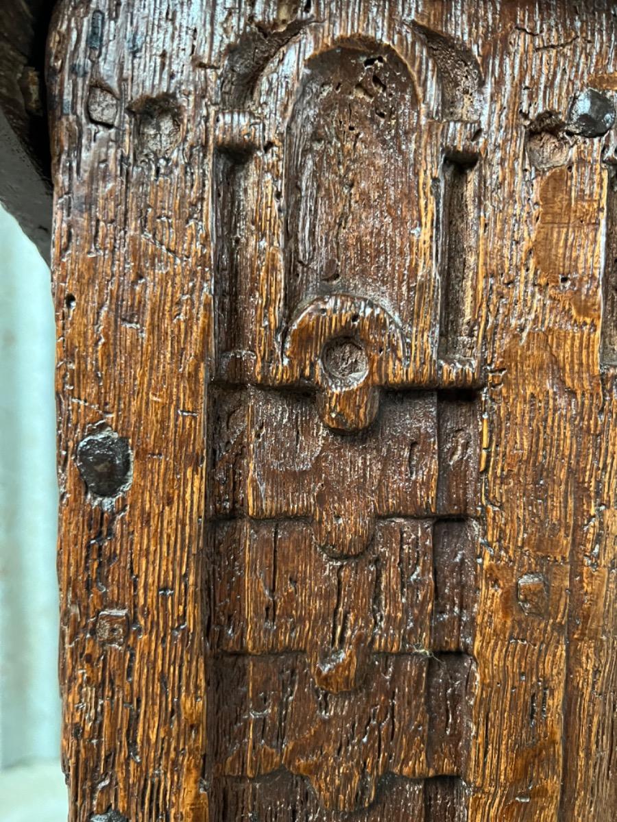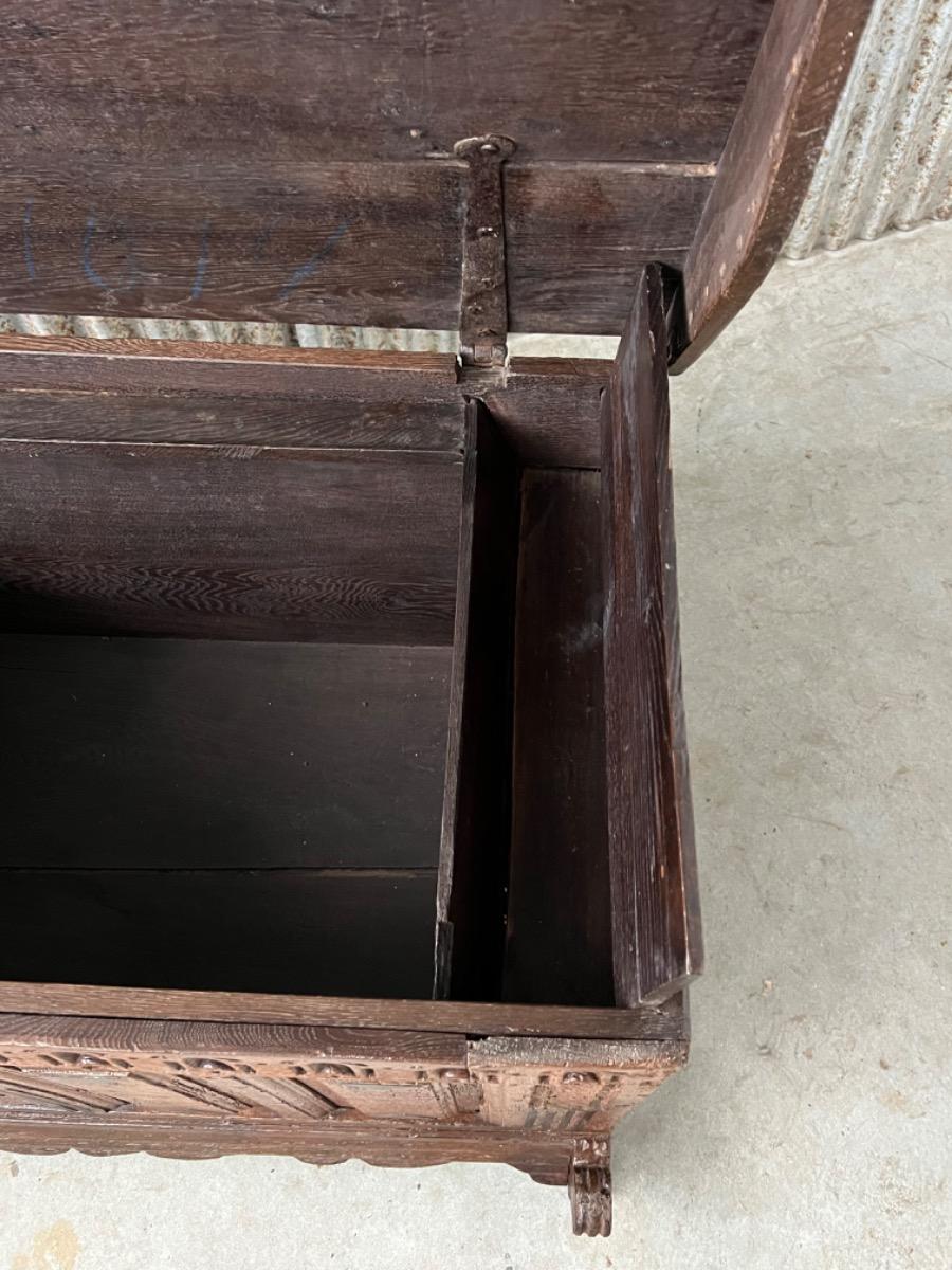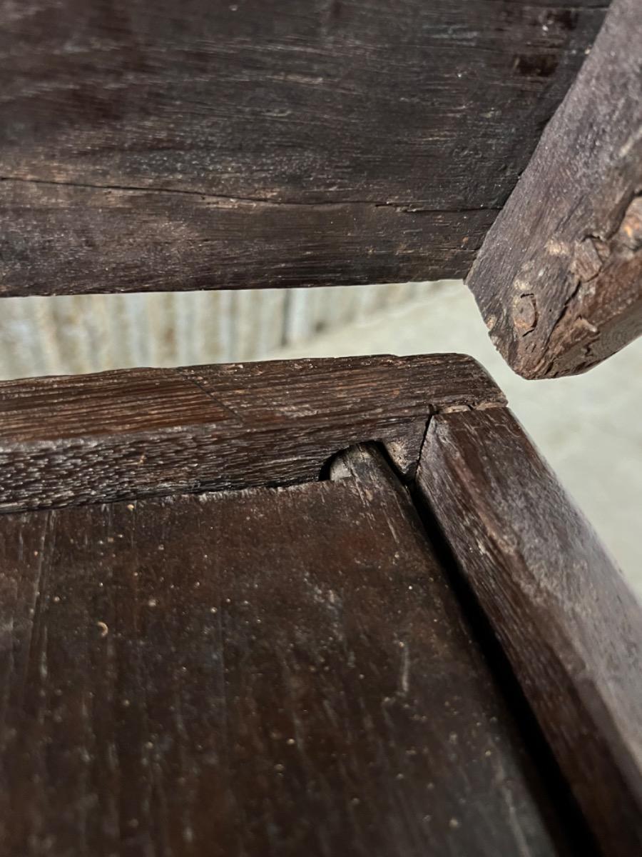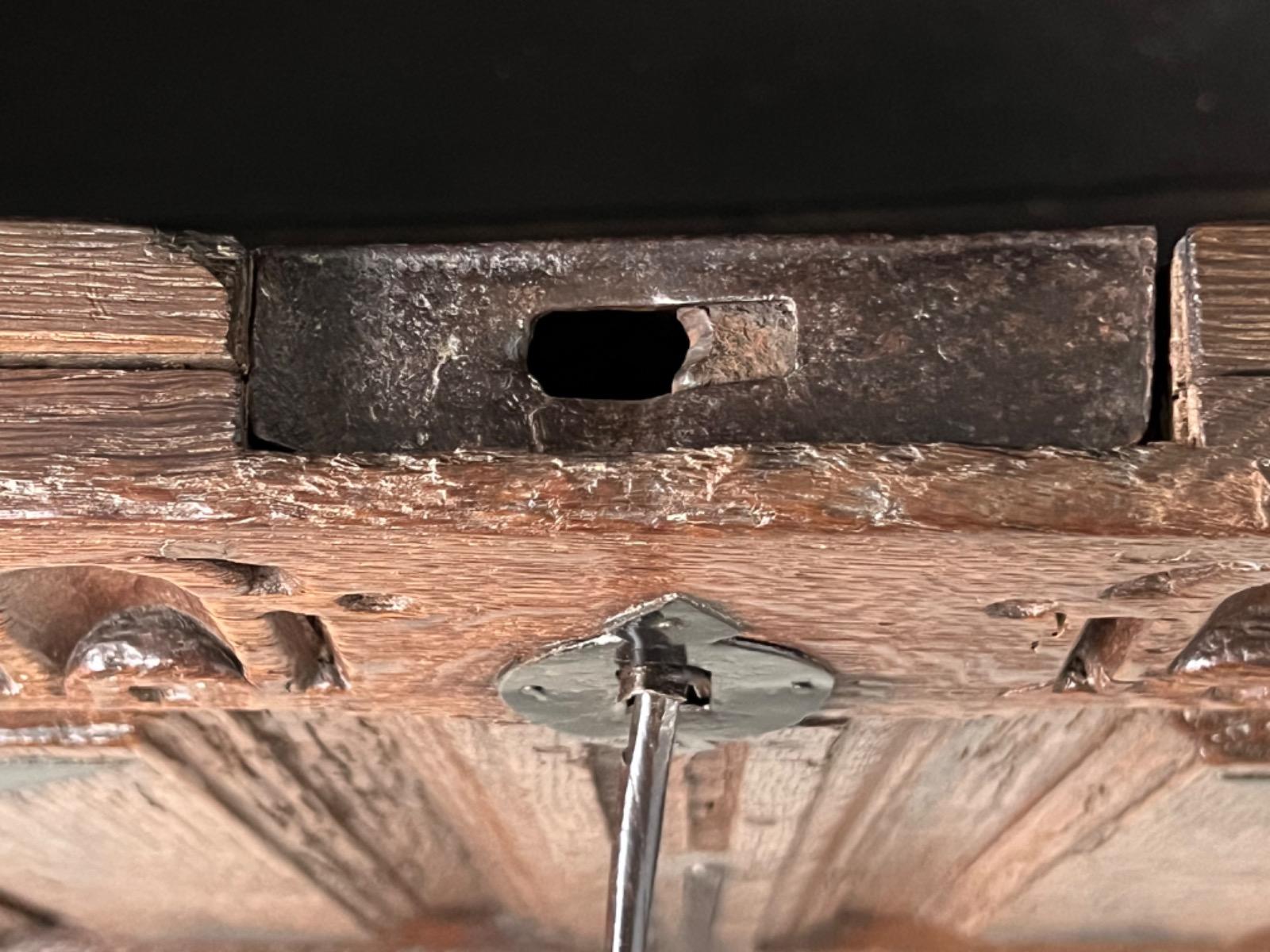Gemaakt van enkele eikenhouten planken en panelen. Geen zwaluwstaarten maar houten pennen. Oorspronkelijk zwart hout ingelegd.