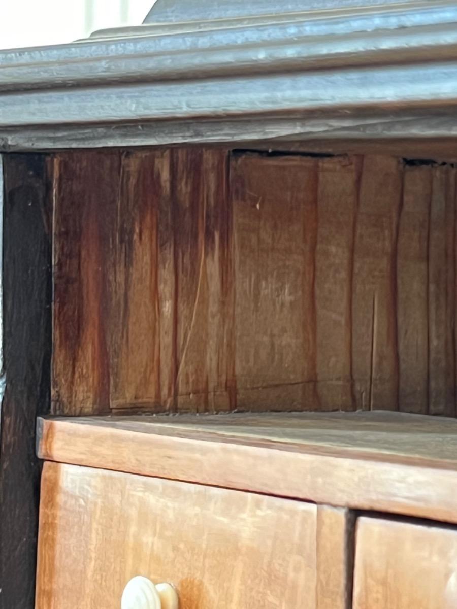 Onlangs grondig nagelopen op losse delen van constructie en fineer. Geen active houtworm aangetroffen op 14/6/2024