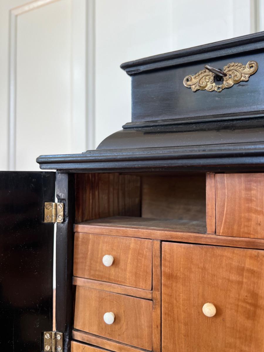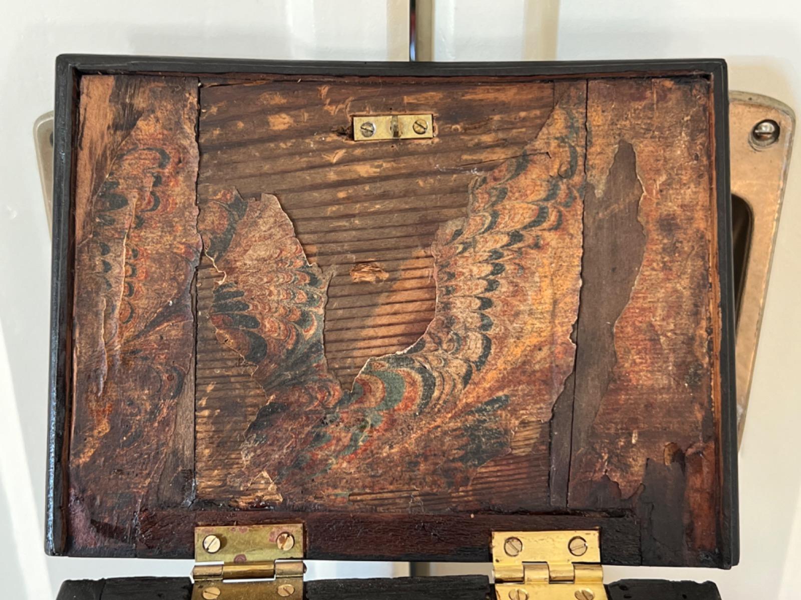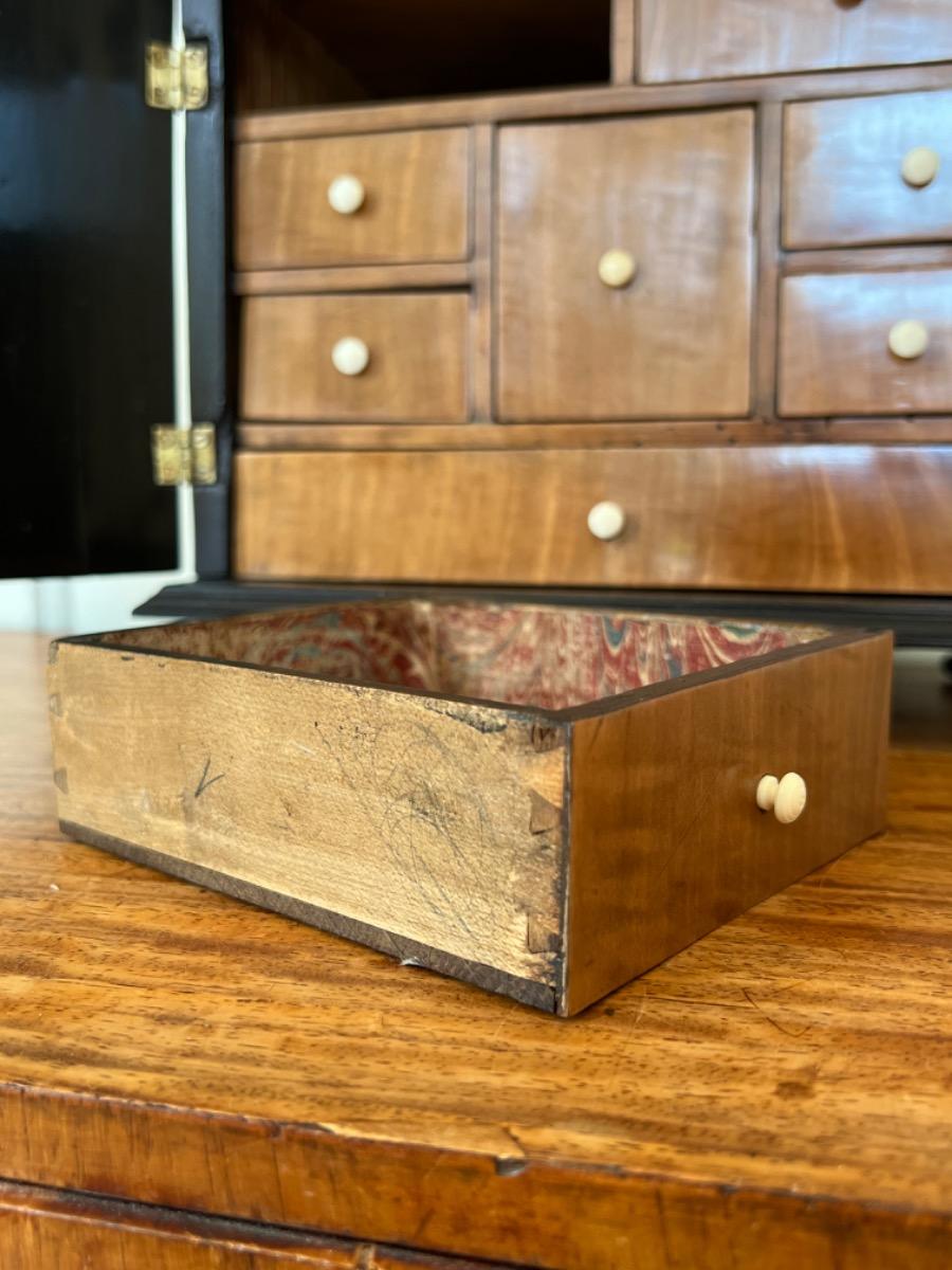 Oorspronkelijk gemarmerd papier in de laden en boven compartiment.