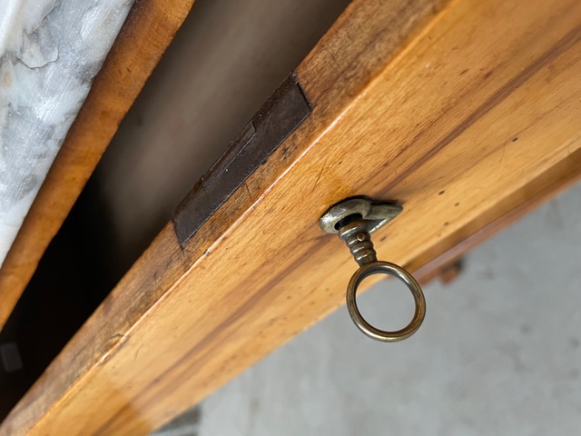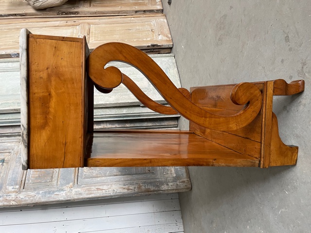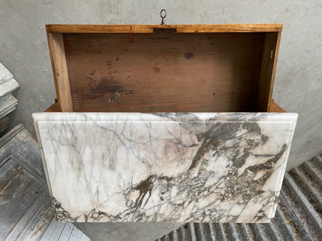 Kersenhouten trumeau met dik mamer en lade. Bianca carrara hardsteen id dik en gecontouneerd op de drie zicht kanten.