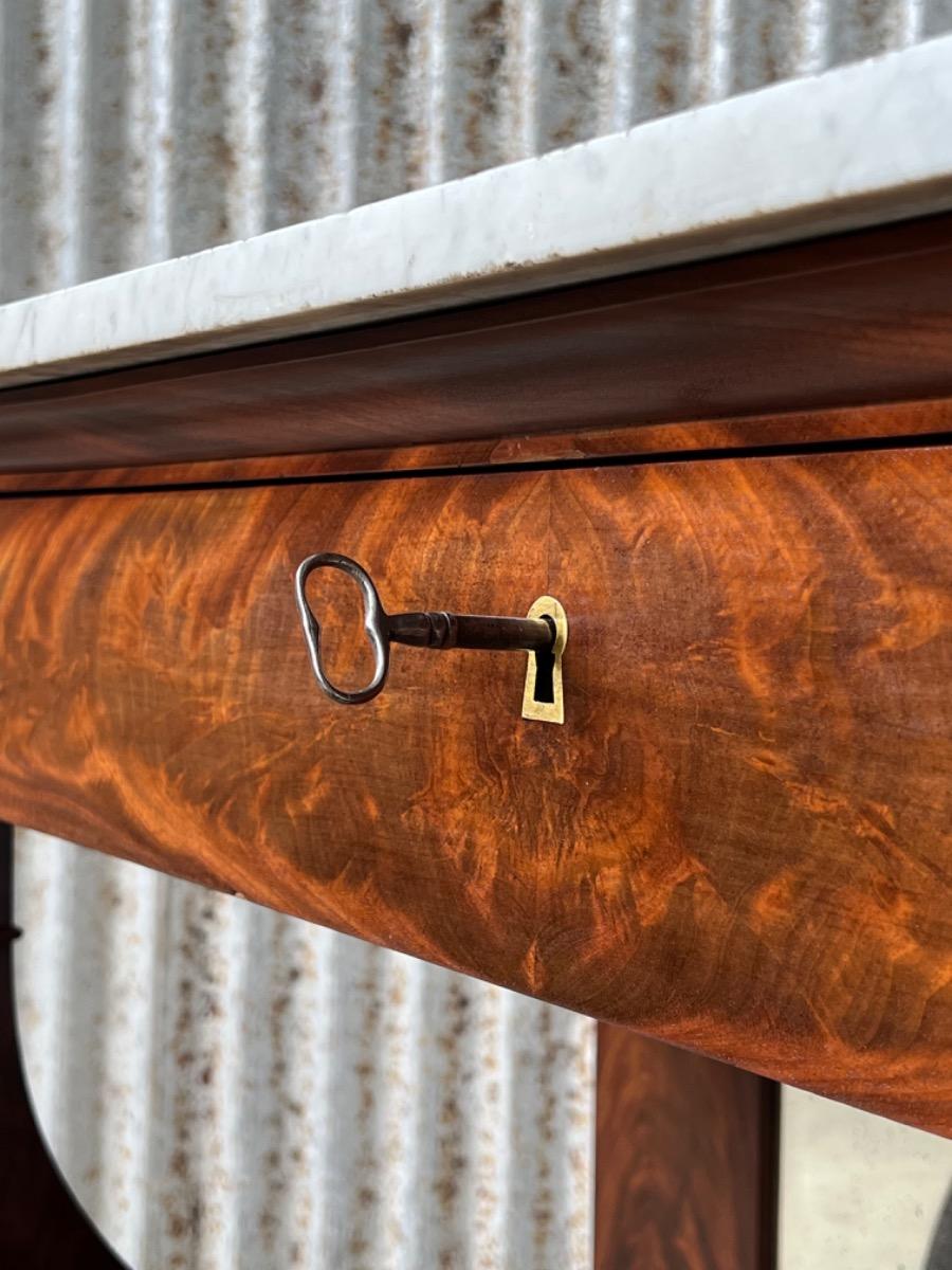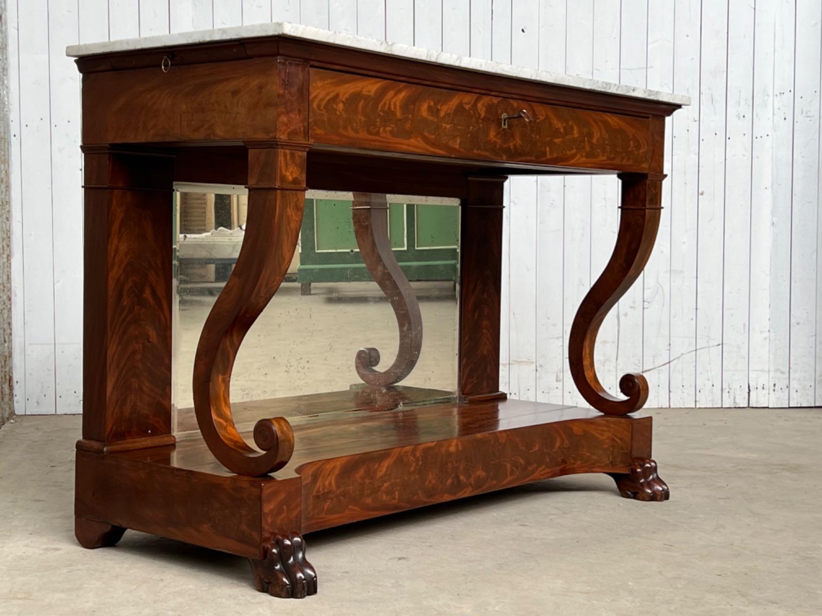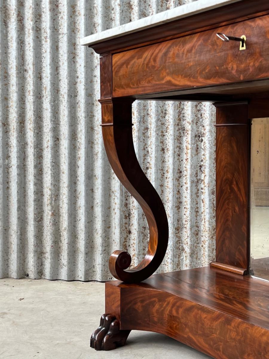 Mahonie consoletafel, trumeau met Bianca Carrara marmer en oorspronkelijk snijwerk.
