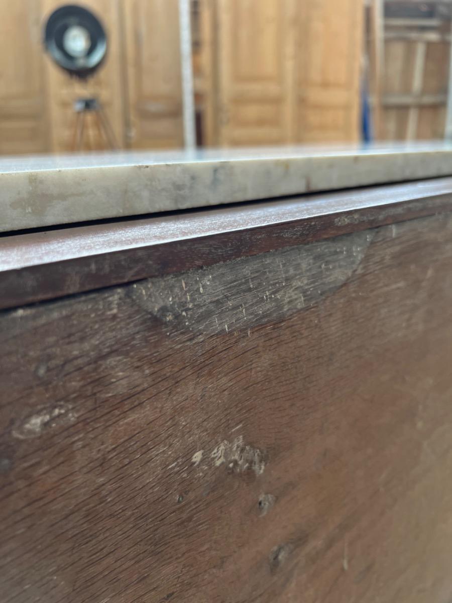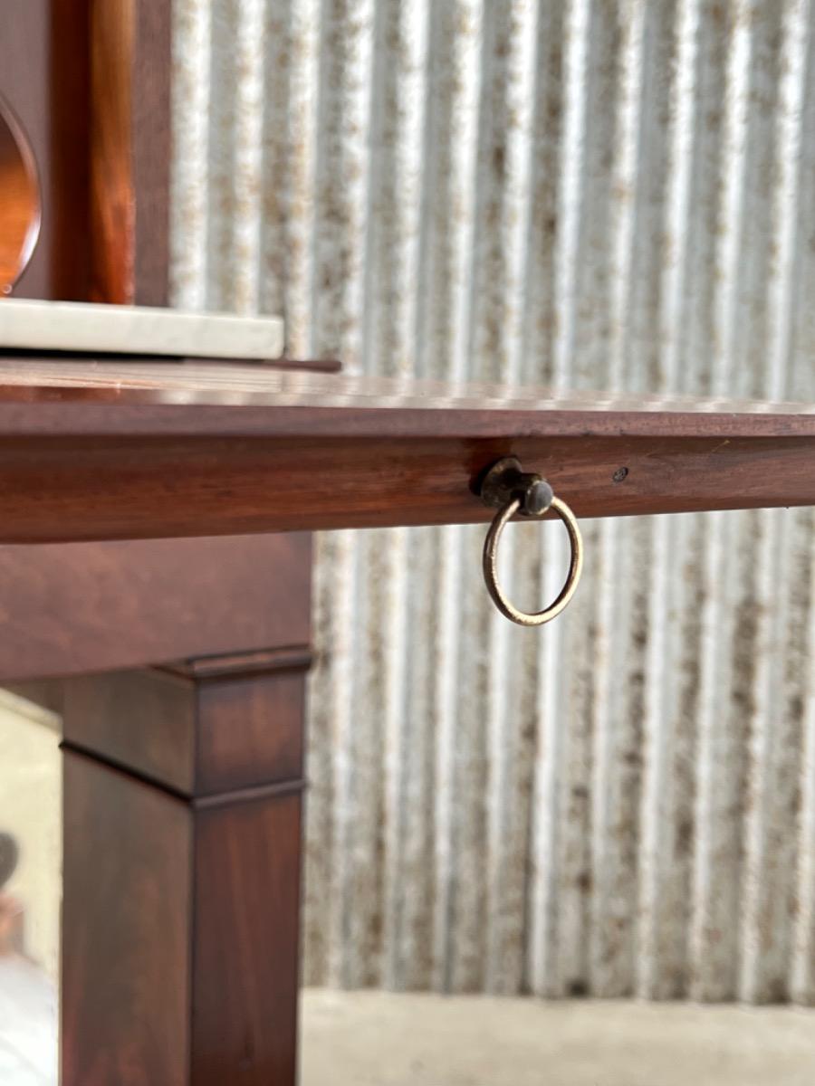 Diverse uittrek mogelijkheden, links en recht uittrek bladen en aan de achterzijde verticaal uittrek deel met drie ‘uitvalplankjes’ die onzichtbaar is als het marmer in standaard positie is. Marmer is eenvoudig weg te rollen m.b.v. ijzeren wieltjes. (Zie fotos)