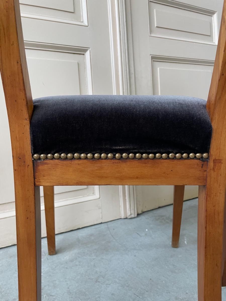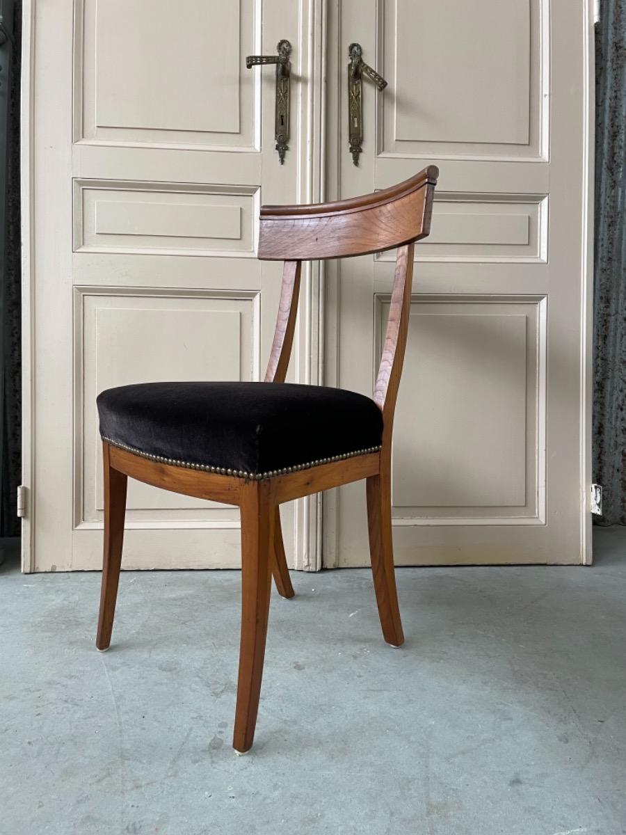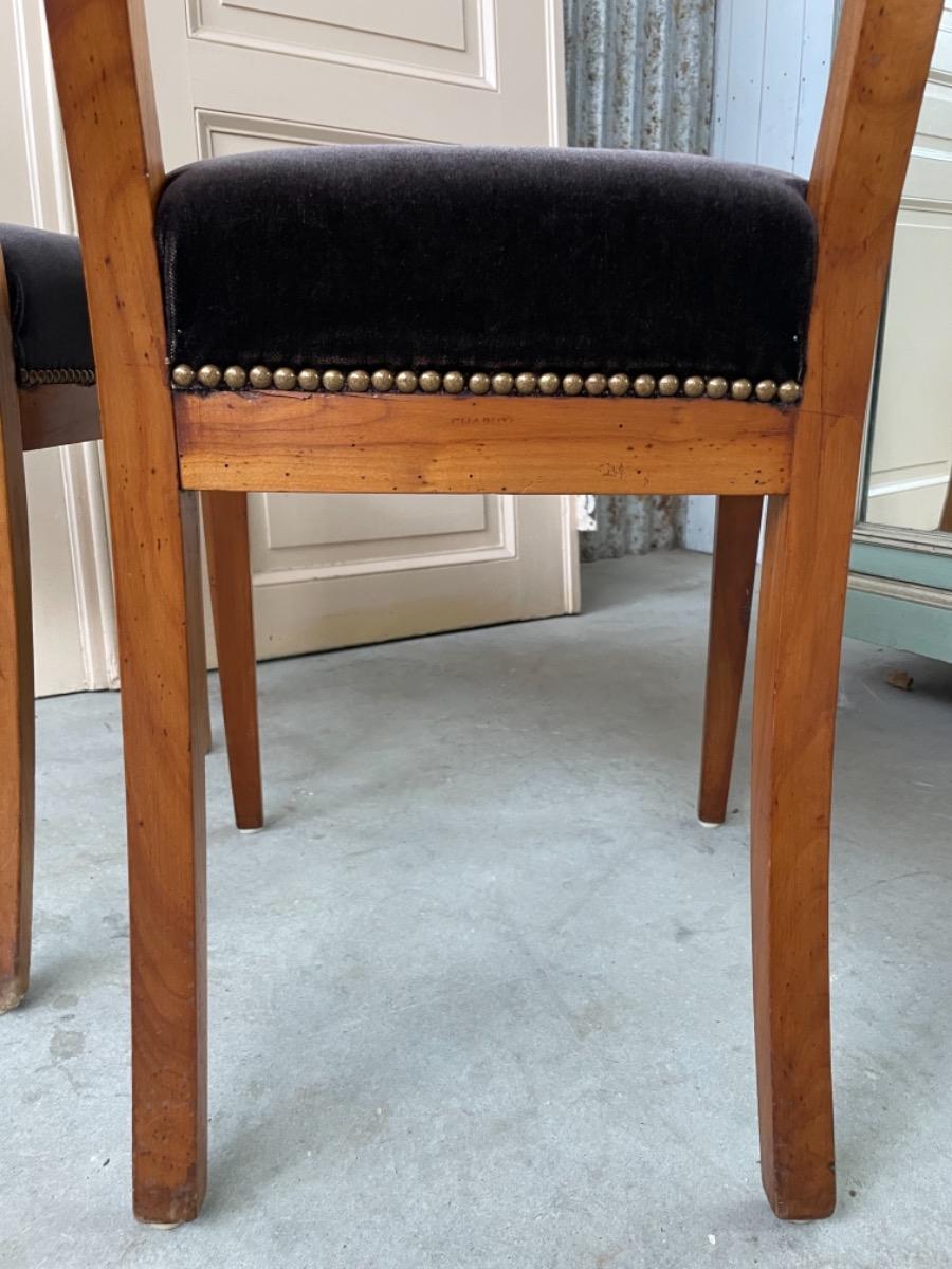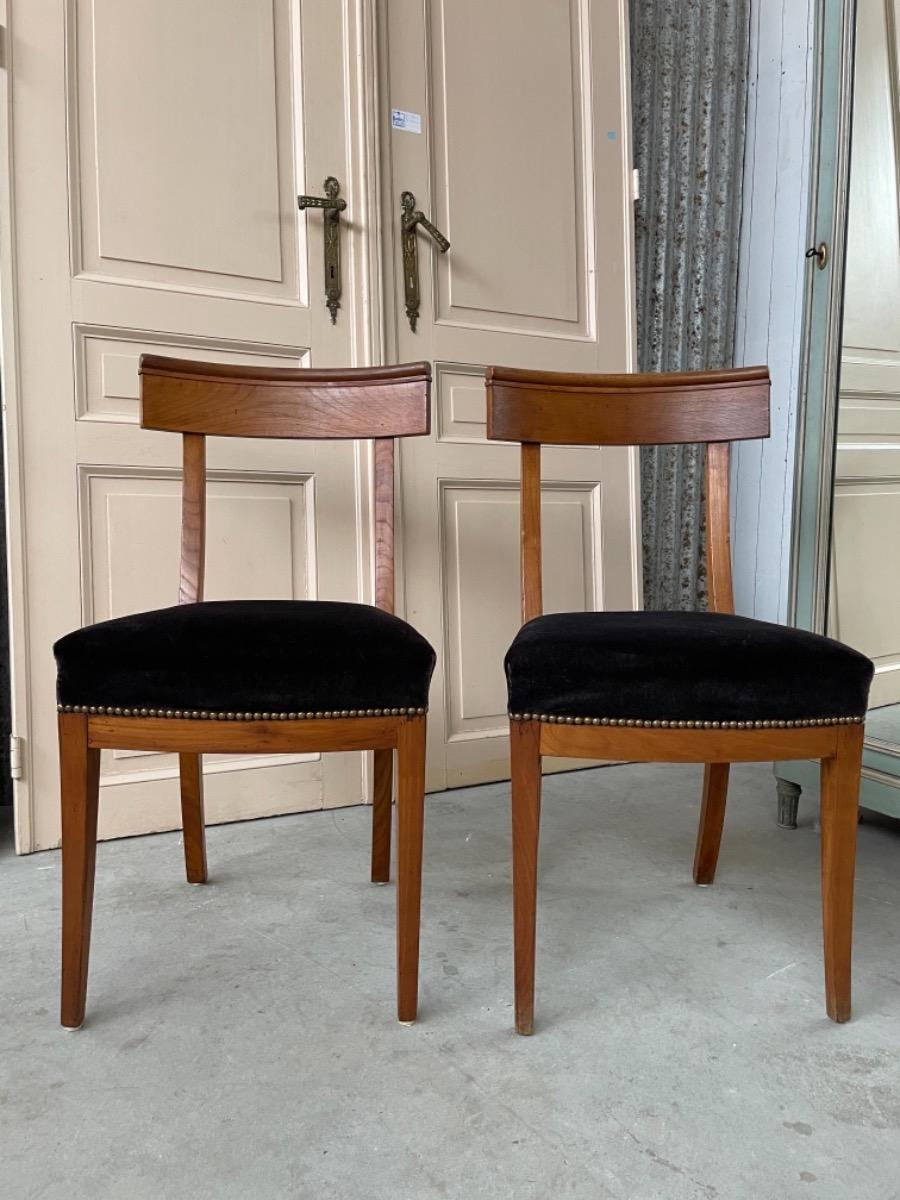 Set van 2 Chapuis (j.j.) kersenhouten stoelen. Sabelpoten met gebogen kap regel. Bekleed met zware kwaliteit zwart velours. Normale zithoogte.