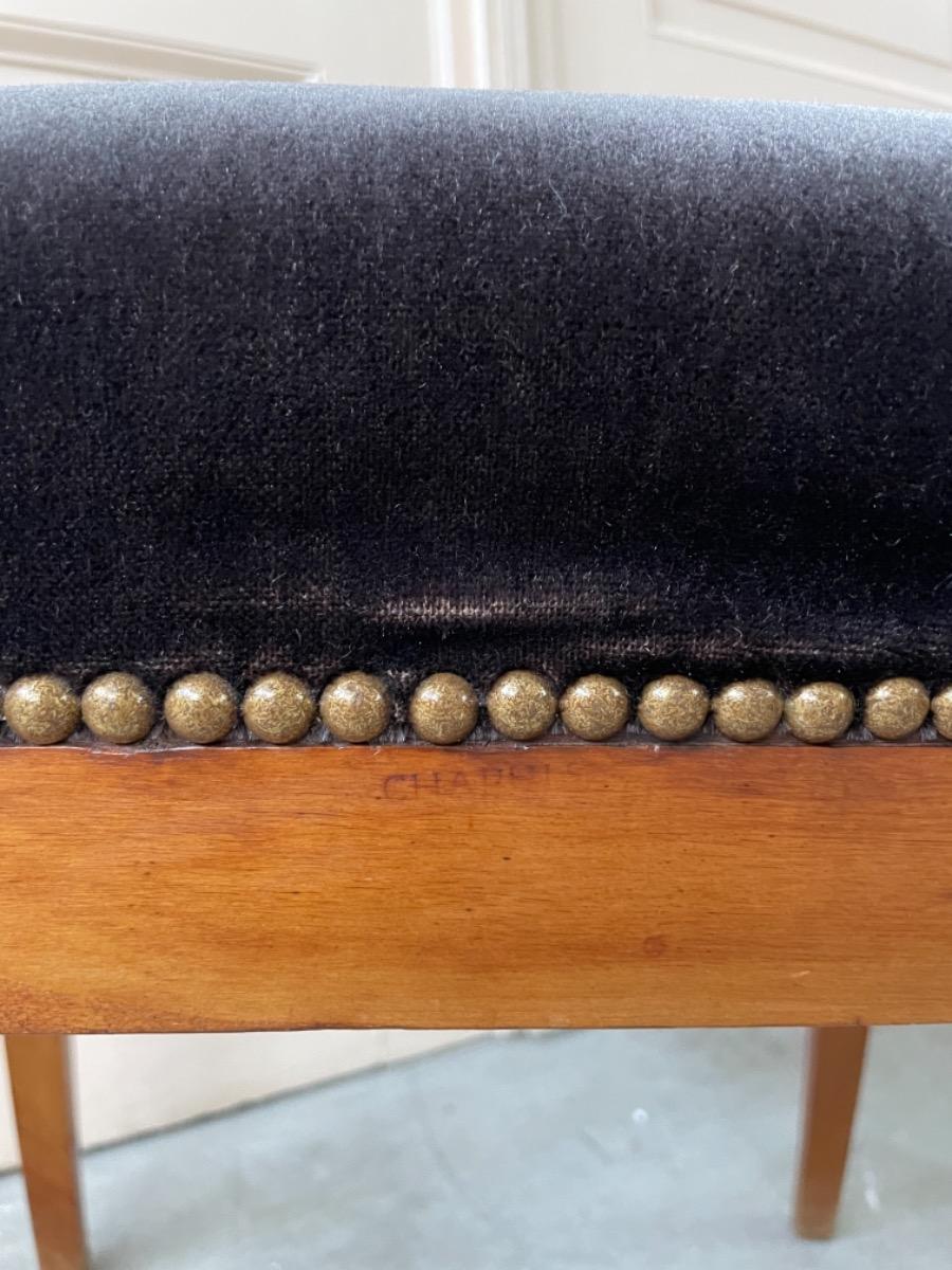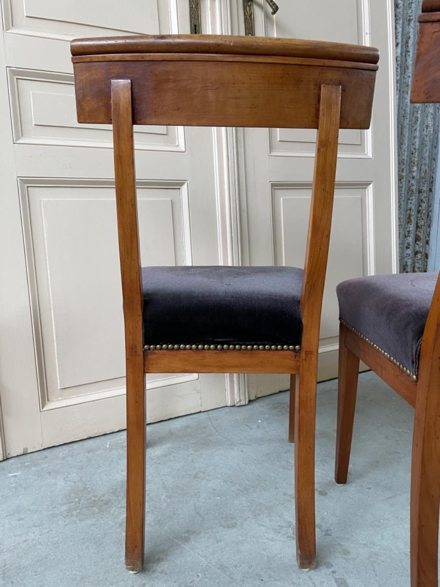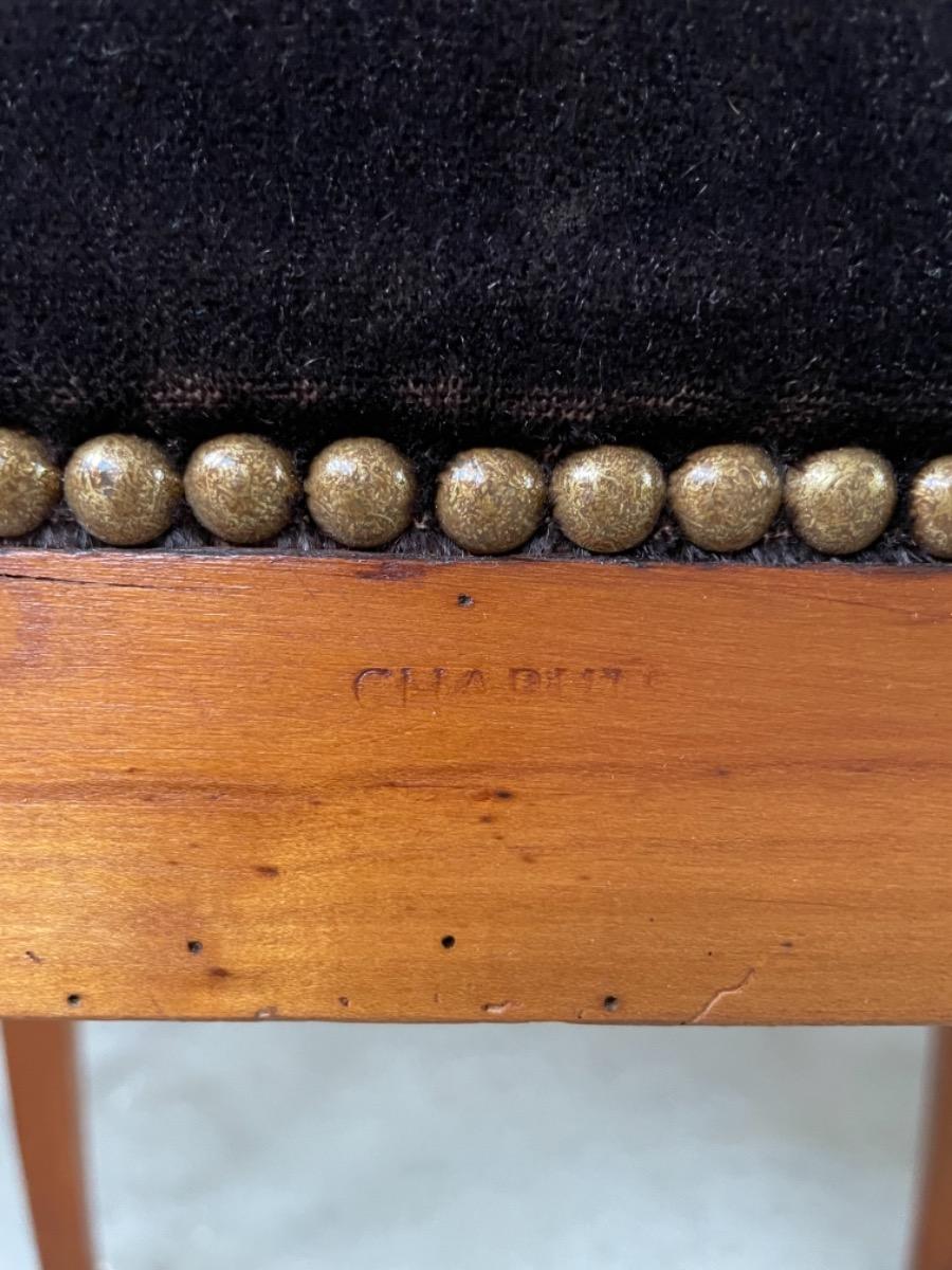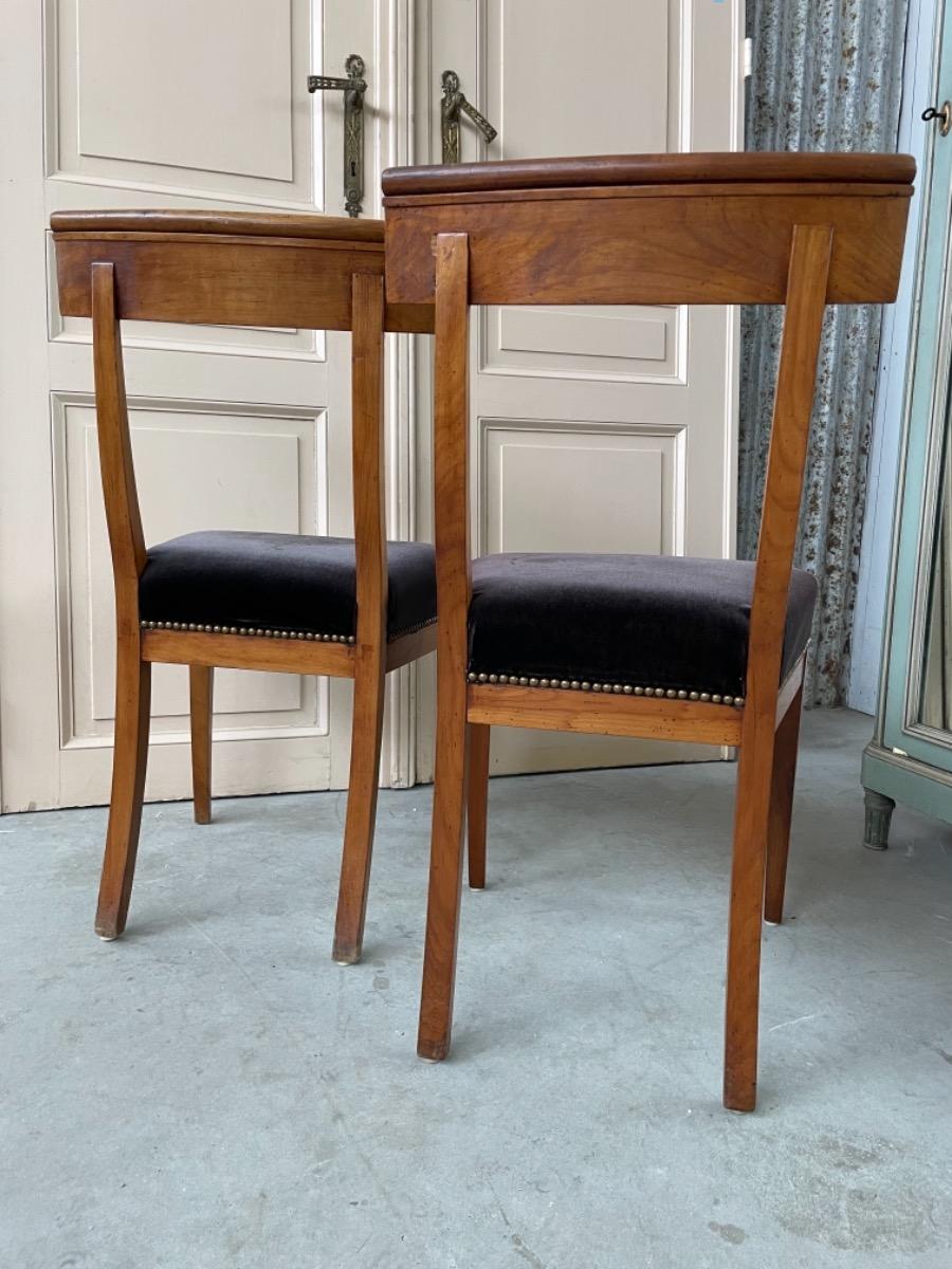 Set van 2 Chapuis (j.j.) kersenhouten stoelen. Sabelpoten met gebogen kap regel. Bekleed met zware kwaliteit zwart velours. Normale zithoogte.